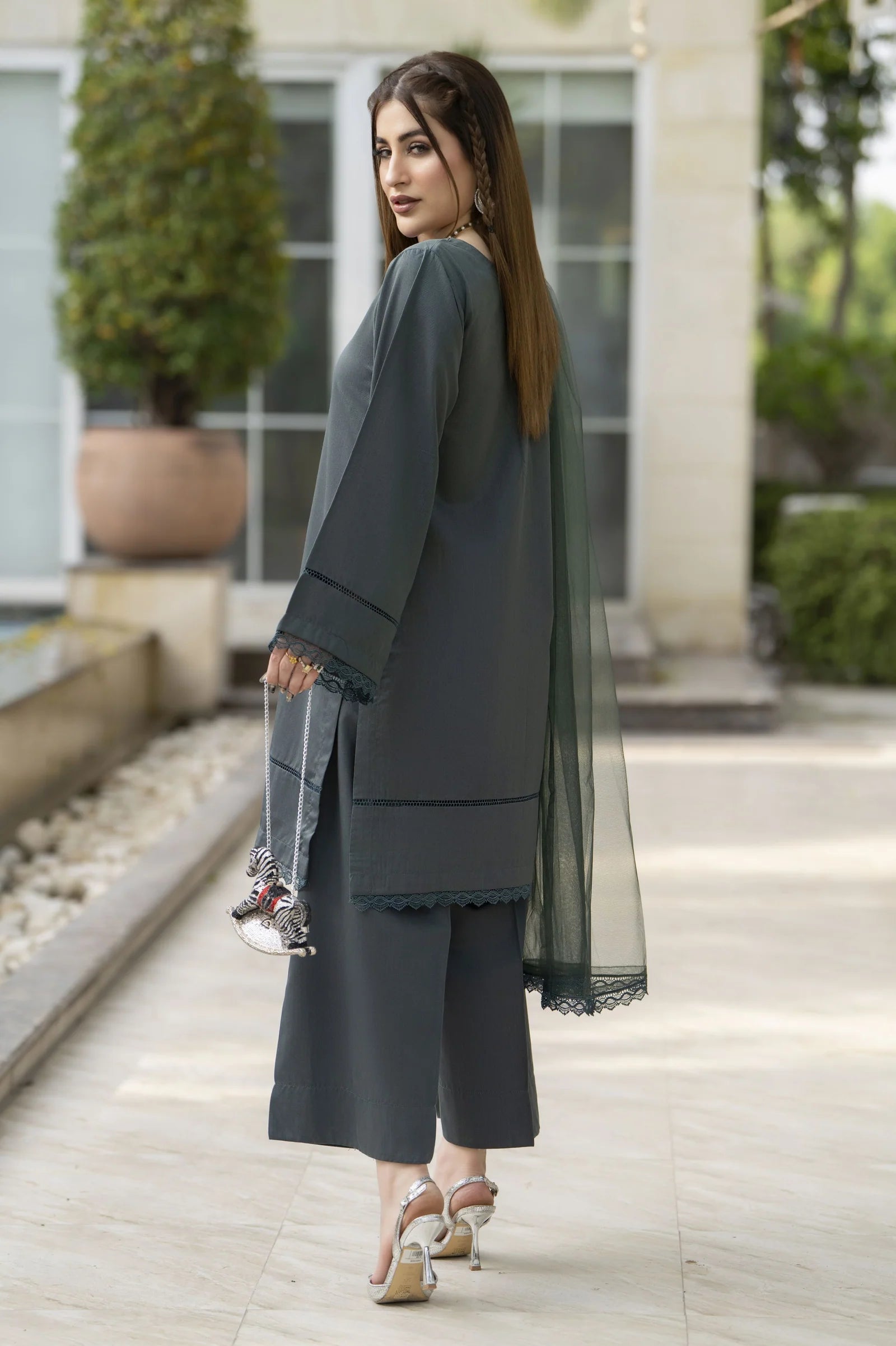 Complete your winter edit with this classic 3-piece suit from Simply Warm by Aabpara. Featuring a poly linen shirt and trousers for cosy comfort, paired with a dyed net dupatta for a graceful finish, this outfit blends practicality with timeless style. A reliable choice for women who prefer simplicity without compromising elegance.