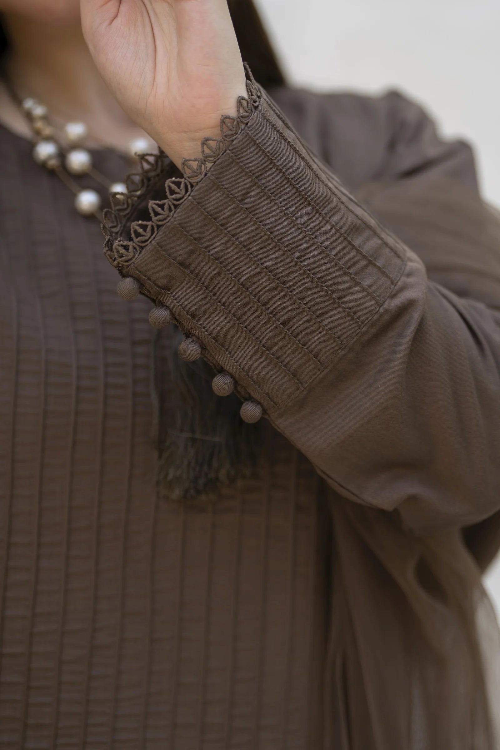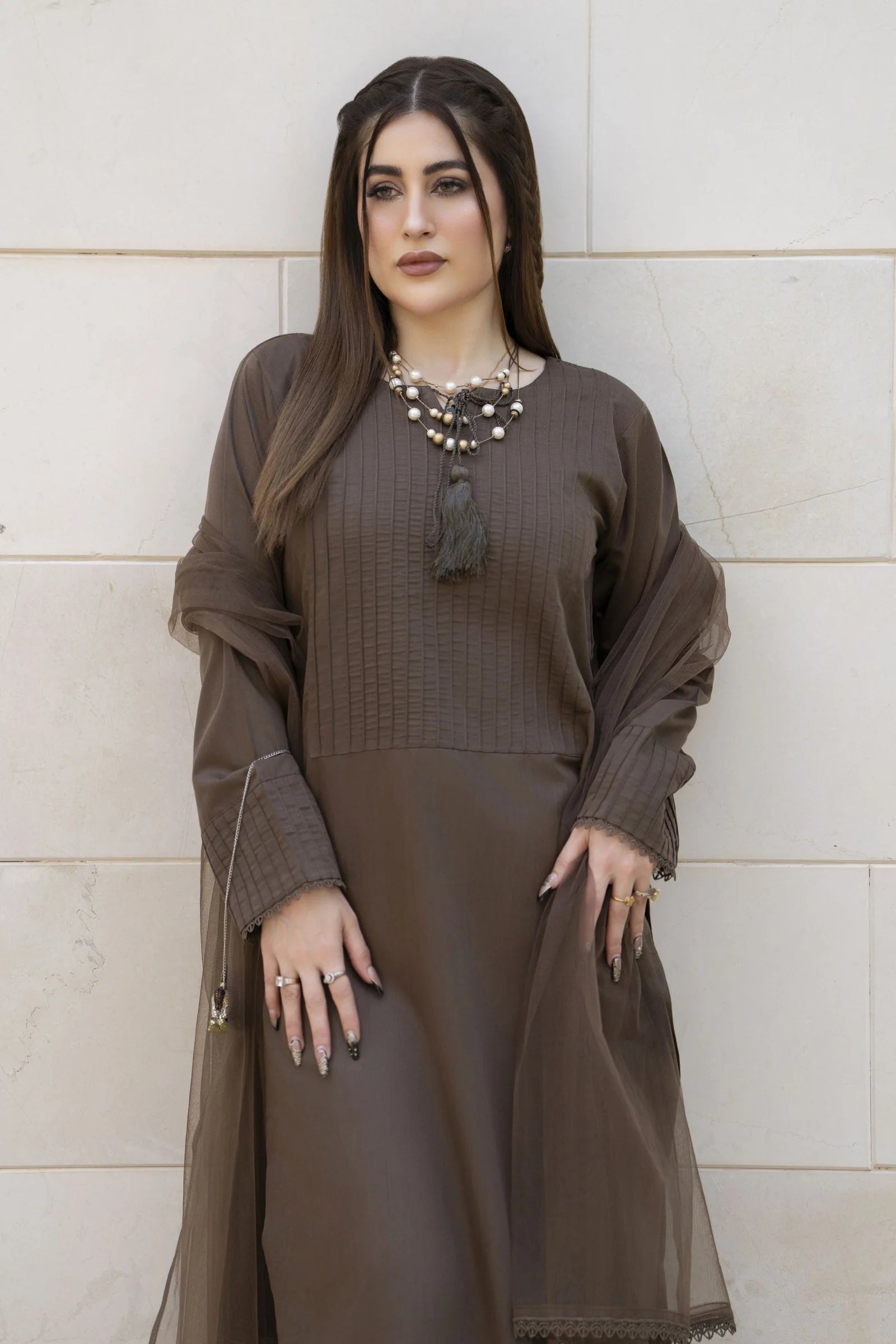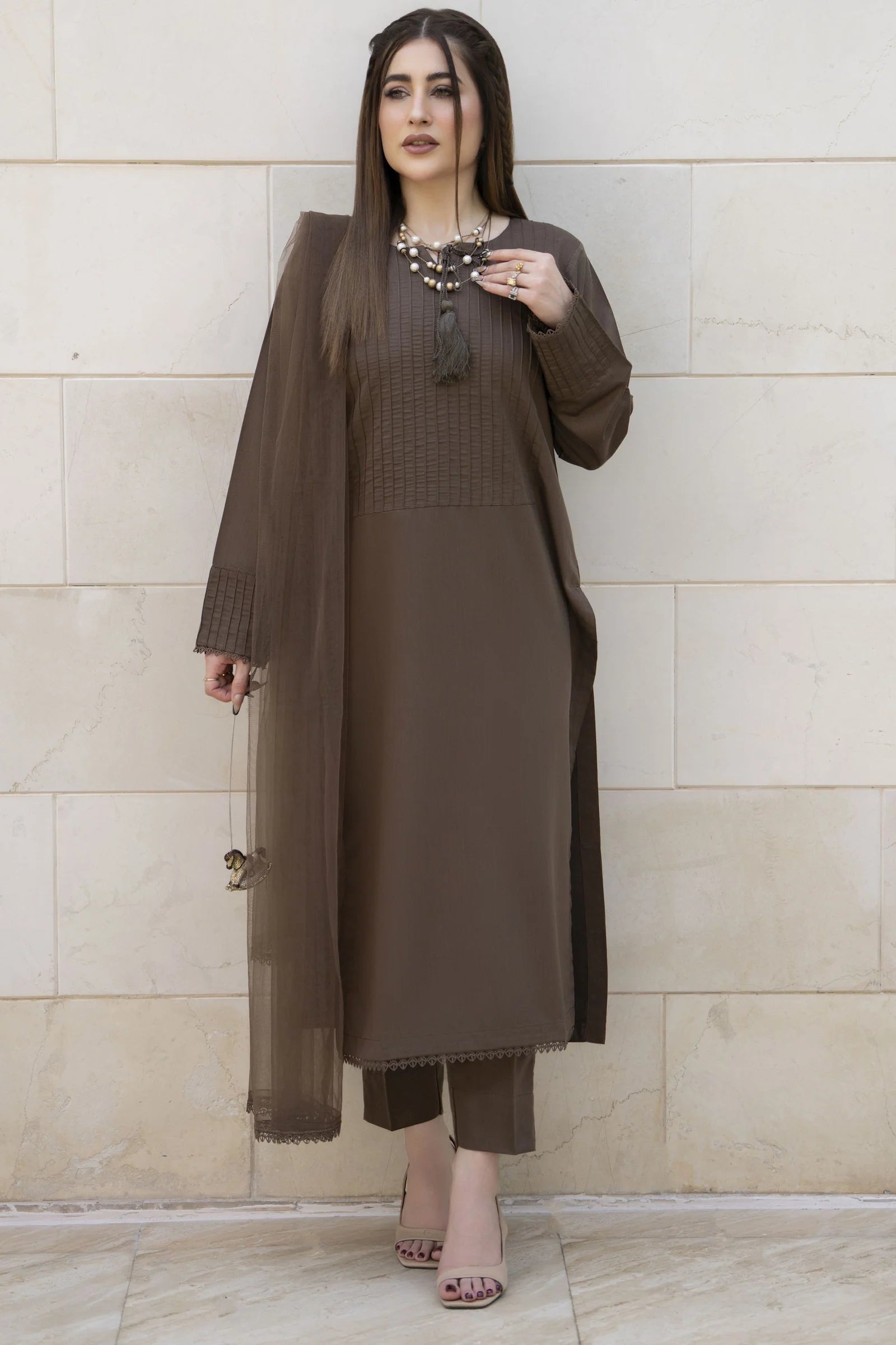 Embrace everyday elegance with this smart 3-piece suit from Simply Warm by Aabpara. Designed in poly linen for lasting comfort, the shirt and trousers deliver a refined winter look, while the dyed net dupatta adds a delicate and graceful finish. A versatile outfit that pairs style with practicality for the season.