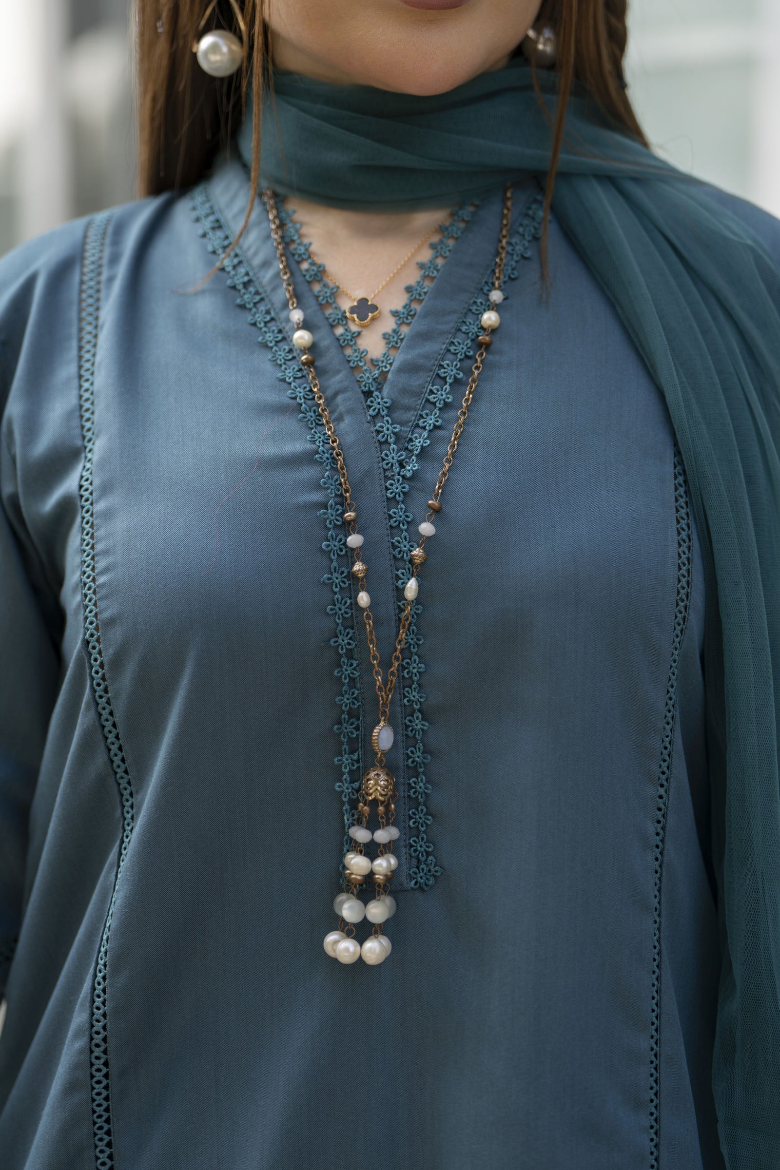 Bring comfort and class together with this 3-piece suit from Simply Warm by Aabpara. The fine poly linen shirt and trousers are tailored for easy wear through the winter, while the dyed net dupatta adds a soft, feminine layer to complete the look. A practical yet stylish outfit to carry you through the season with ease.