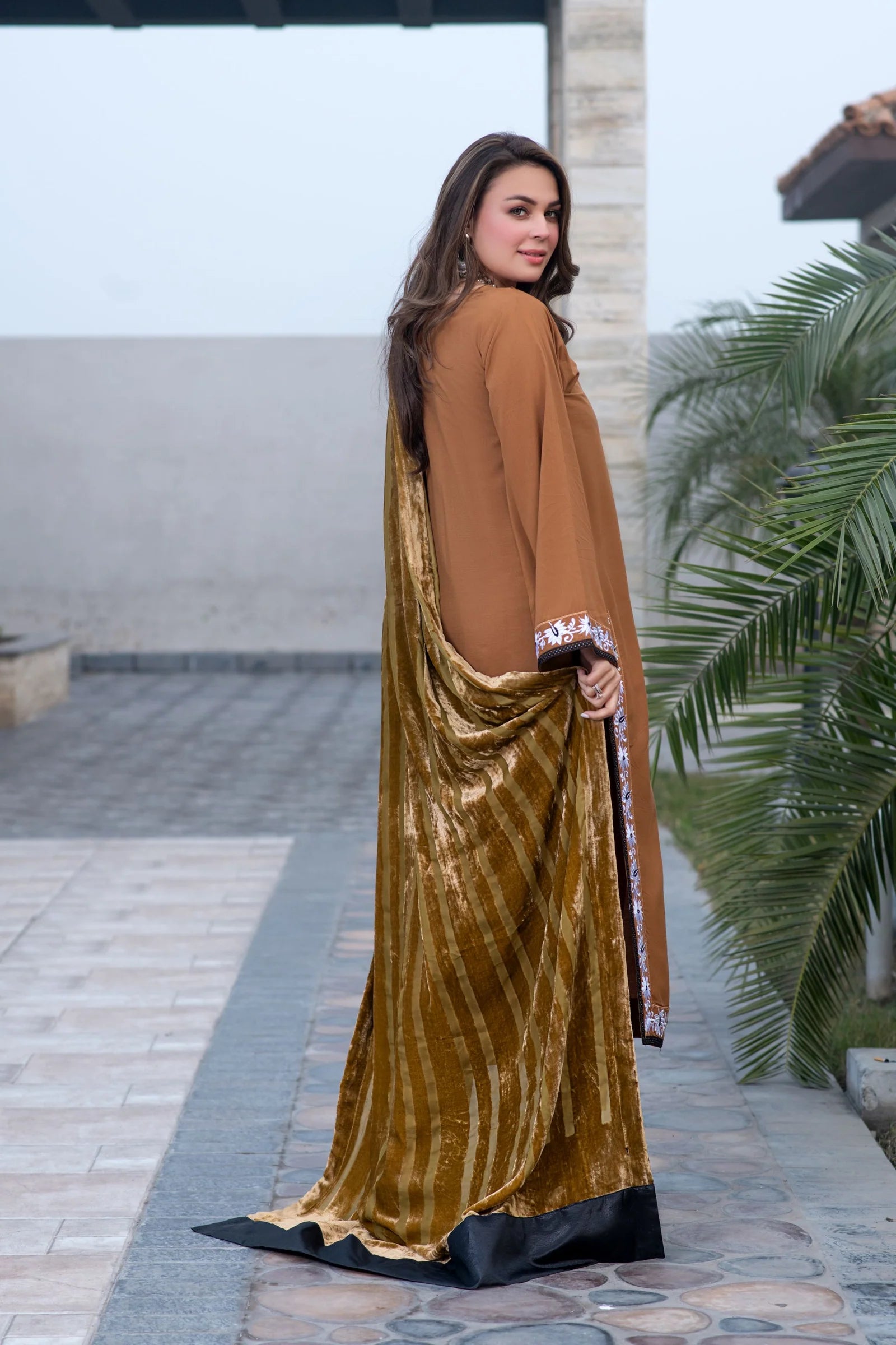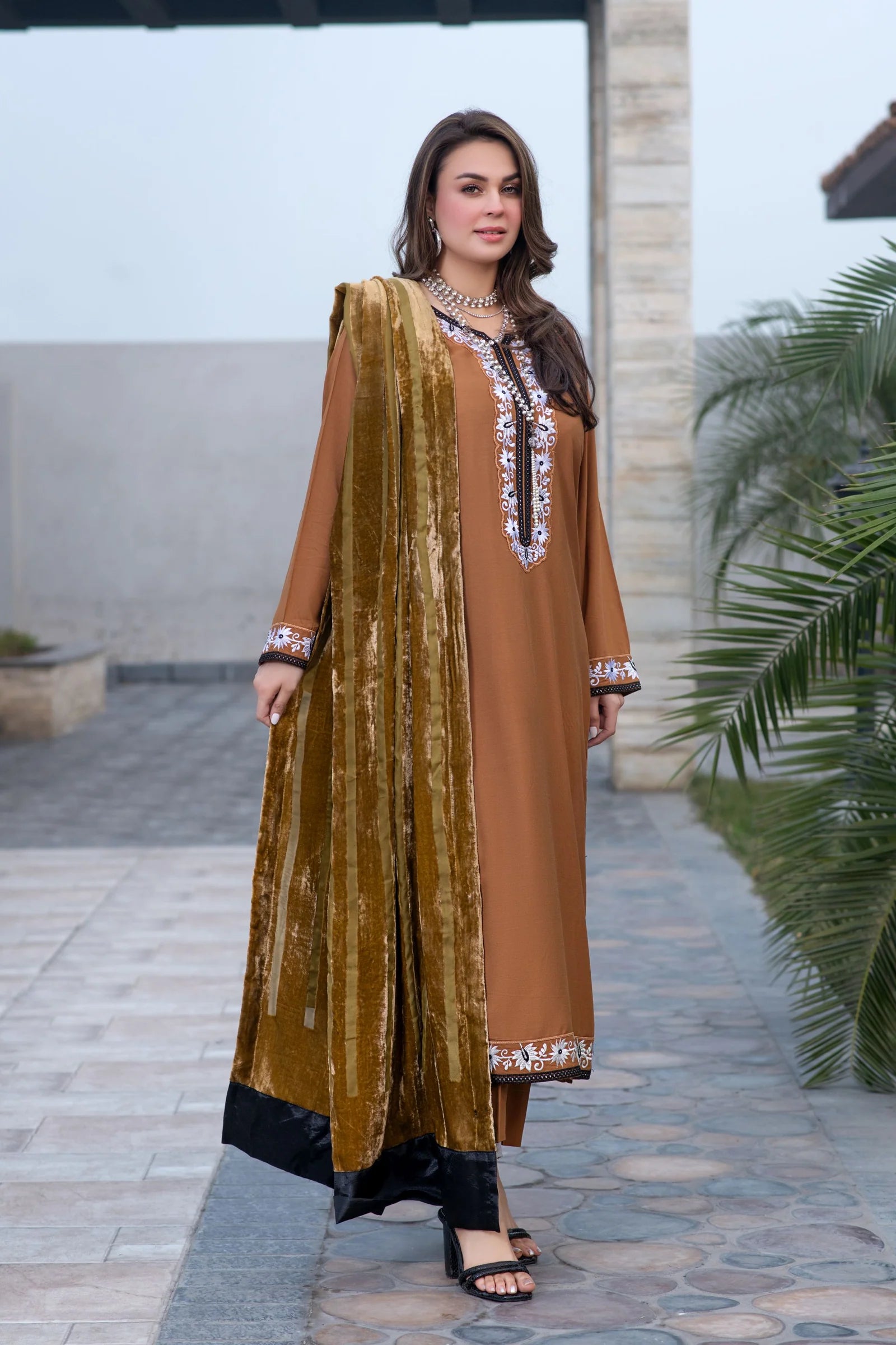 The soft linen fabric offers comfort and breathability, while the embroidered detailing adds a graceful, feminine touch. The Palachi shawl completes the look with a rich winter feel, making this outfit ideal for casual gatherings, day events, or elegant everyday wear during the colder months.