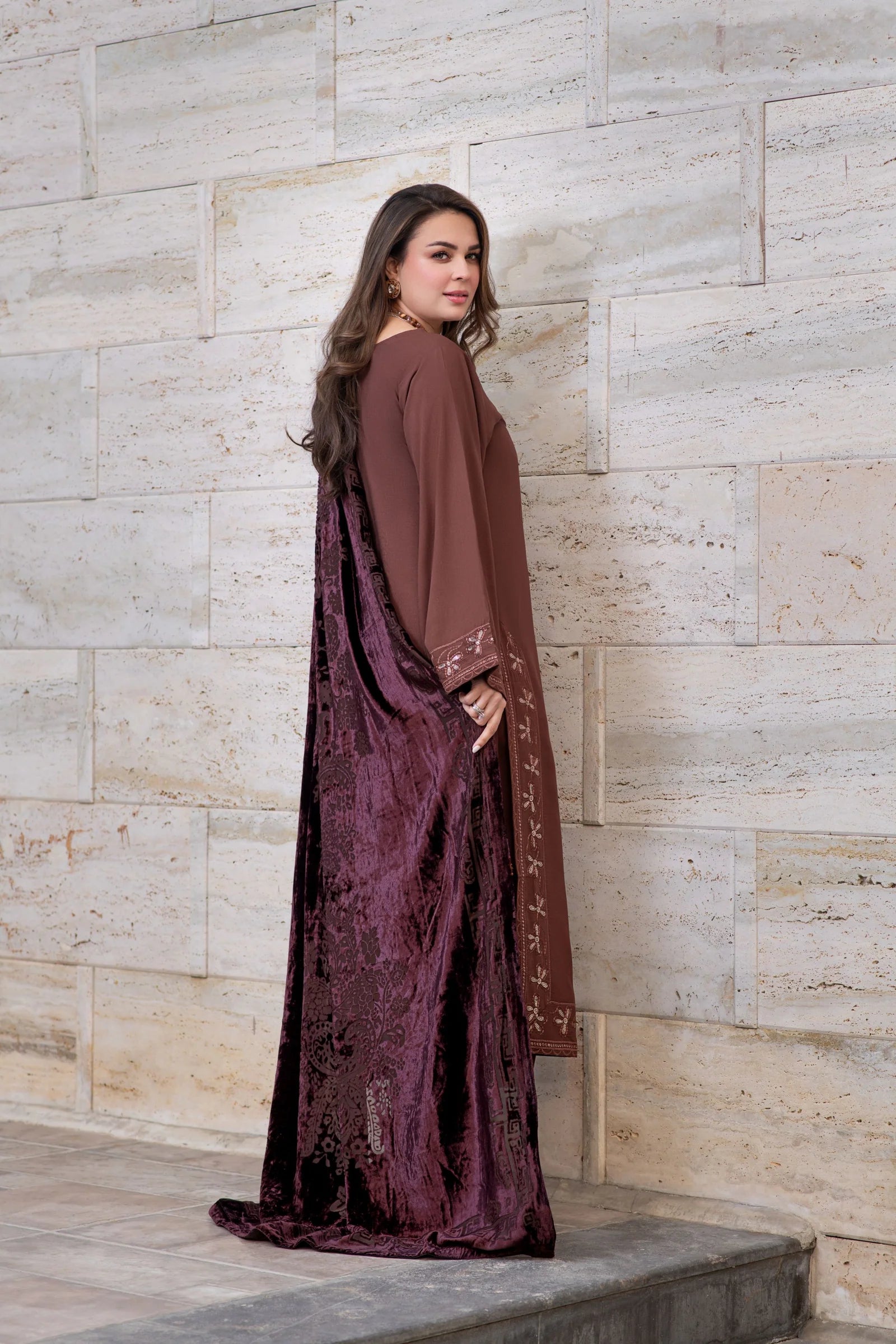 Zohra | Coffee Brown 3pc Ready to Wear Winter Dress with Palachi Shawl