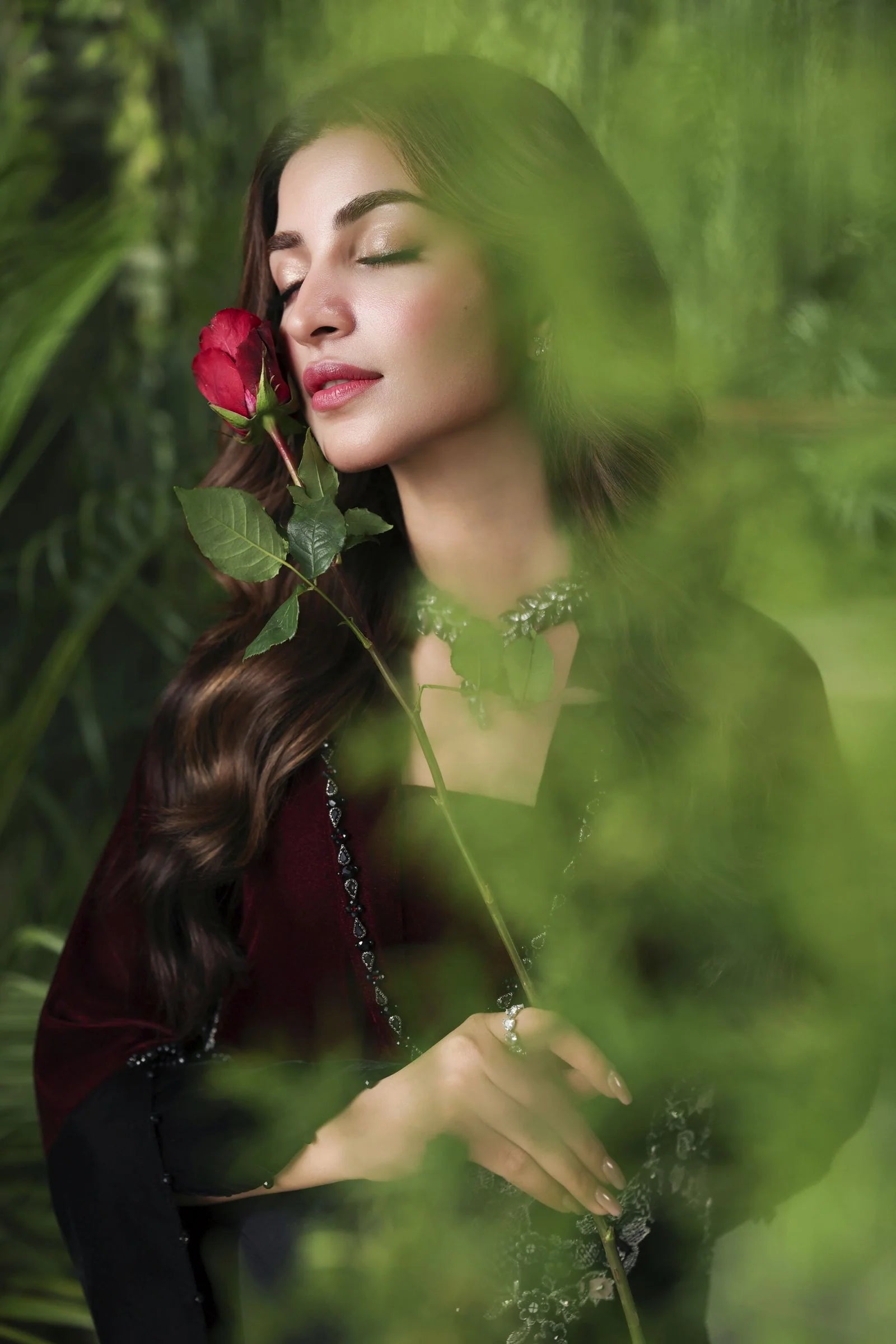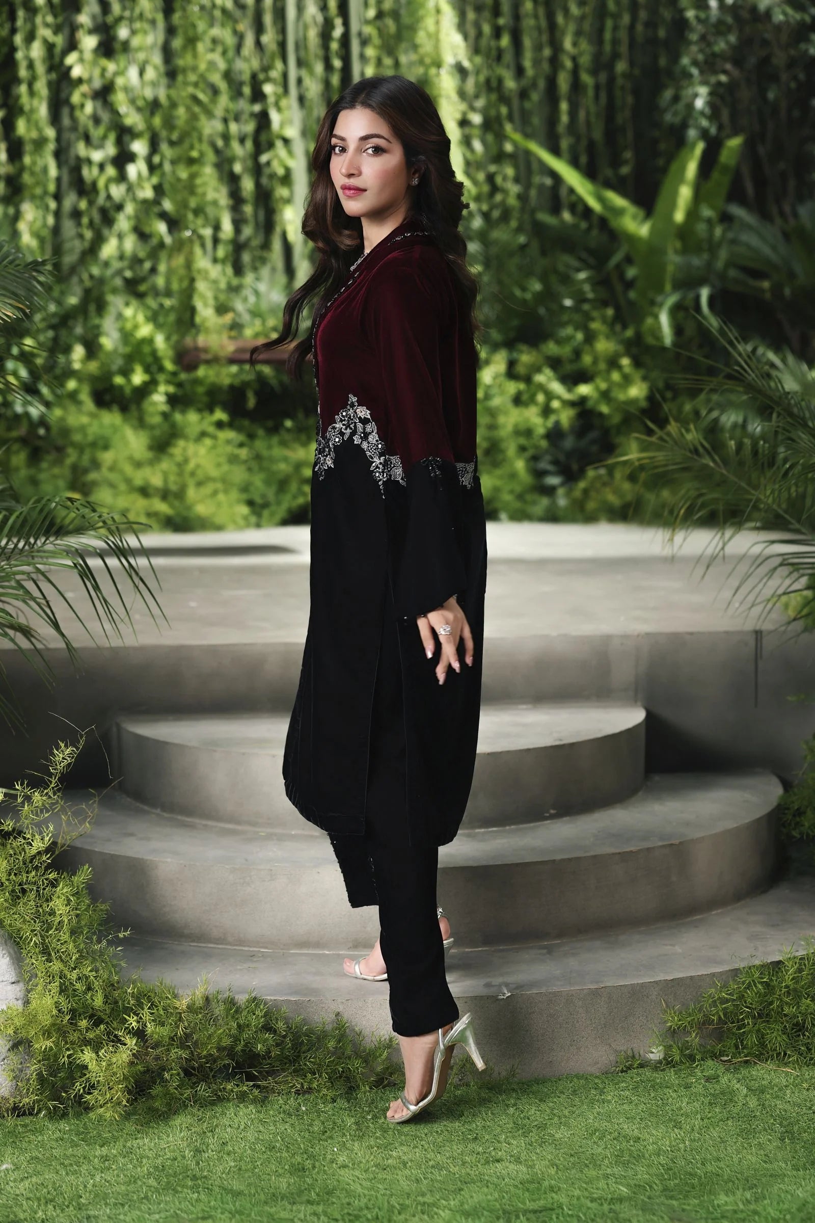 Paired with luxurious velvet trousers, enhanced with shimmering sequin embroidery and sparkling stone accents, this ensemble exudes contemporary opulence. Ideal for festive evenings and winter gatherings, it’s a true reflection of Ain’s signature sophistication and craftsmanship.