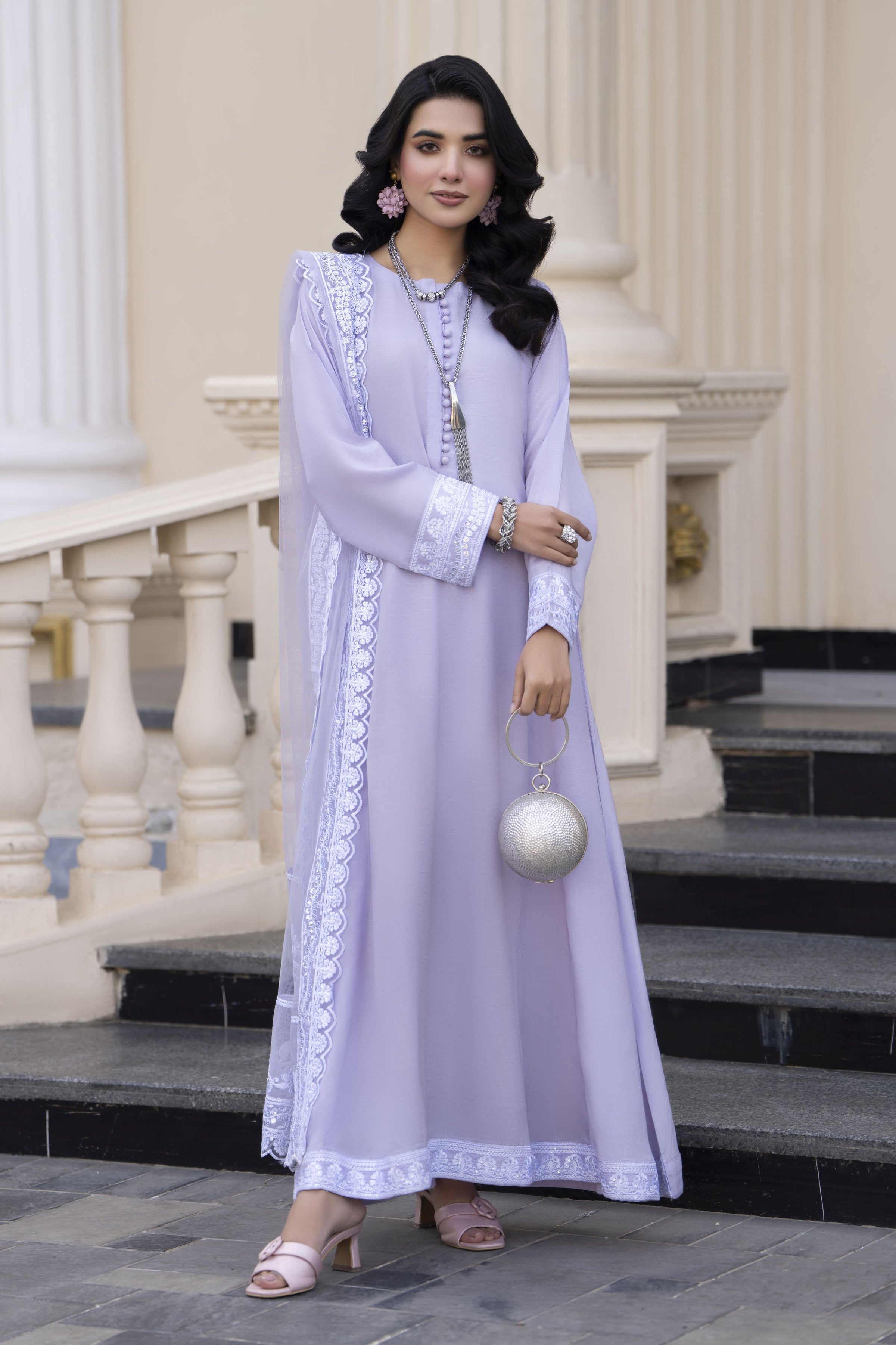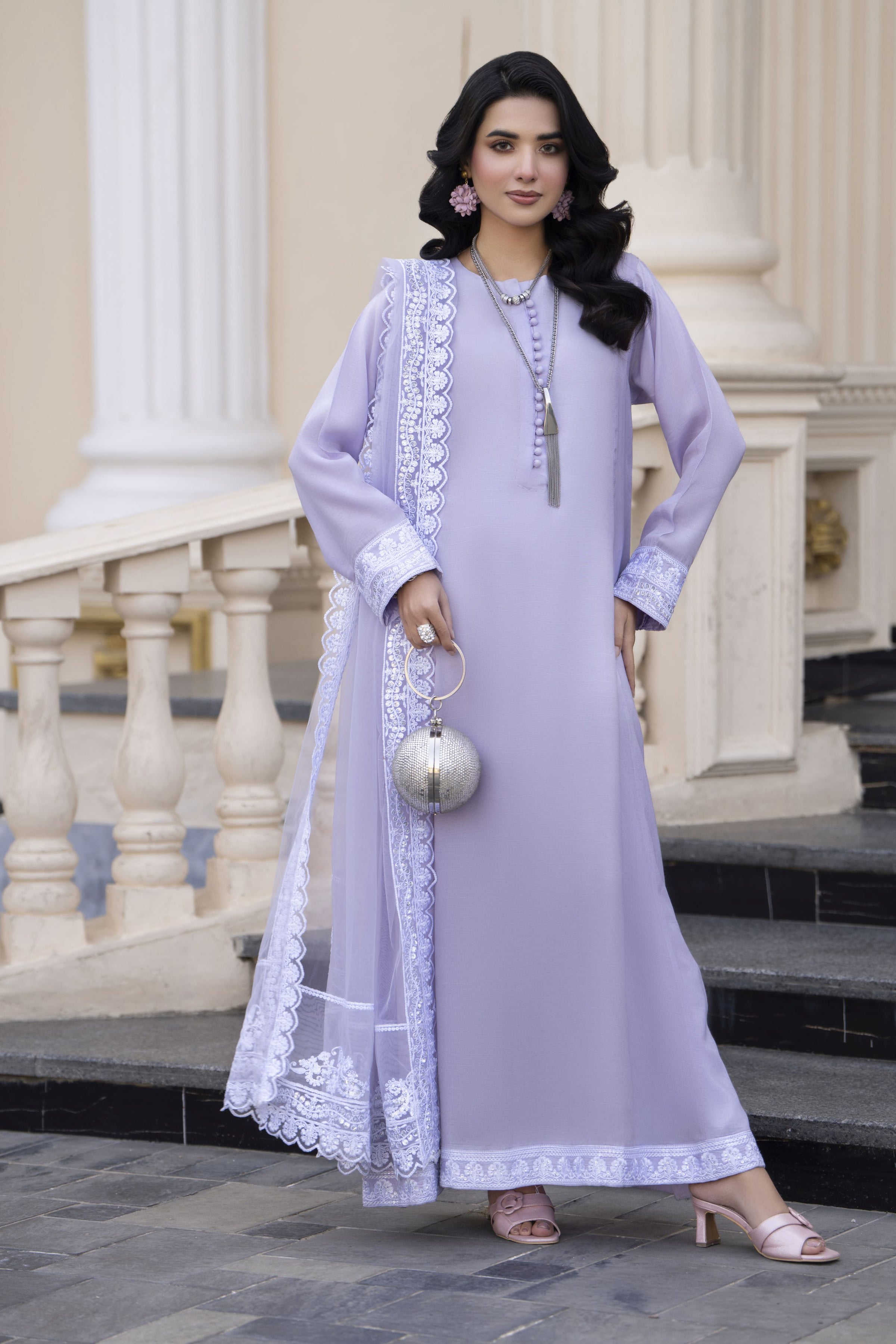 The centrepiece of this outfit is its embroidered long frock, designed with a beautifully flowing cut that creates a flattering and modest silhouette. The subtle embroidery adds sophistication while keeping the overall look minimal and wearable. With its extended length, the frock drapes gracefully, making it an excellent choice for women seeking elegant Pakistani fashion with a soft, contemporary feel.