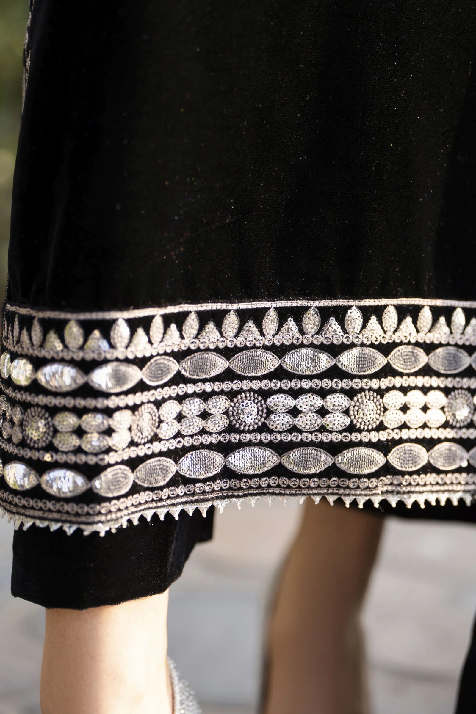 The embroidered long velvet shirt is designed with a graceful fall and paired with matching straight-leg trousers, creating a sleek and flattering silhouette. Completing the ensemble is a luxuriously embroidered velvet shawl, adding warmth, drama, and a couture finish.