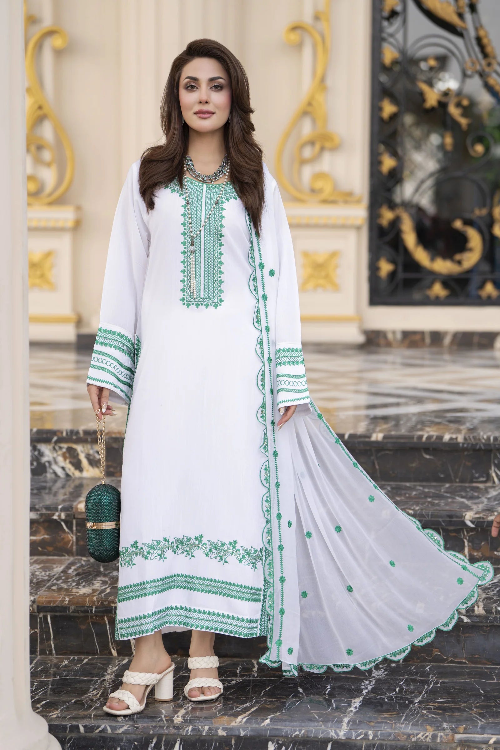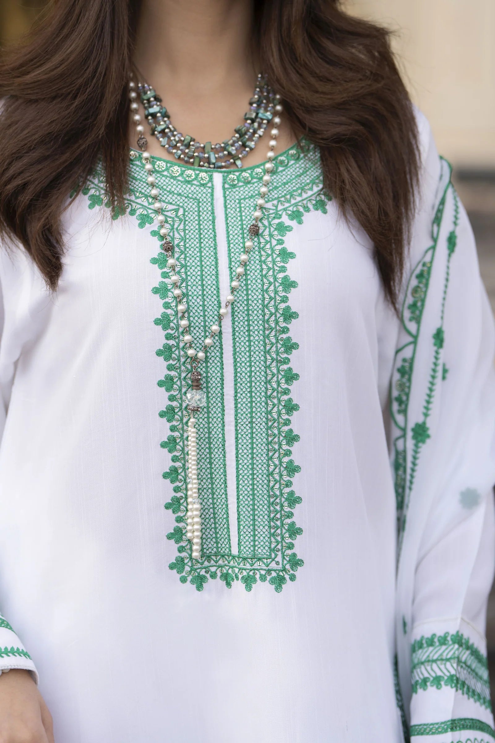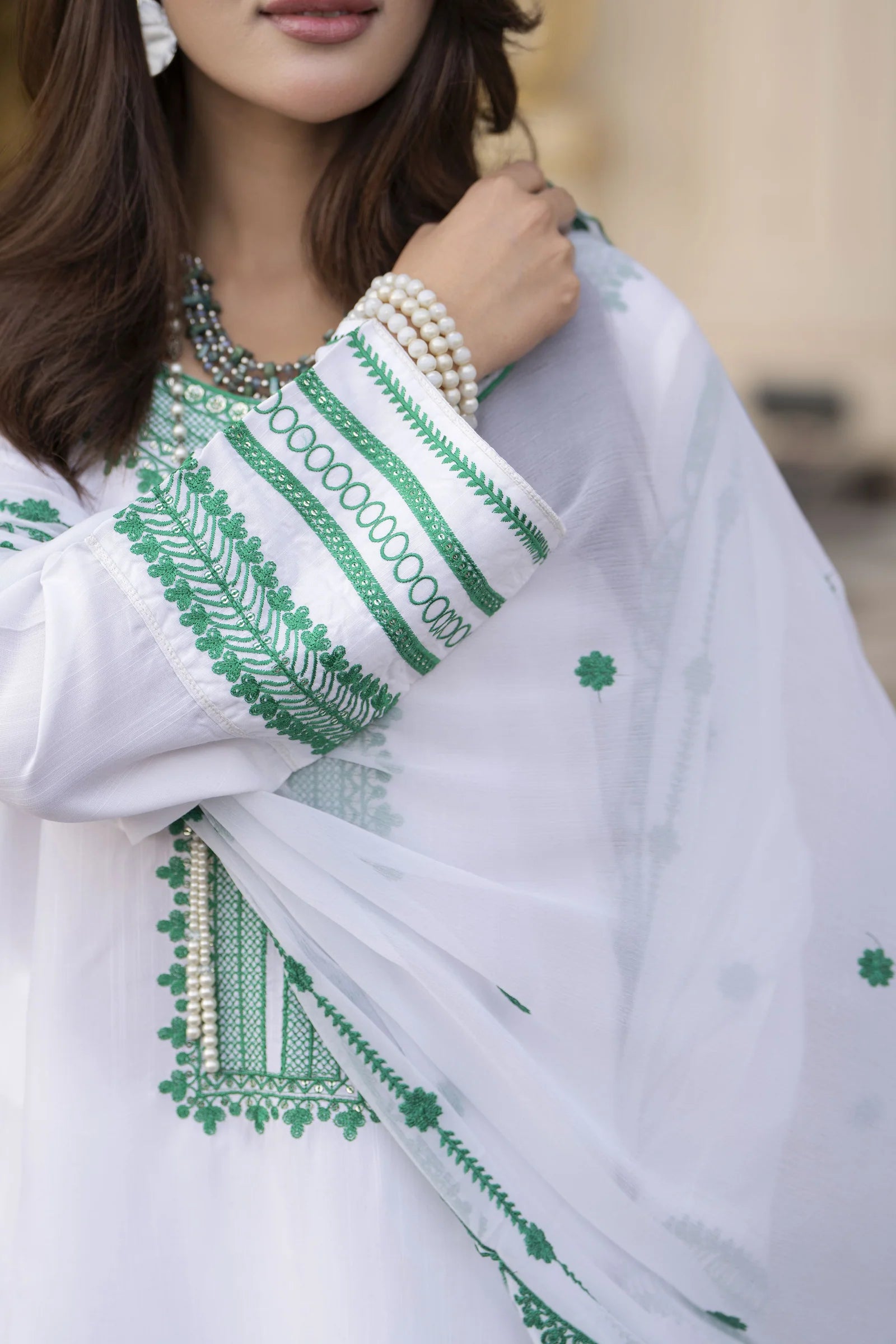 Reshmi RA3 White & Green Embroidered 3pc Raw Silk Suit with Chiffon Du