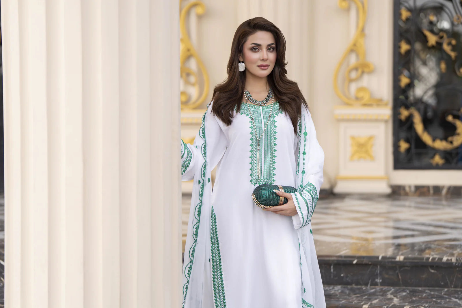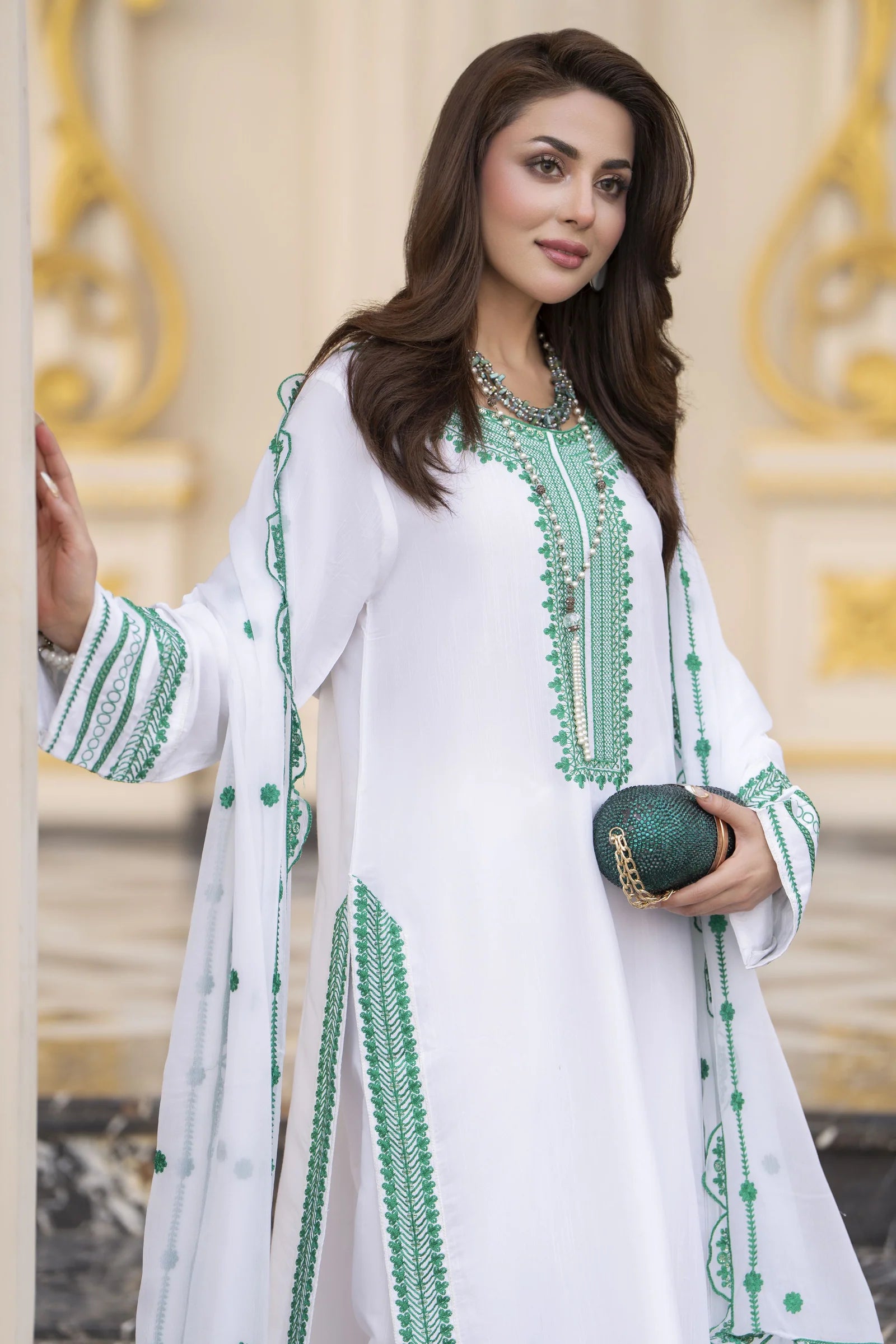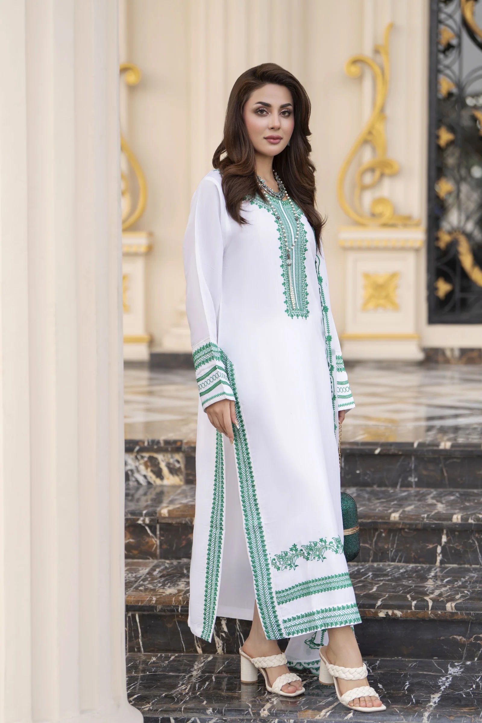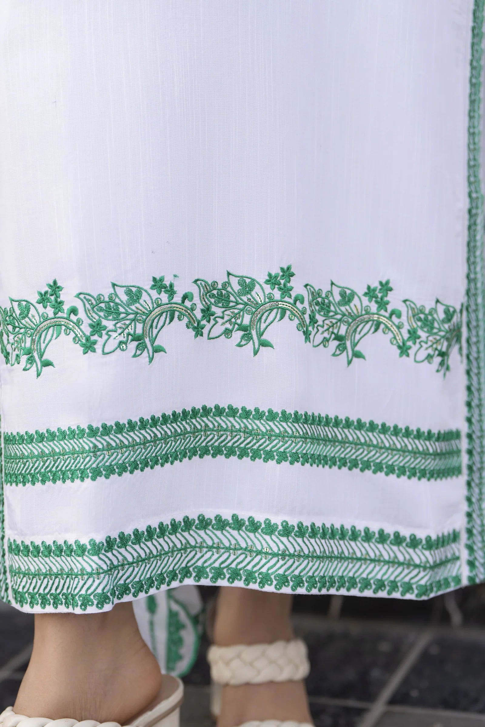 The long shirt features beautifully detailed green embroidery across the neckline, sleeves, and borders, creating a striking contrast against the soft white base. Thoughtfully designed with an attached lining (excluding sleeves), it offers both comfort and coverage while maintaining a fluid silhouette.