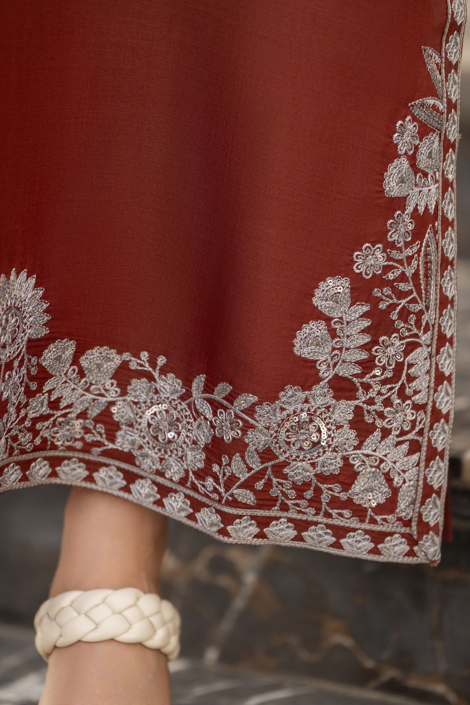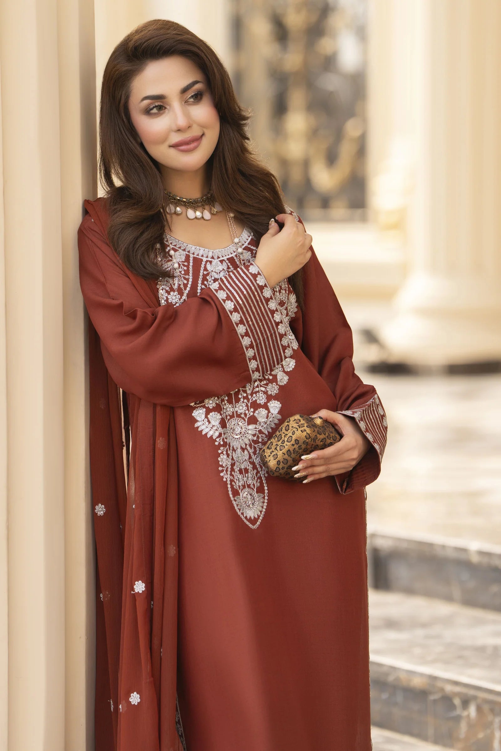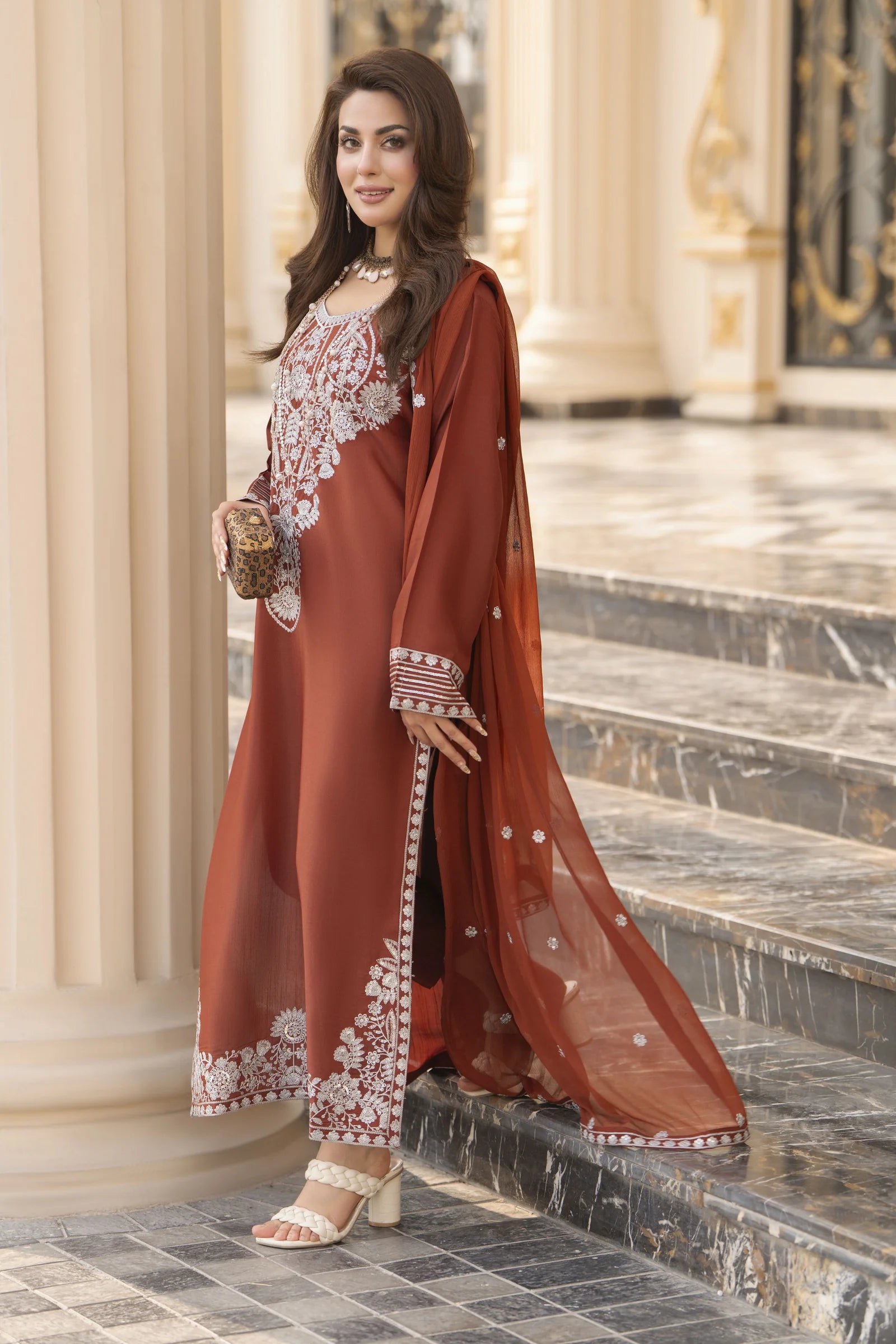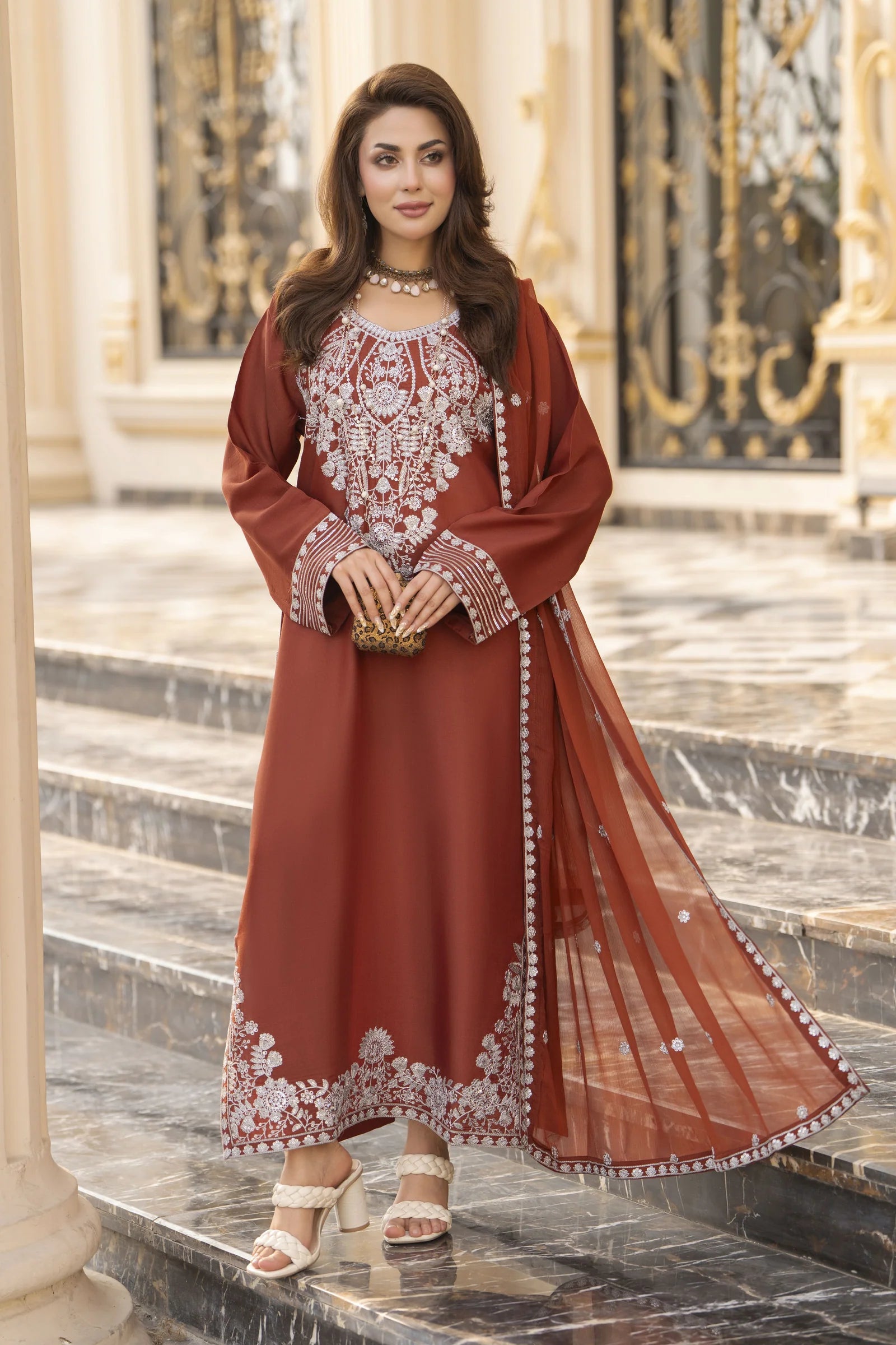 Reshmi RA5 Rust Embroidered 3pc Raw Silk Suit with Chiffon Dupatta