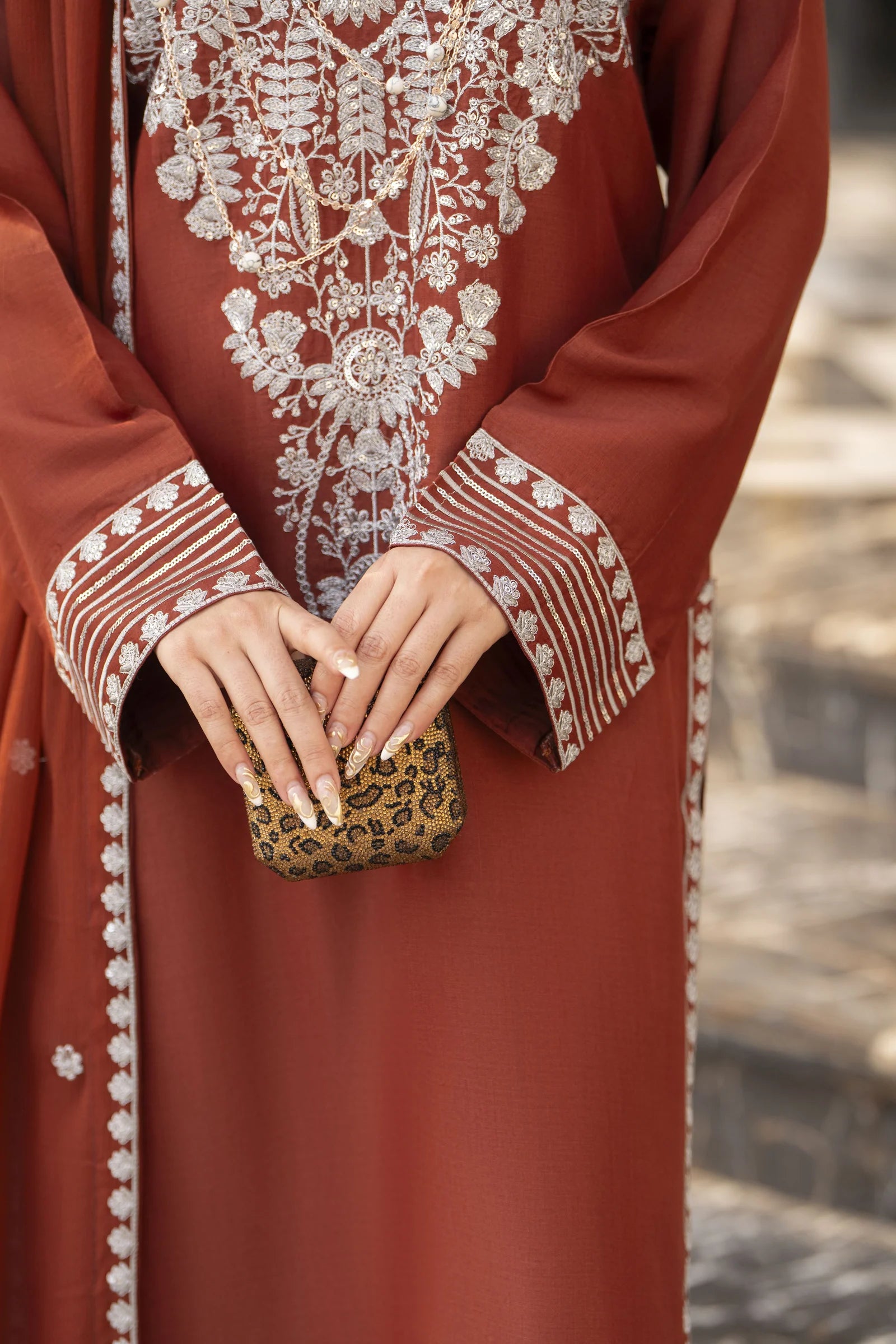 Rich, elegant, and designed to stand out, this rust-toned ensemble from the Reshmi by Aleezay collection is a perfect blend of tradition and modern sophistication. Crafted in premium raw silk, this 3-piece outfit is ideal for festive occasions, evening gatherings, and statement daywear.
