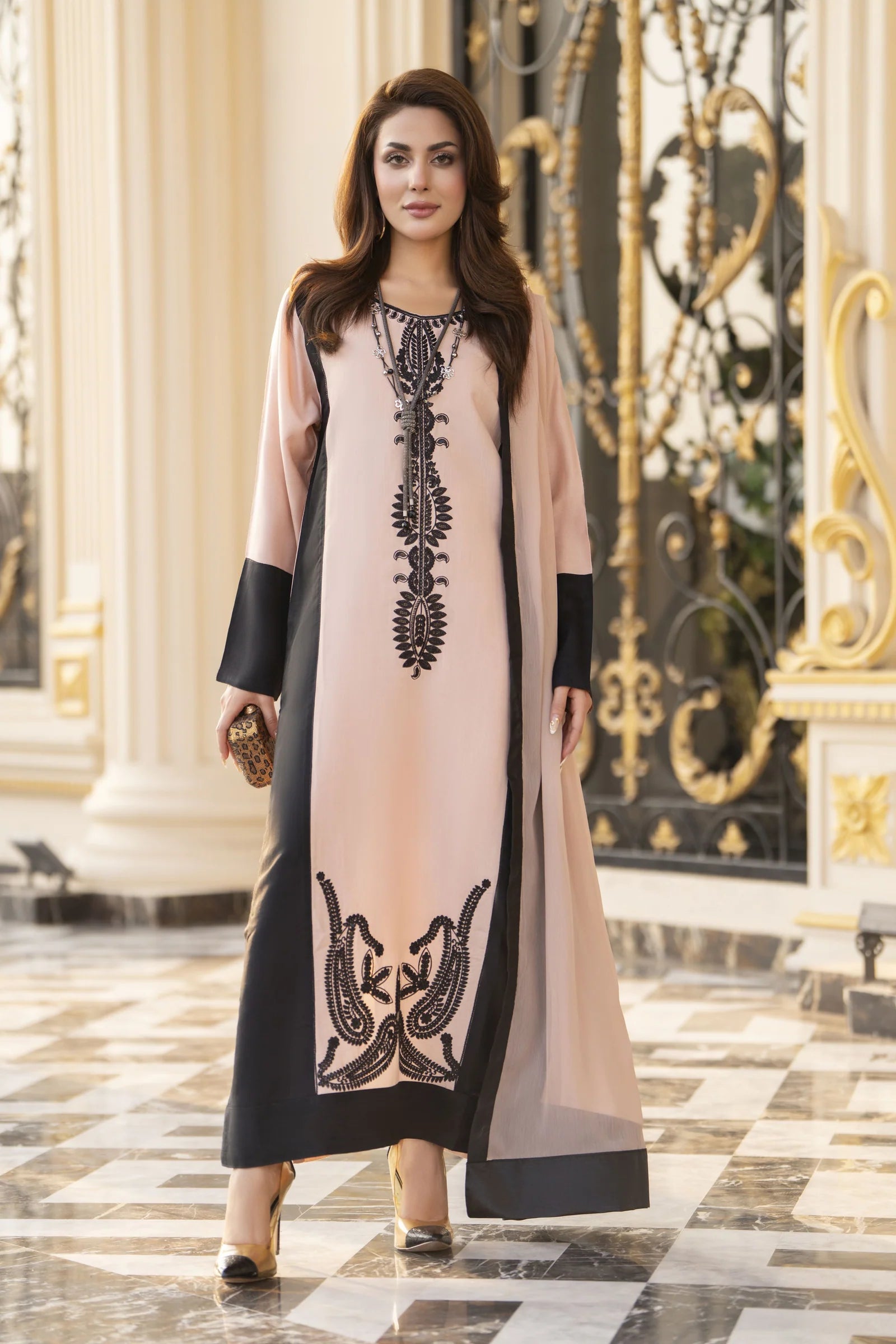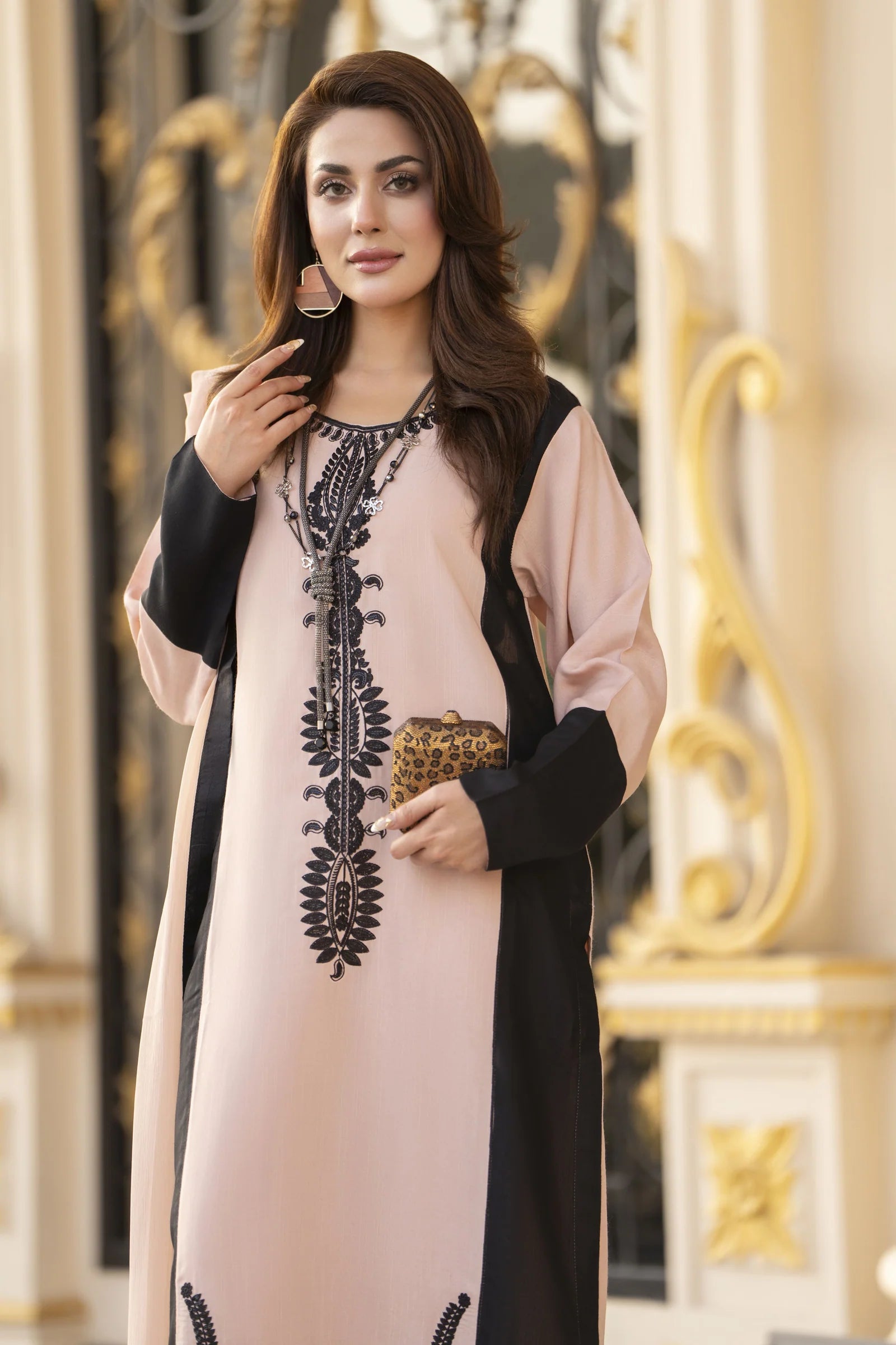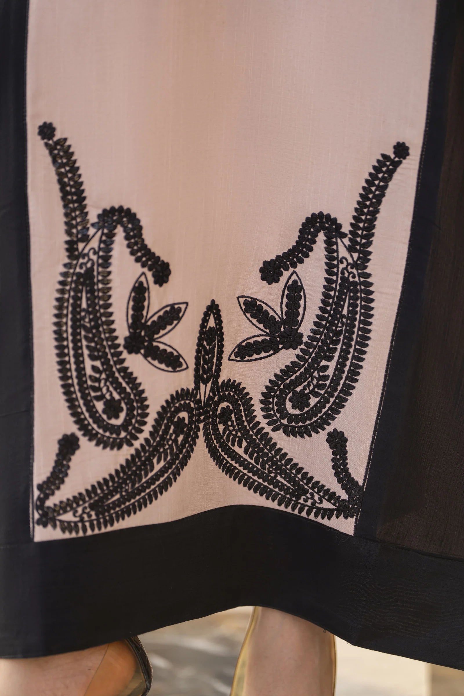 The long shirt features detailed black embroidery running along the neckline and front, creating a sleek and elongated look. The contrast side panels and borders add structure and definition, giving the outfit a refined, fashion-forward silhouette that stands out without being overly heavy.
