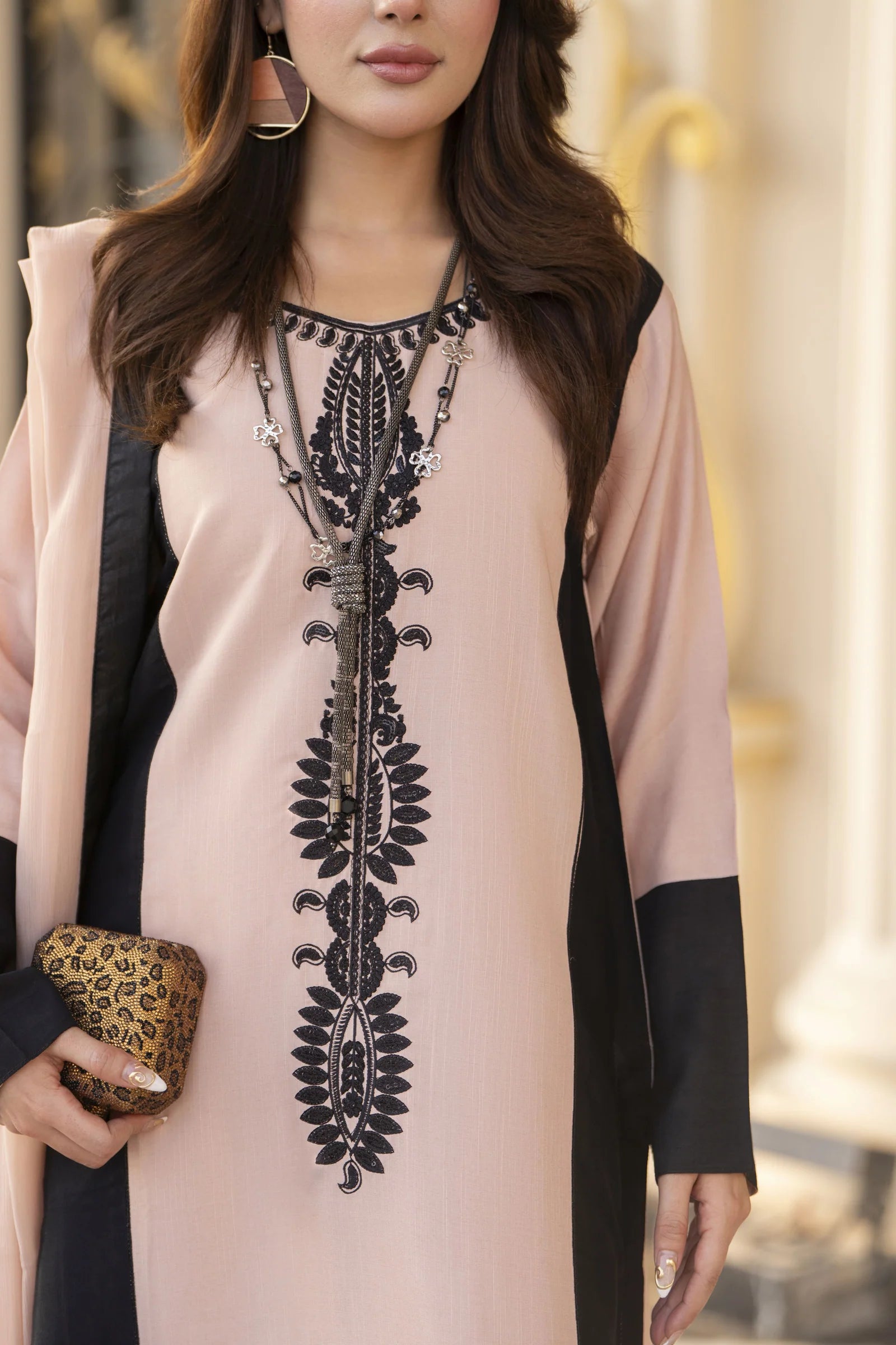 Reshmi RA8 Beige & Black Embroidered 3pc Raw Silk Suit with Chiffon Du