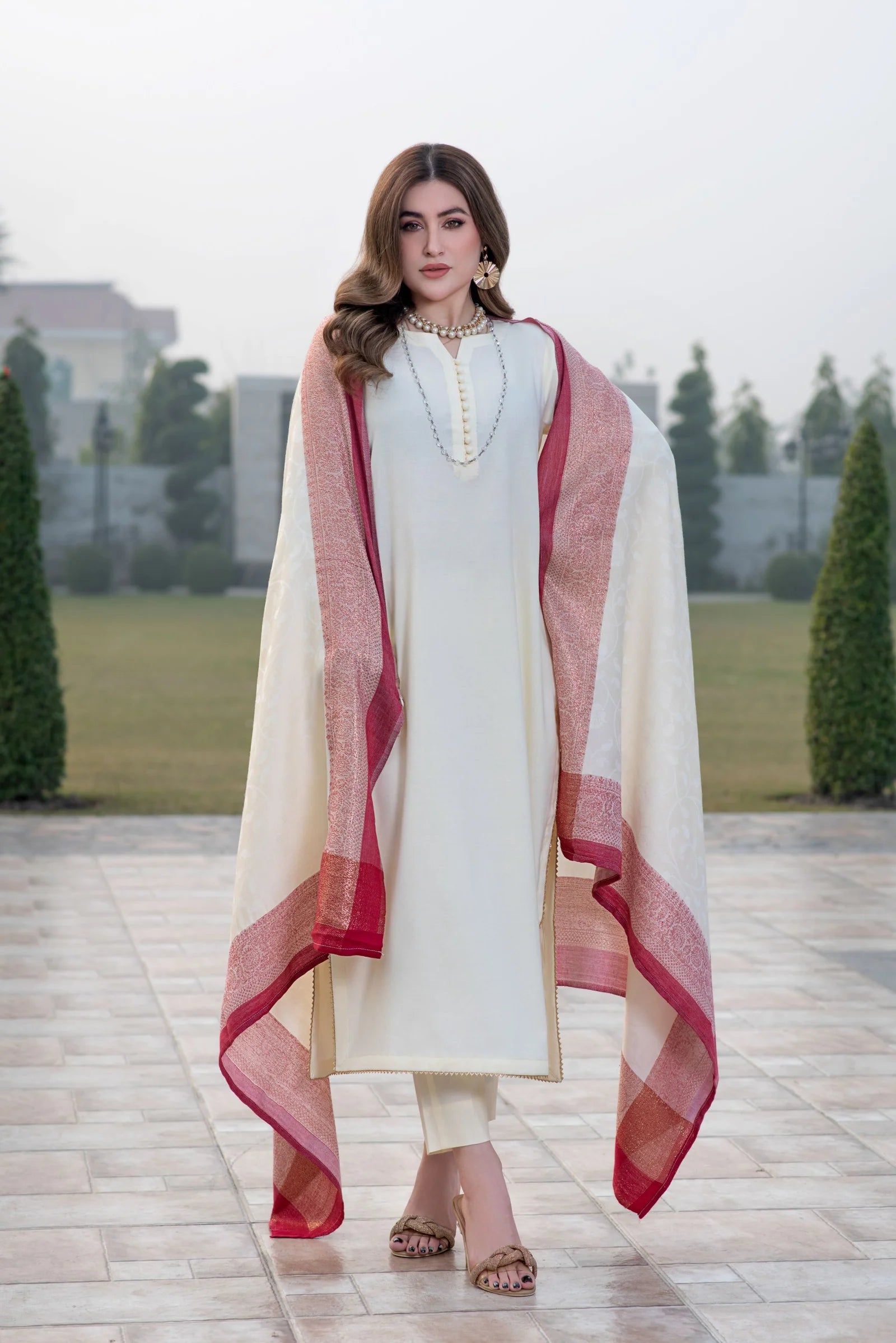 The outfit is beautifully completed with a wool Multani jacquard shawl, where rich woven patterns and warm tones bring contrast and depth to the soft ivory base. It adds both visual richness and the cosy warmth that makes this set perfect for winter.