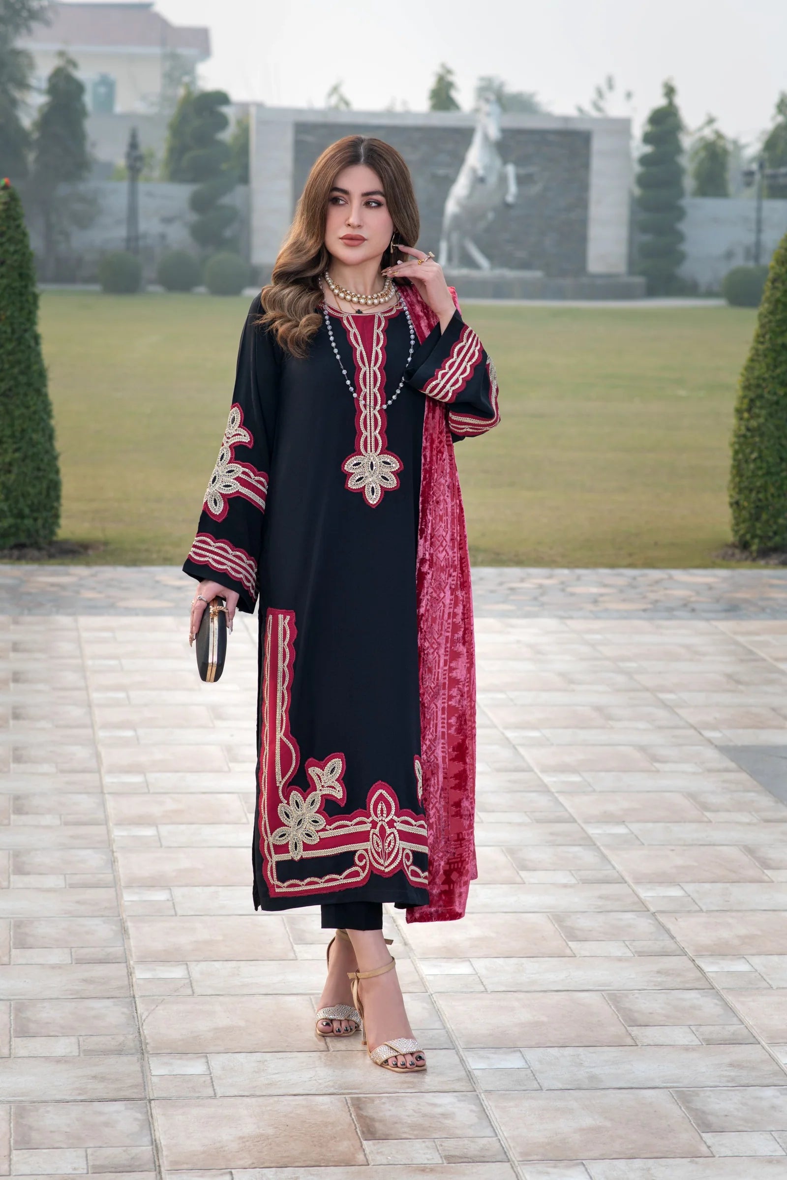 Completing the outfit is a stunning Palachi shawl, chosen for its soft drape and subtle sheen. It adds a graceful finish to the look, making this set ideal for winter evenings, gatherings, and special occasions.
