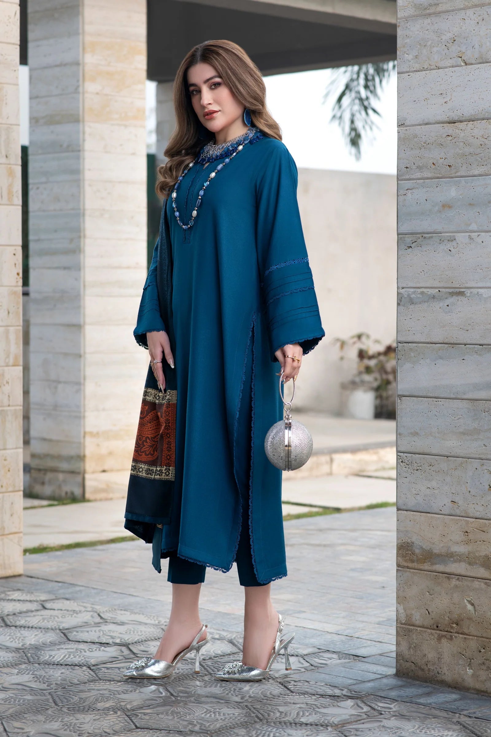 Wrapped around it is a striking wool Multani jacquard shawl, rich with heritage patterns and warm tones that contrast beautifully against the teal base. It not only adds visual depth but also brings the cosy warmth that makes this outfit perfect for colder days.