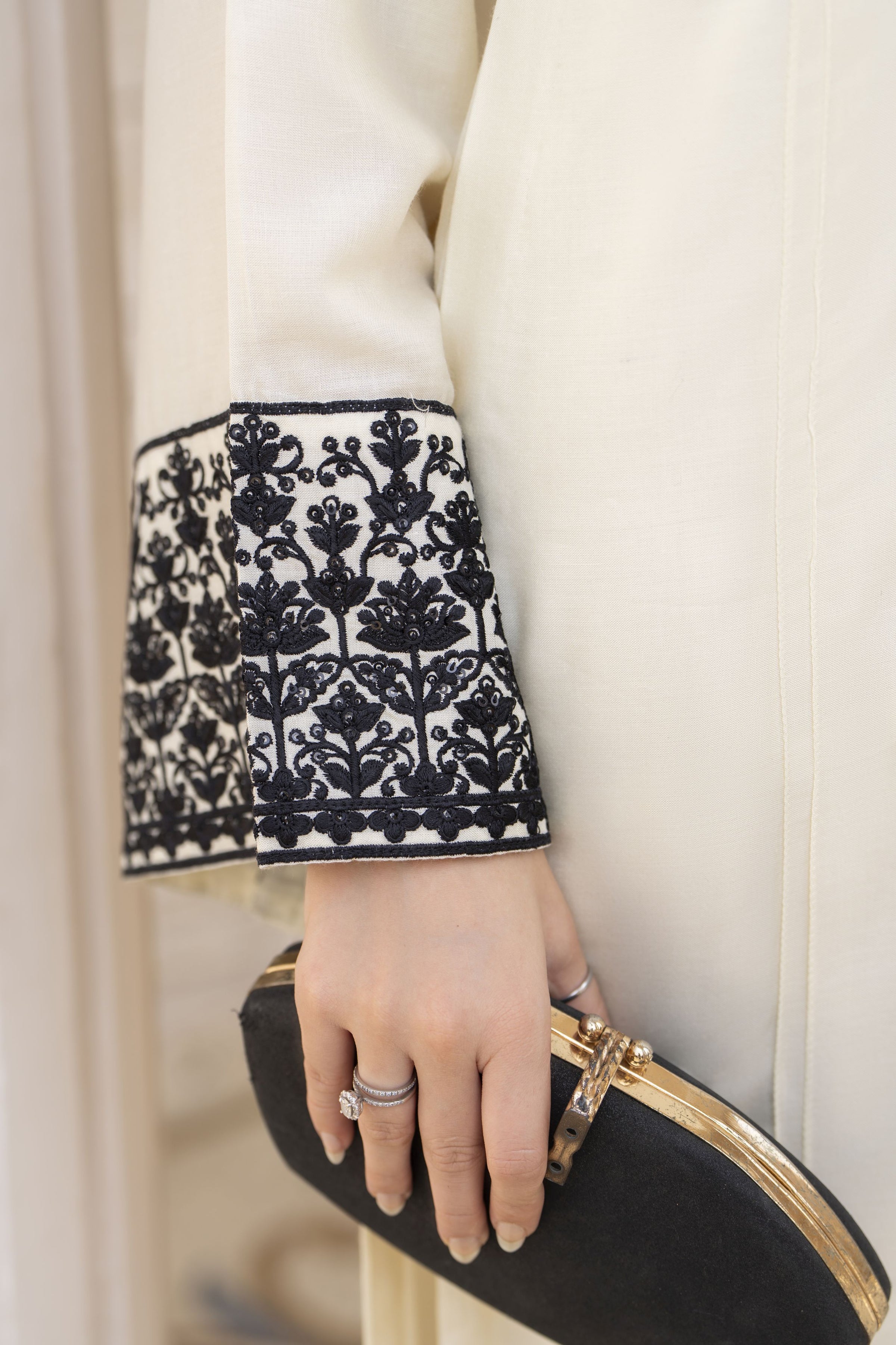 A timeless winter essential from Linen Aura by Miski, this 3-piece ready-to-wear outfit blends understated luxury with effortless style. Crafted from premium linen in a soft cream shade, the shirt features elegant embroidered cuffs and a body lining for added comfort, while the sleeves remain unlined for a graceful drape. It is paired with embroidered trousers that complement the refined look and a chiffon dupatta enhanced with delicate lace edging. Perfect for women who appreciate minimal elegance and warm sophistication, this design embodies comfort, charm, and winter-ready refinement.