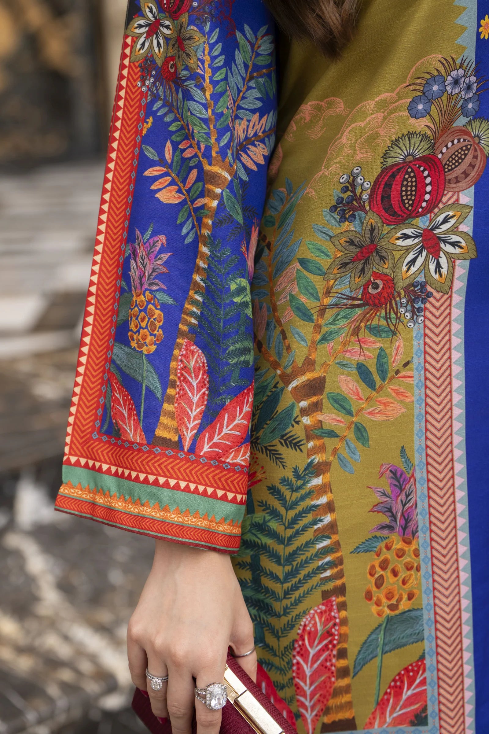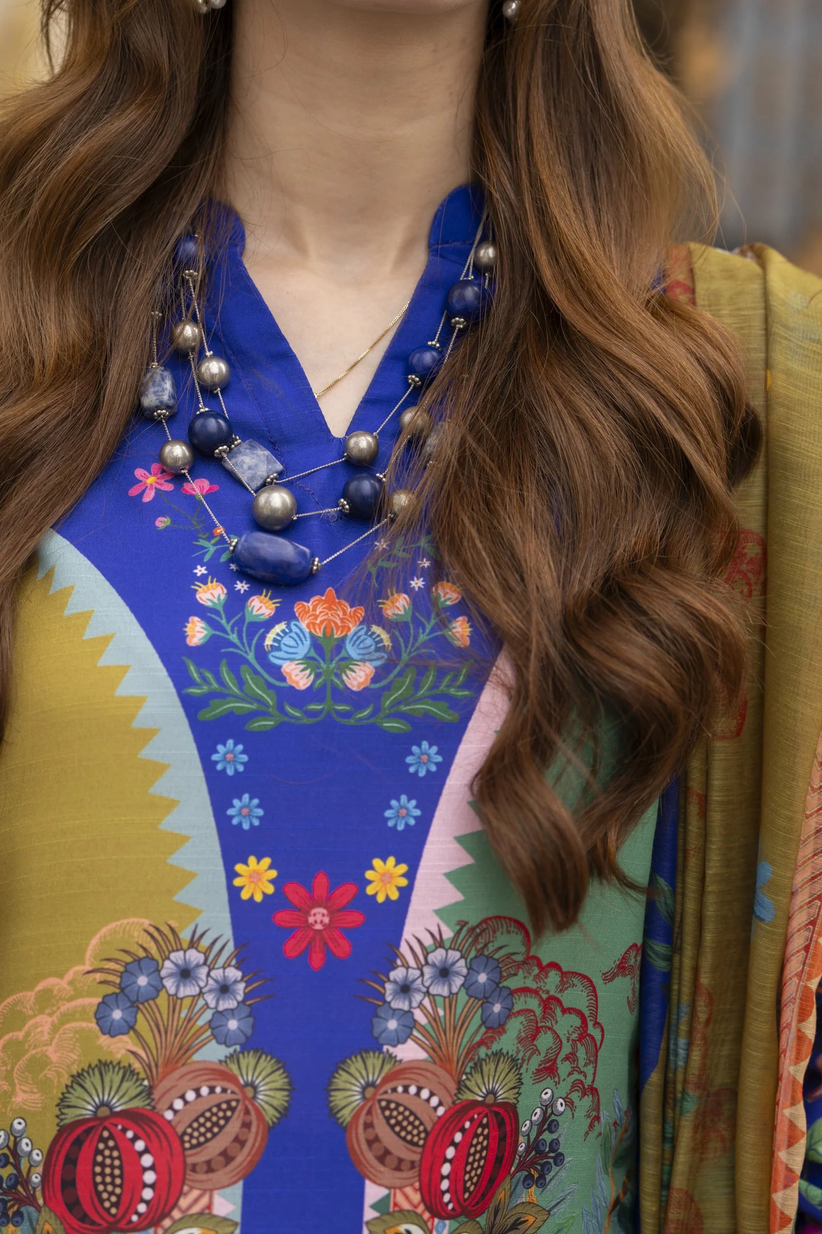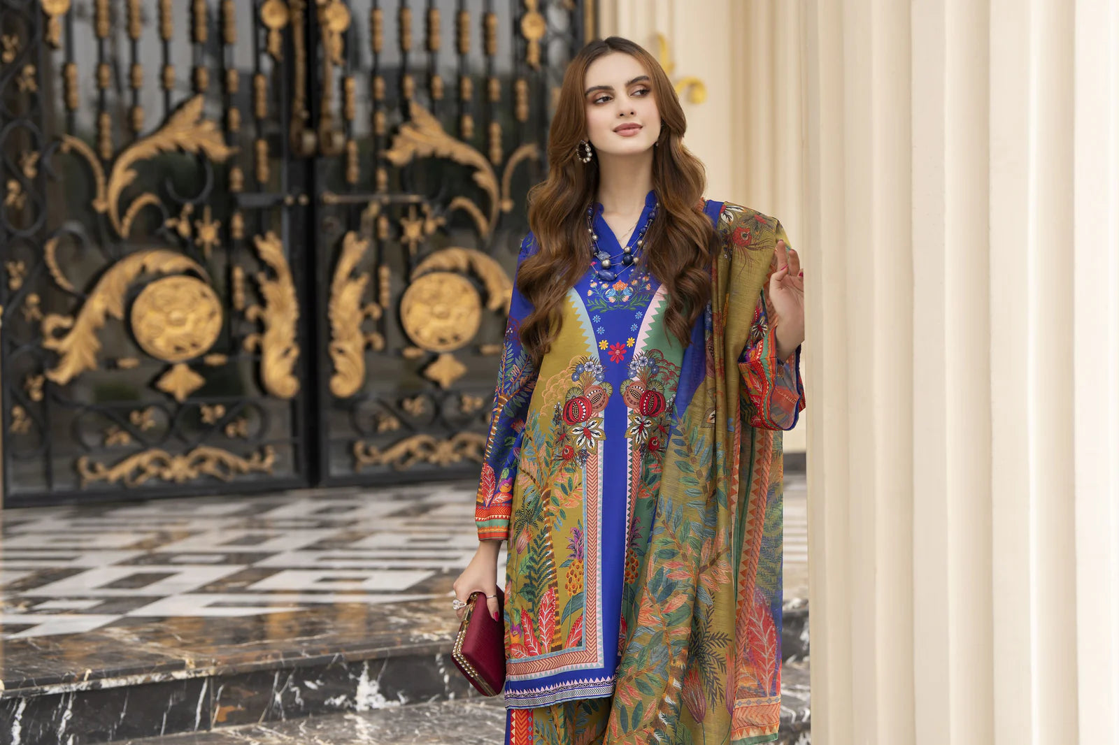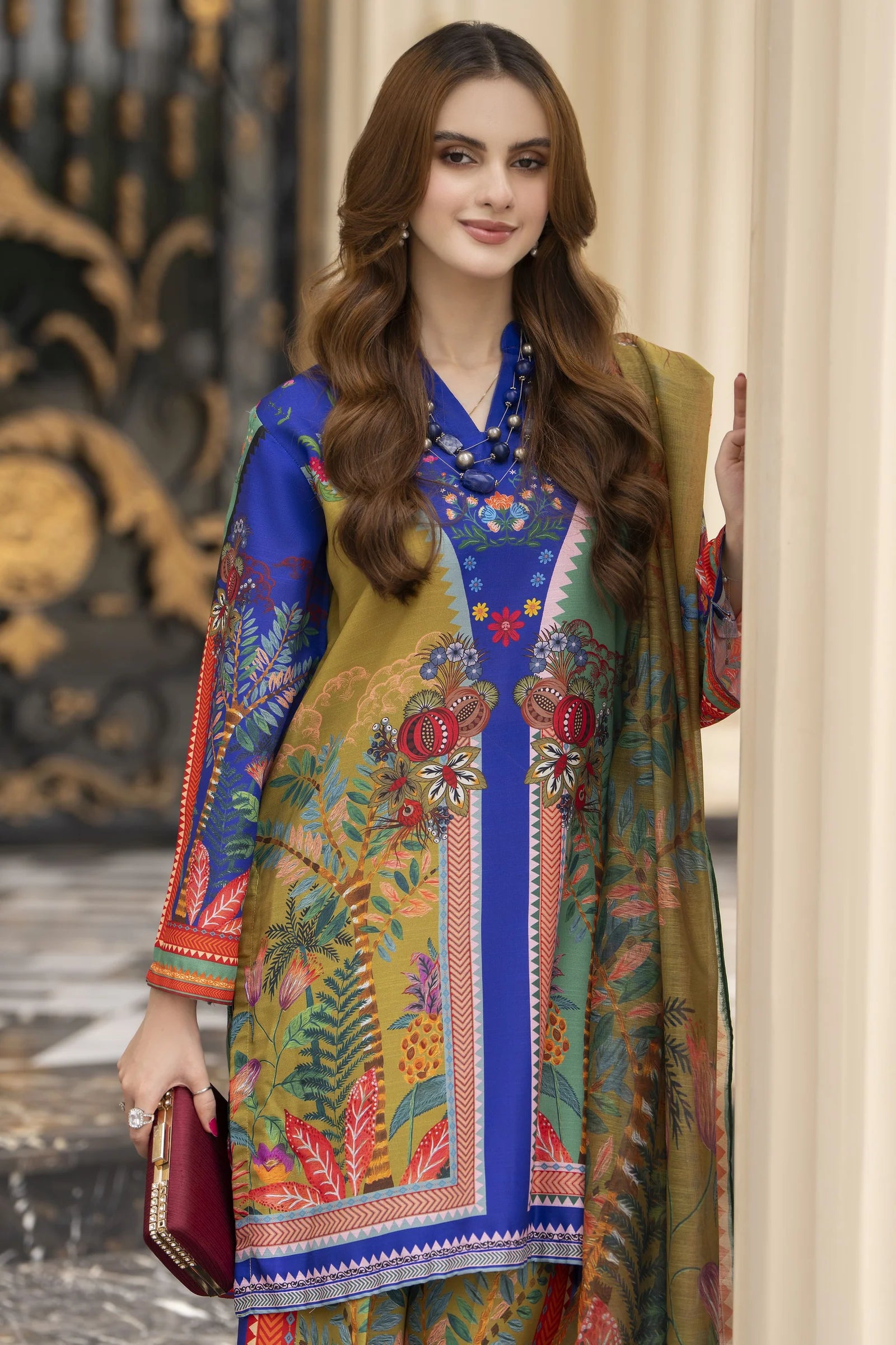 Add a splash of colour to your wardrobe with this vibrant 3-piece ready-to-wear outfit from the Daily Drapes by Mona collection. The shirt and wide-leg trousers in poly raw silk showcase a bold multicolour print with intricate detailing, paired beautifully with a breezy printed monar dupatta. A statement look that’s perfect for chic everyday wear with a lively twist.