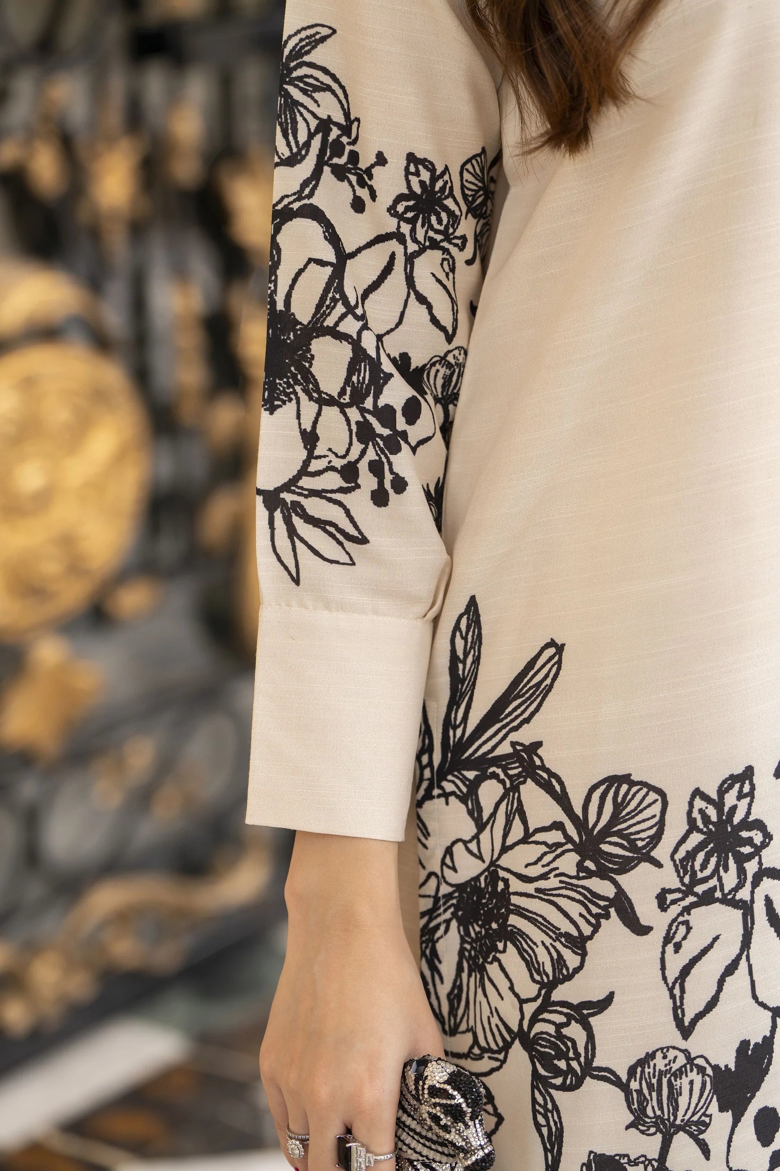 Keep it effortlessly elegant with this 3-piece ready-to-wear outfit from the Daily Drapes by Mona collection. The soft beige shirt and palazzo pants in poly raw silk feature bold black floral prints for a contemporary monochrome look, styled with a matching printed monar dupatta. A chic design that’s easy to wear yet makes a refined statement for everyday occasions.