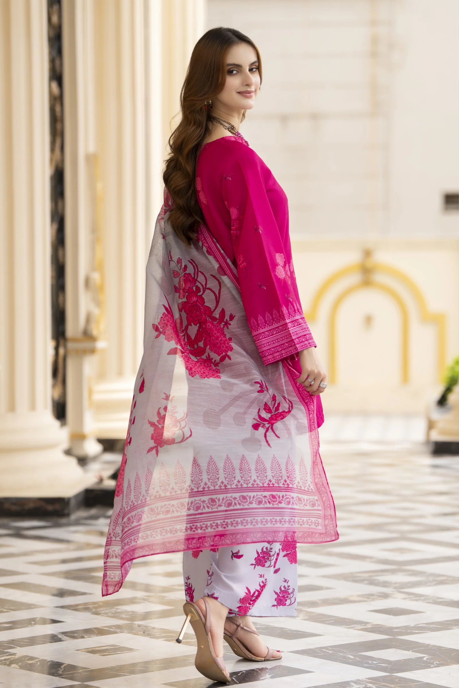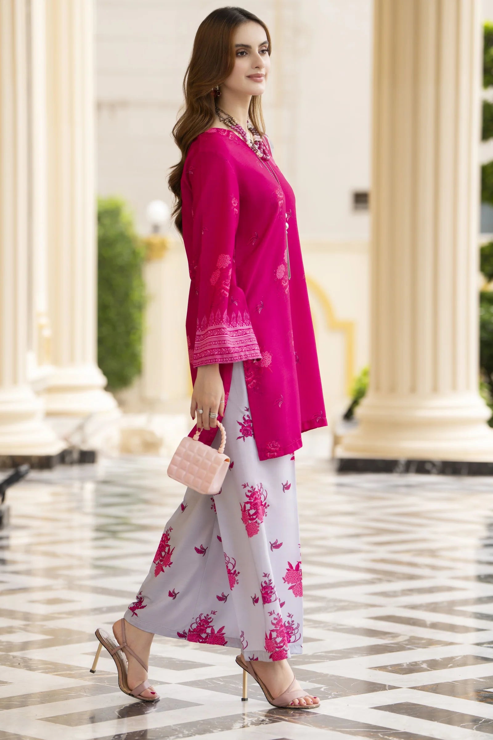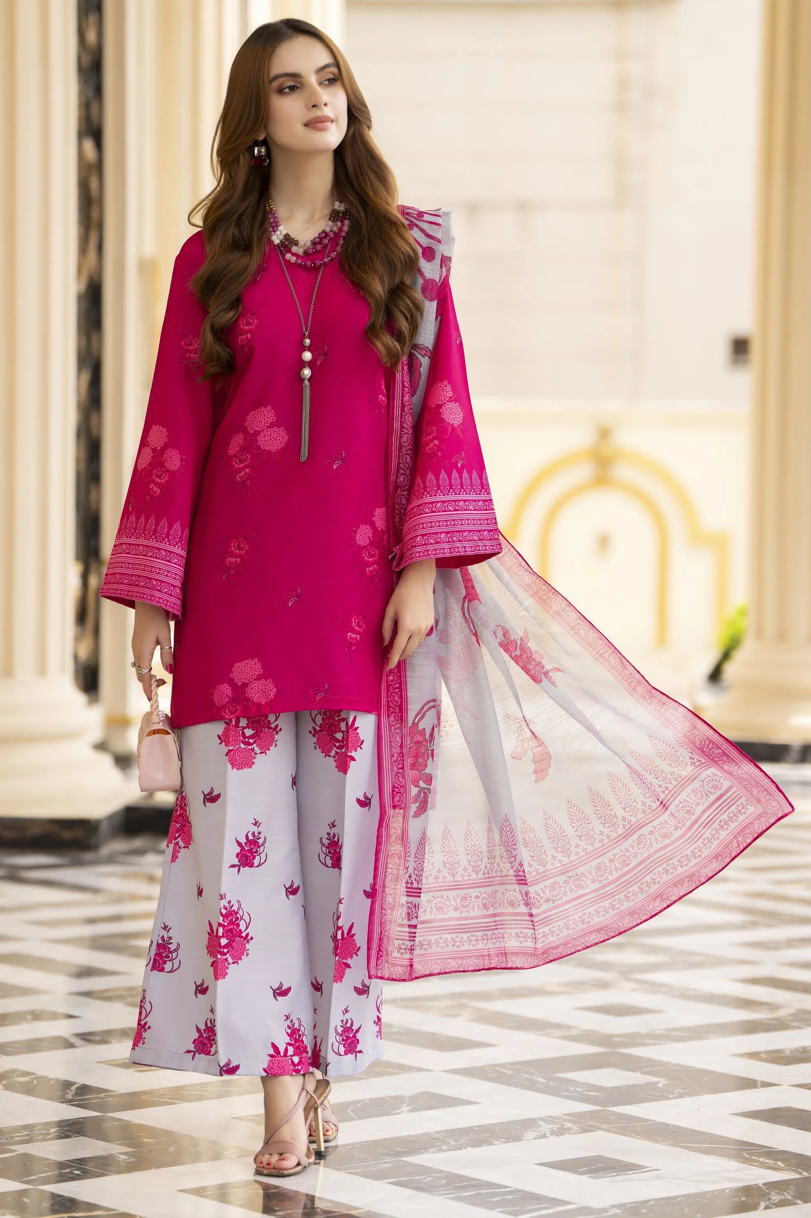 Turn heads with this bold and stylish 3-piece ready-to-wear suit from the Daily Drapes by Mona collection. The fuchsia pink shirt in poly raw silk is paired with wide-leg trousers featuring contrasting floral prints, finished with a soft printed monar dupatta in matching tones. A striking choice that blends vibrant colour with everyday elegance.