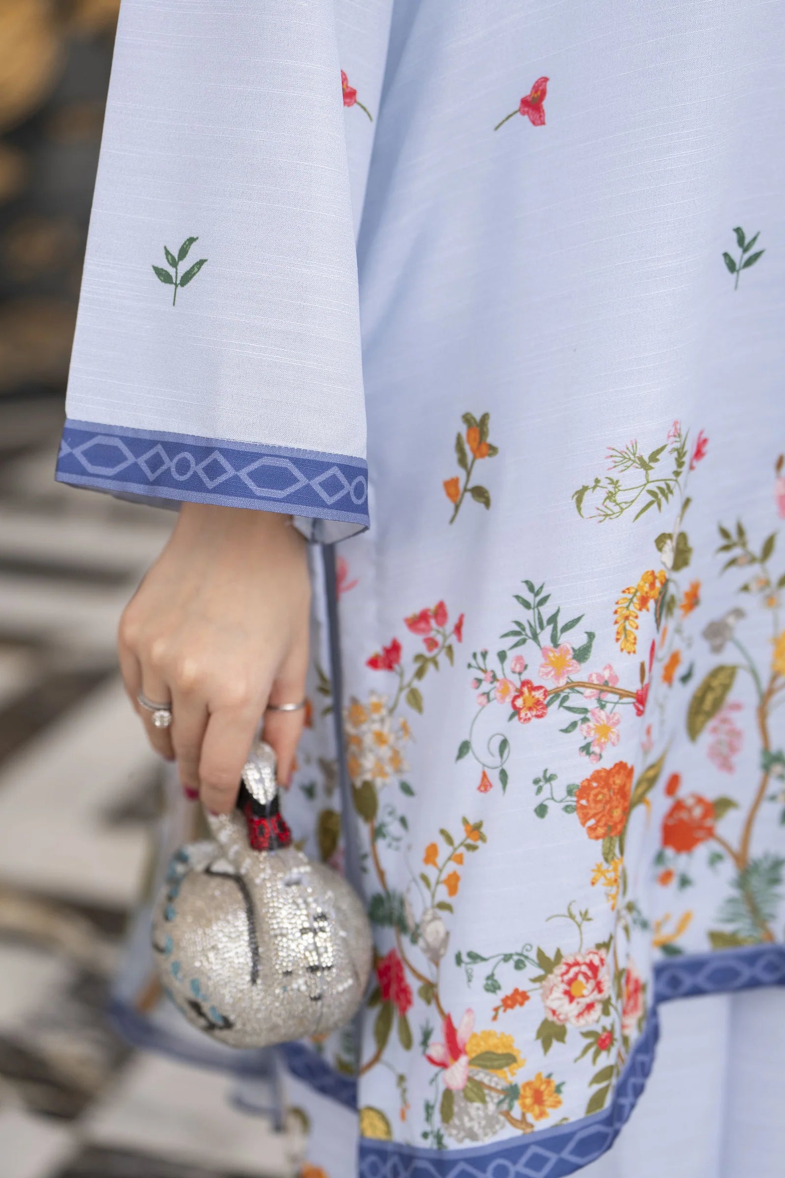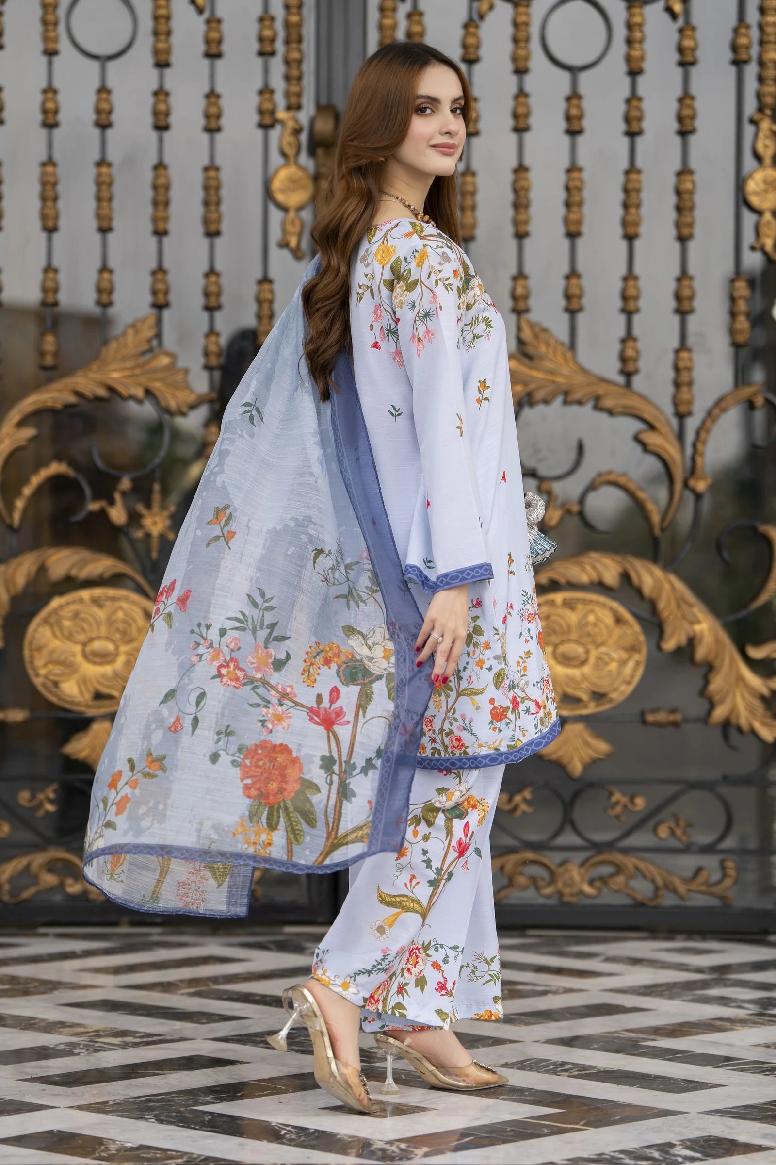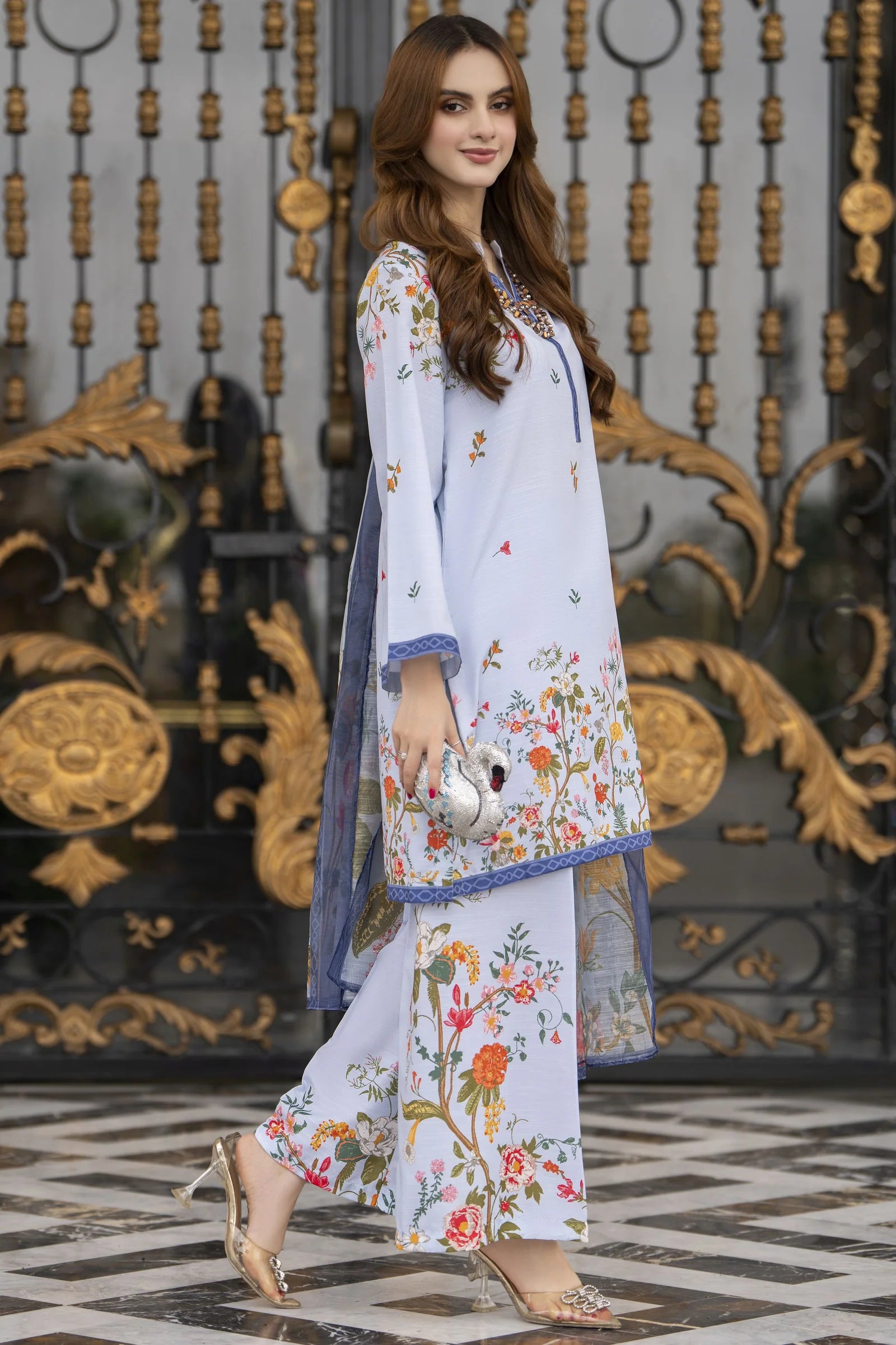 Fresh and feminine, this 3-piece ready-to-wear suit from the Daily Drapes by Mona collection brings a soft charm to everyday dressing. Made from breathable poly raw silk, the powder-blue shirt and wide-leg trousers feature delicate multicolour floral prints, paired with a beautifully flowing printed monar dupatta. A graceful outfit that adds elegance to casual-chic style.