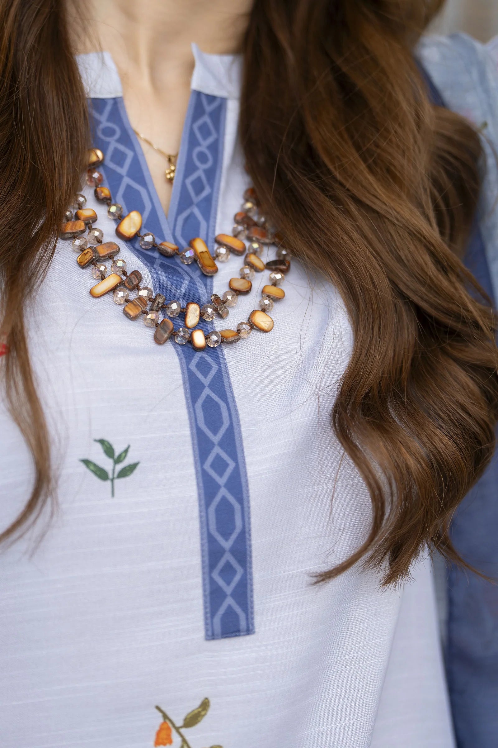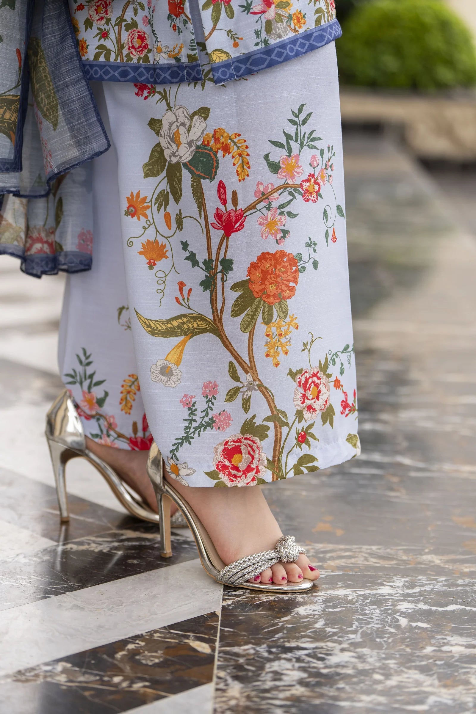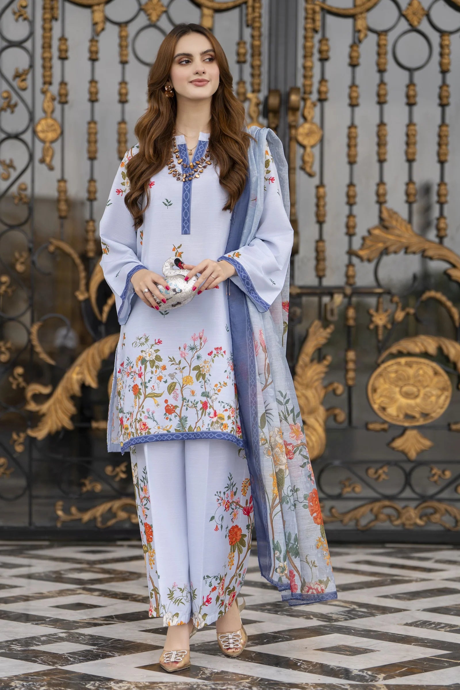 Fresh and feminine, this 3-piece ready-to-wear suit from the Daily Drapes by Mona collection brings a soft charm to everyday dressing. Made from breathable poly raw silk, the powder-blue shirt and wide-leg trousers feature delicate multicolour floral prints, paired with a beautifully flowing printed monar dupatta. A graceful outfit that adds elegance to casual-chic style.