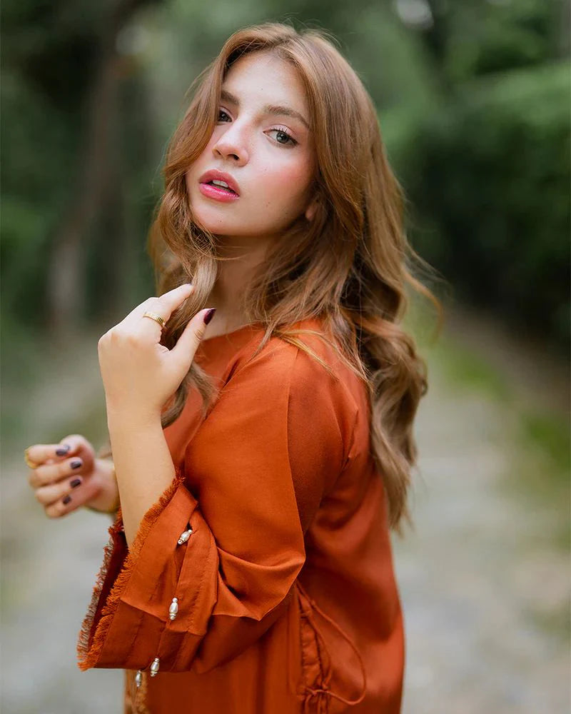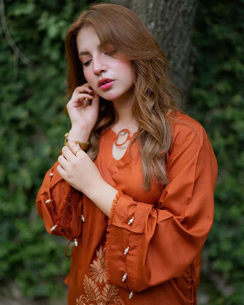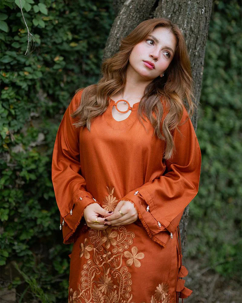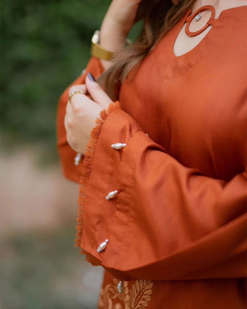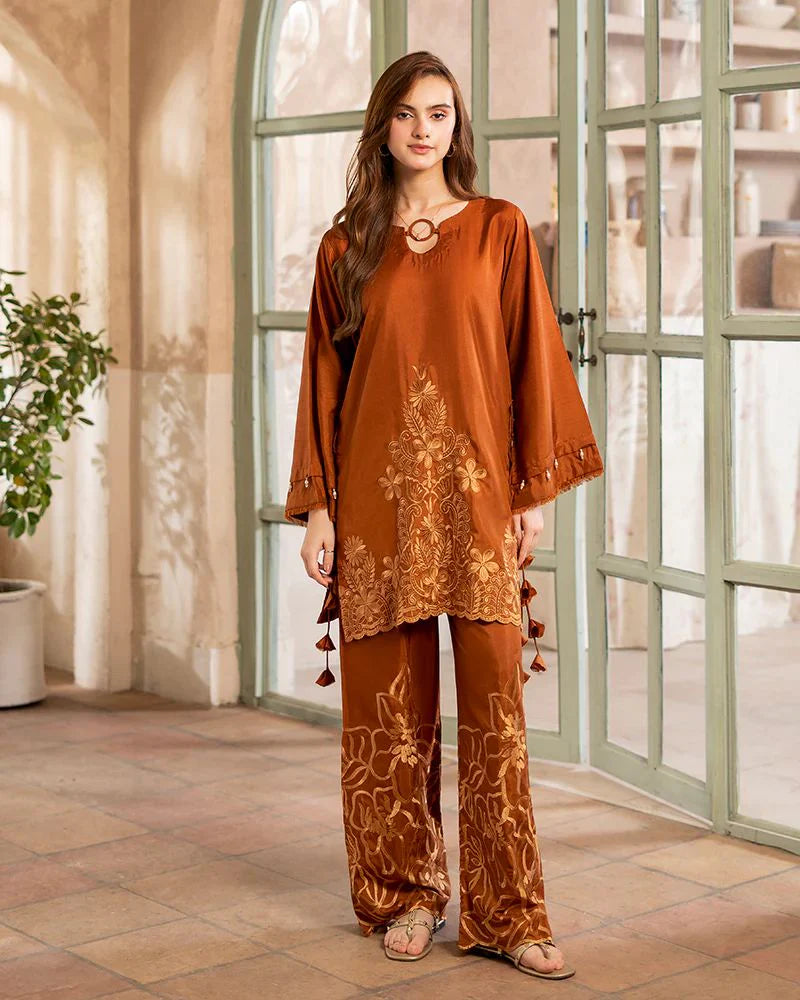 Brighten up your wardrobe with this Day to Night by Mona co-ord set, tailored in rich raw silk with a warm rust-orange hue. The shirt is decorated with floral chikankari embroidery and cutwork along the hem and sleeves, styled with delicate tie-up accents at the sides for a chic touch. Wide-leg trousers complete the look with matching embroidered patterns that add depth and character. Designed for comfort and elegance, this set is ideal for day-to-day wear as well as casual evening occasions.