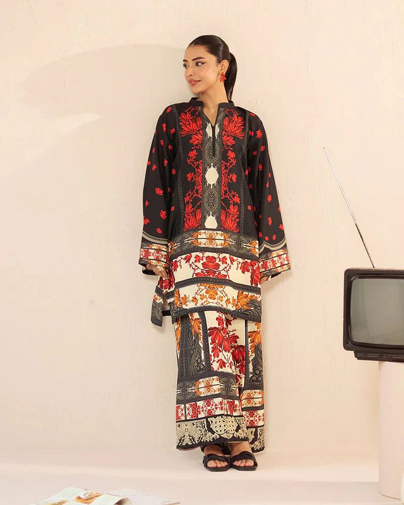 Add effortless elegance to your summer wardrobe with this stunning 2-piece co-ord set from the Everyday Luxe by Mona collection. Crafted from breathable silk lawn, the shirt and trousers feature a bold fusion of florals and block prints in deep black, red, and earthy tones — perfect for standing out while staying cool. This lightweight coord set is ideal for casual outings, work-from-home days, or everyday wear. Whether you're looking for Pakistani co-ord sets, trendy 2 piece co-ord sets, or summer co-ords sets for women, this look ticks all the boxes. The wide-leg printed trousers add comfort and flair, while the relaxed-fit shirt delivers style with zero effort. A must-have for women who love affordable fashion with premium appeal.