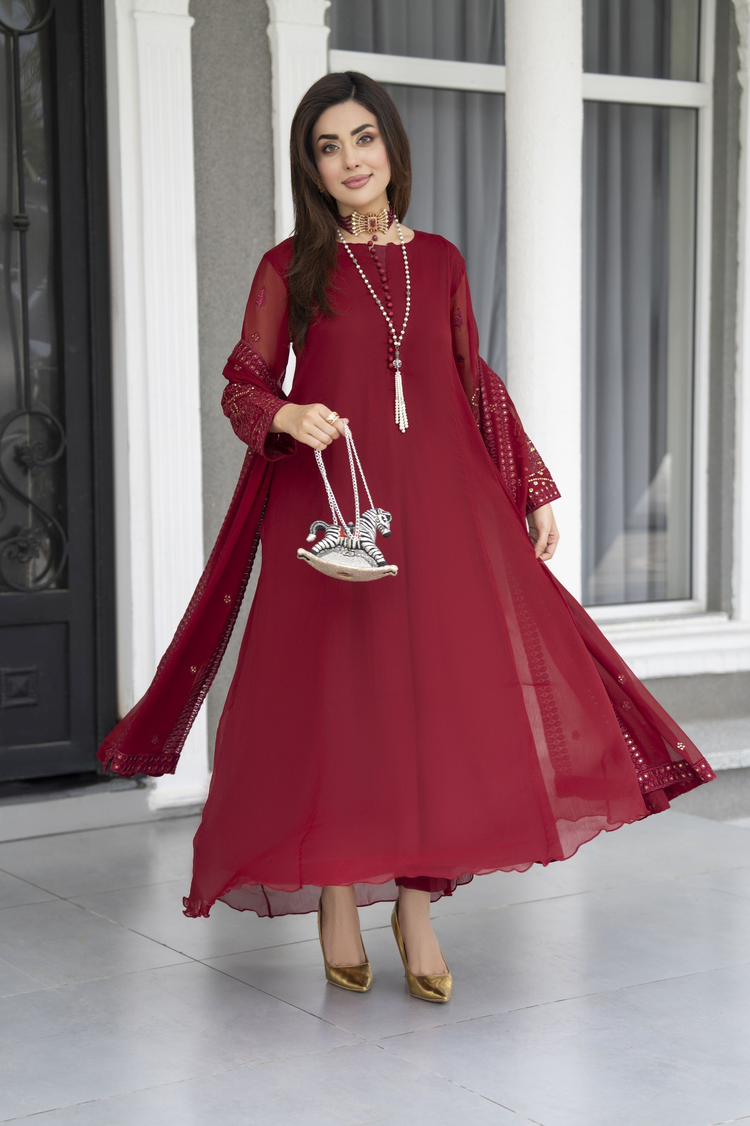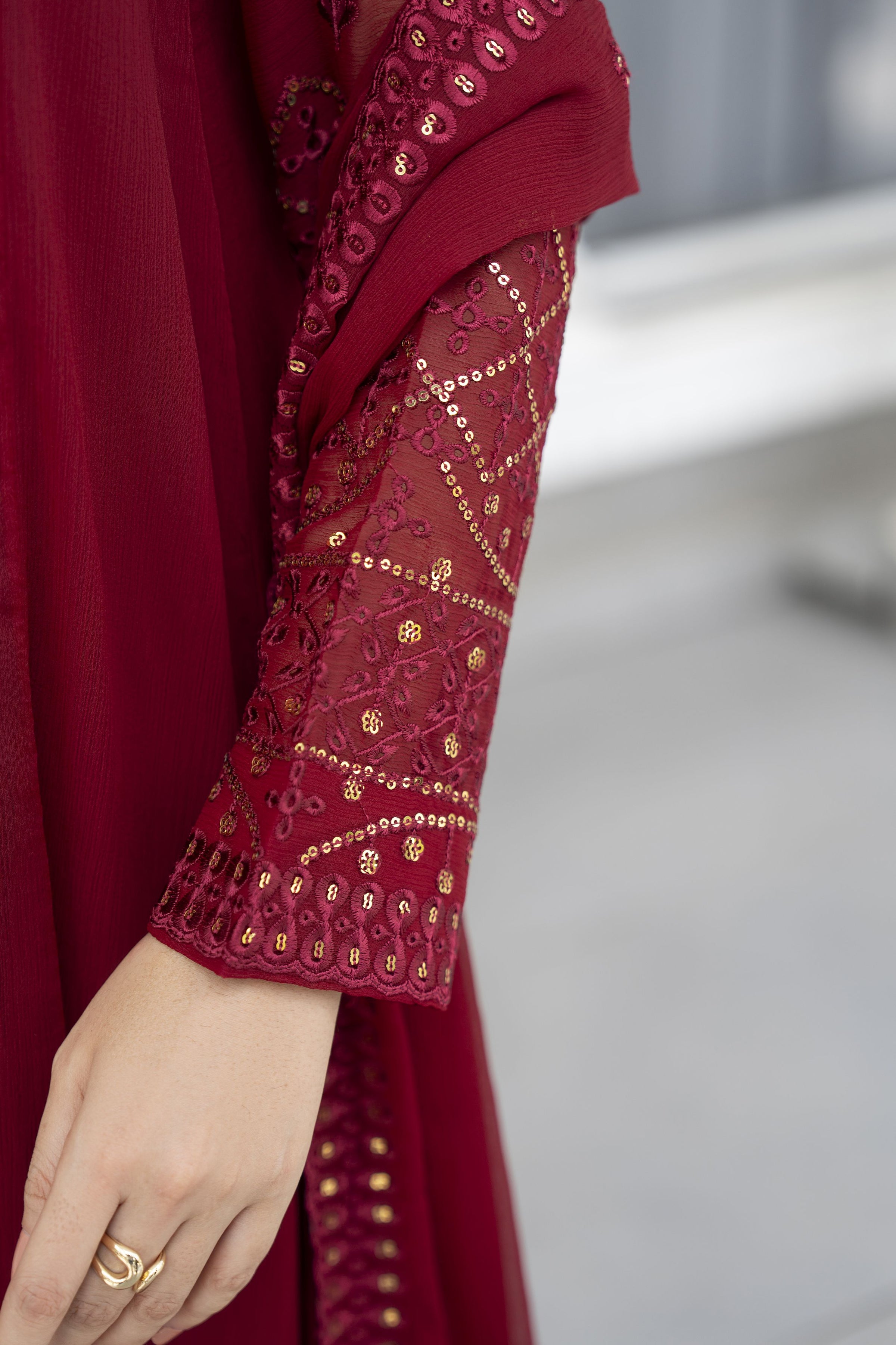 Gul Warun Lustre Chiffon – 3pc Ready to Wear Maroon Embroidered Frock