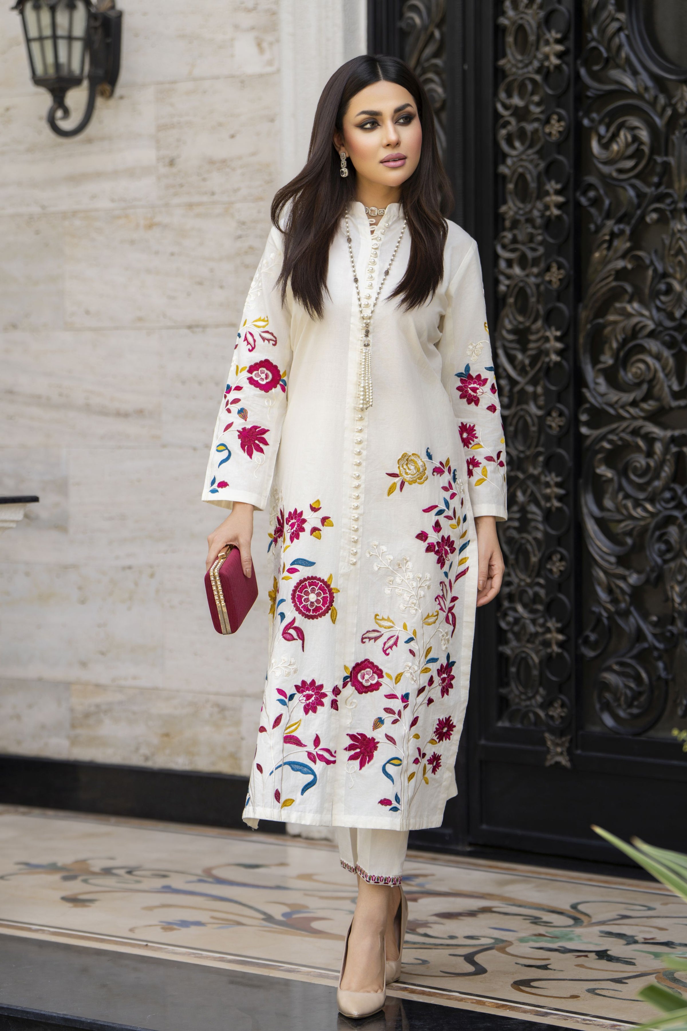 Refresh your summer wardrobe with this beautifully crafted ivory 2-piece suit from the Baarish by Miski collection. Made from breathable summer cotton, this ready-to-wear ensemble is a celebration of vibrant floral embroidery in shades of magenta, mustard, teal, and off-white—perfectly placed to add richness and charm to the neutral ivory base.