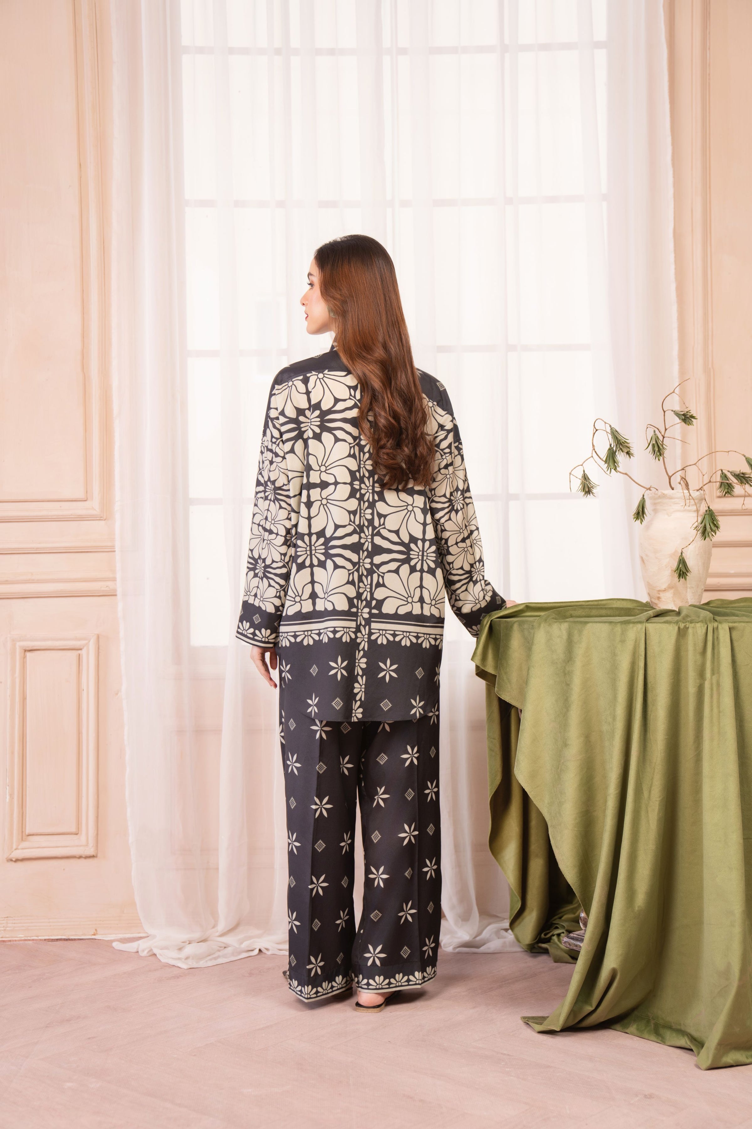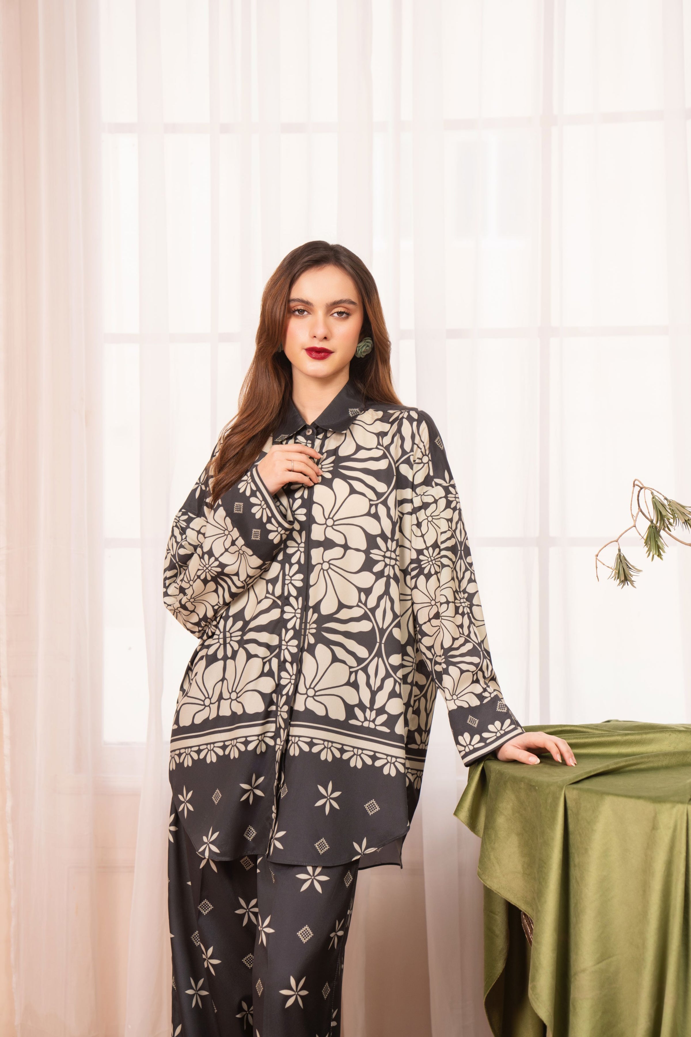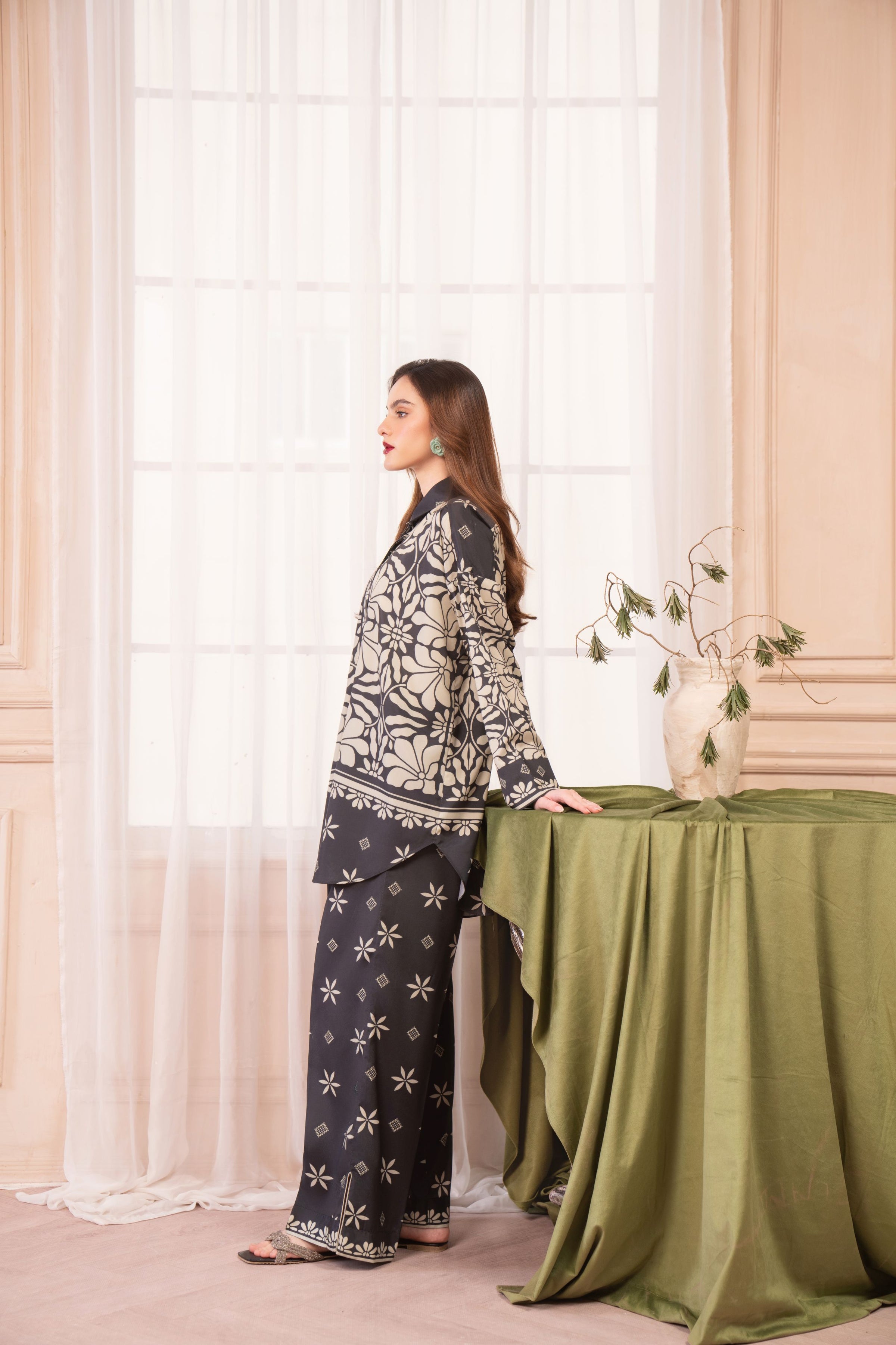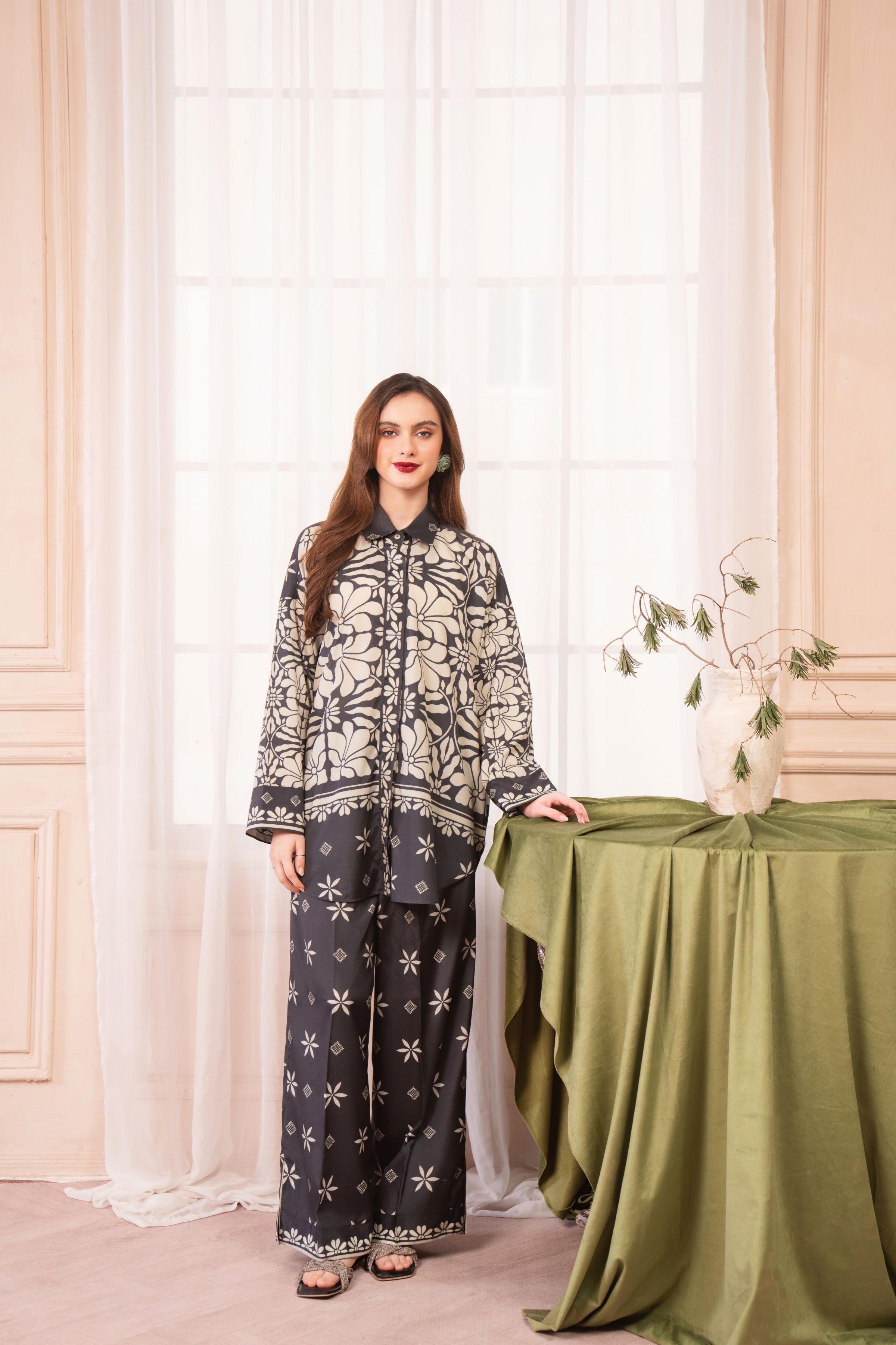 Understated yet bold, this monochrome 2-piece coord set from Grip Coords by Sakeena Hasan is the perfect fusion of minimalism and style. Designed in breathable grip fabric, the shirt features oversized ivory floral prints on a deep charcoal base, accented with a structured shirt collar and front button detailing. Paired with wide-leg trousers adorned with subtle ivory motifs, this ensemble exudes a contemporary elegance that transitions easily from daywear to evening chic. Perfect for brunches, gallery days, or smart casual occasions, this coord set is as versatile as it is stylish.