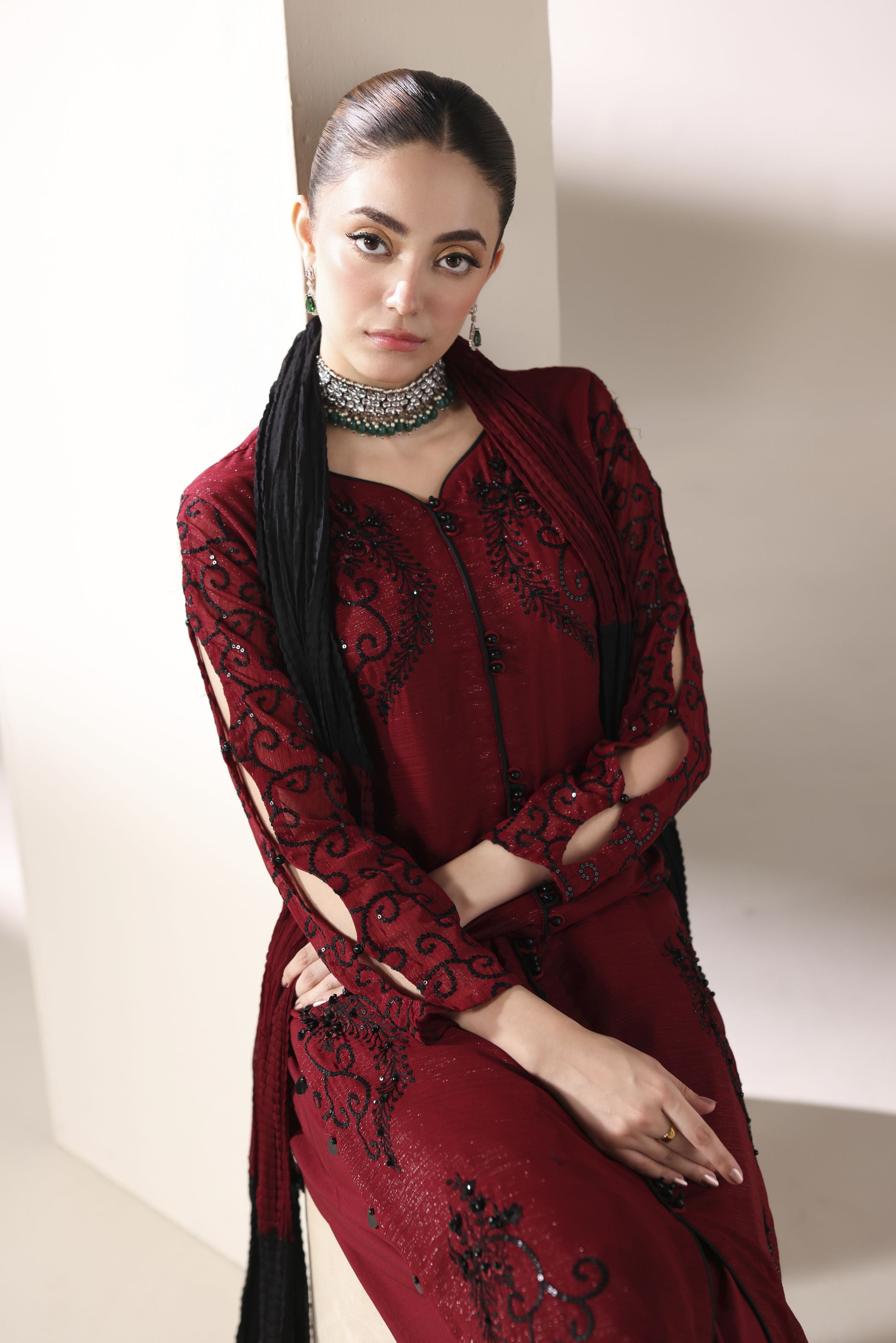 Starstruck by Ain – Crimson Zari Chiffon 3pc Dress with Tulip Shalwar