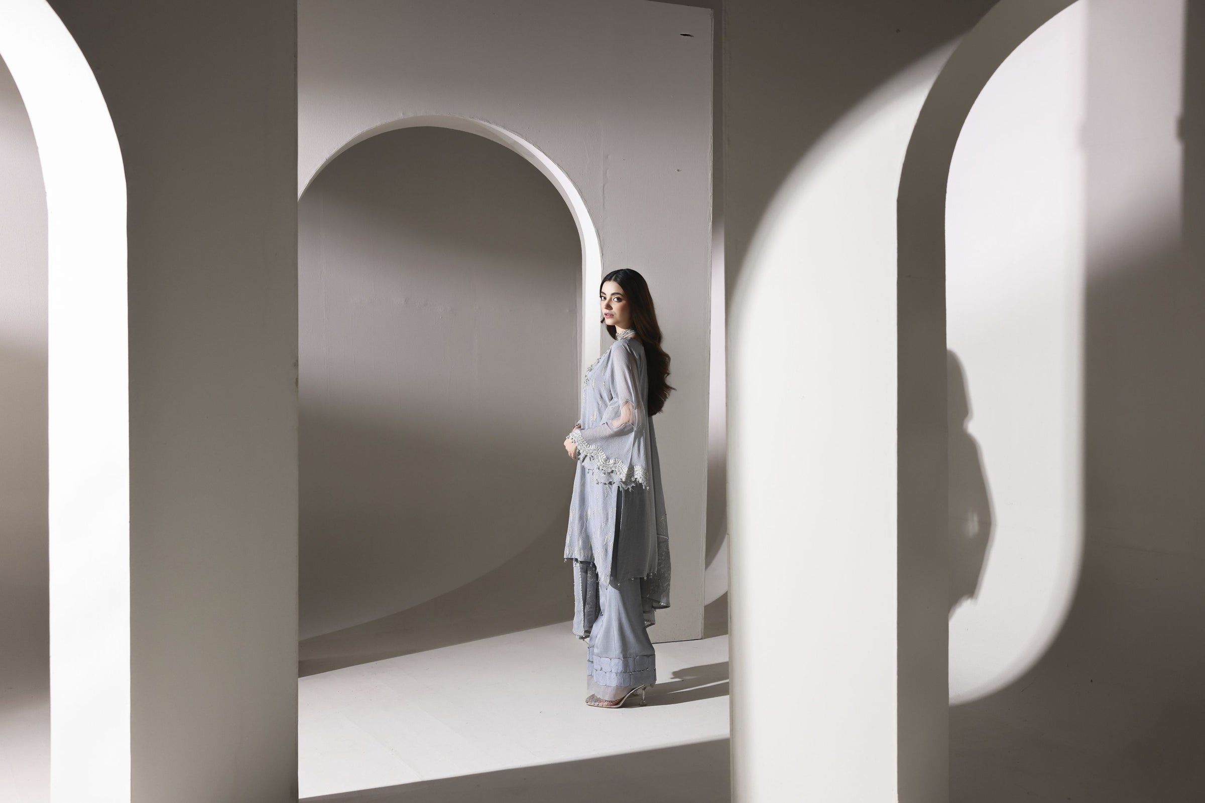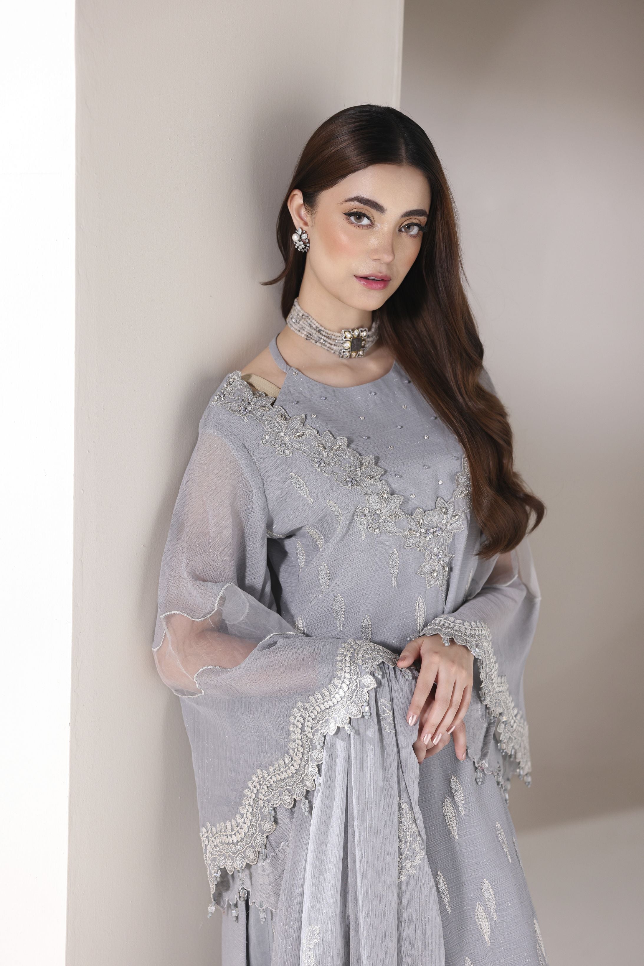 Starstruck by Ain – Silver Zari Chiffon 3pc Dress with Diamante Palazz