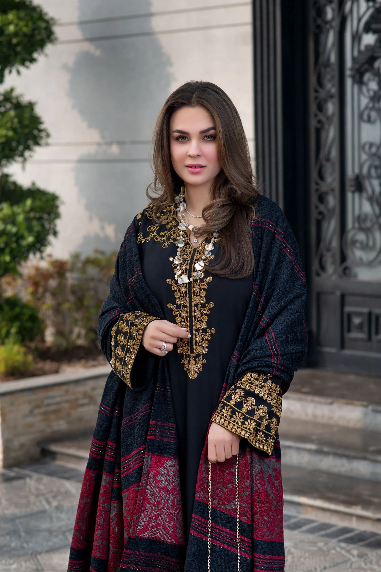 Paired with straight-leg matching trousers, the silhouette remains clean and structured, making it suitable for both day and evening wear. The outfit is completed with a velvet-thread jacquard winter shawl—a premium blend where jacquard weaving is enhanced with velvet thread detailing, adding depth, warmth, and a subtle sheen. This shawl elevates the ensemble and makes it ideal for colder weather and winter gatherings.