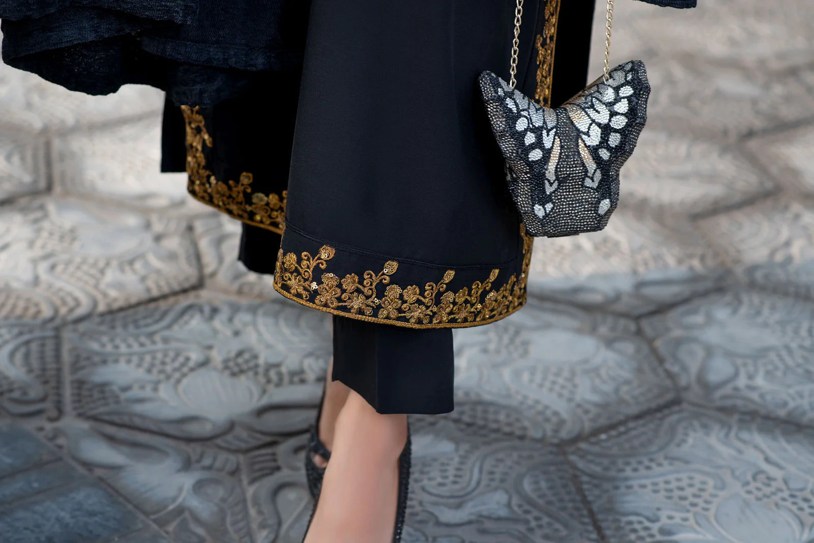 Bold, elegant, and winter-appropriate, ZW4 from the Zimal capsule is designed for women who favour classic black with statement detailing. The linen long shirt features rich embroidery that frames the neckline, sleeves, and hem, creating a refined look that feels dressy without being heavy.