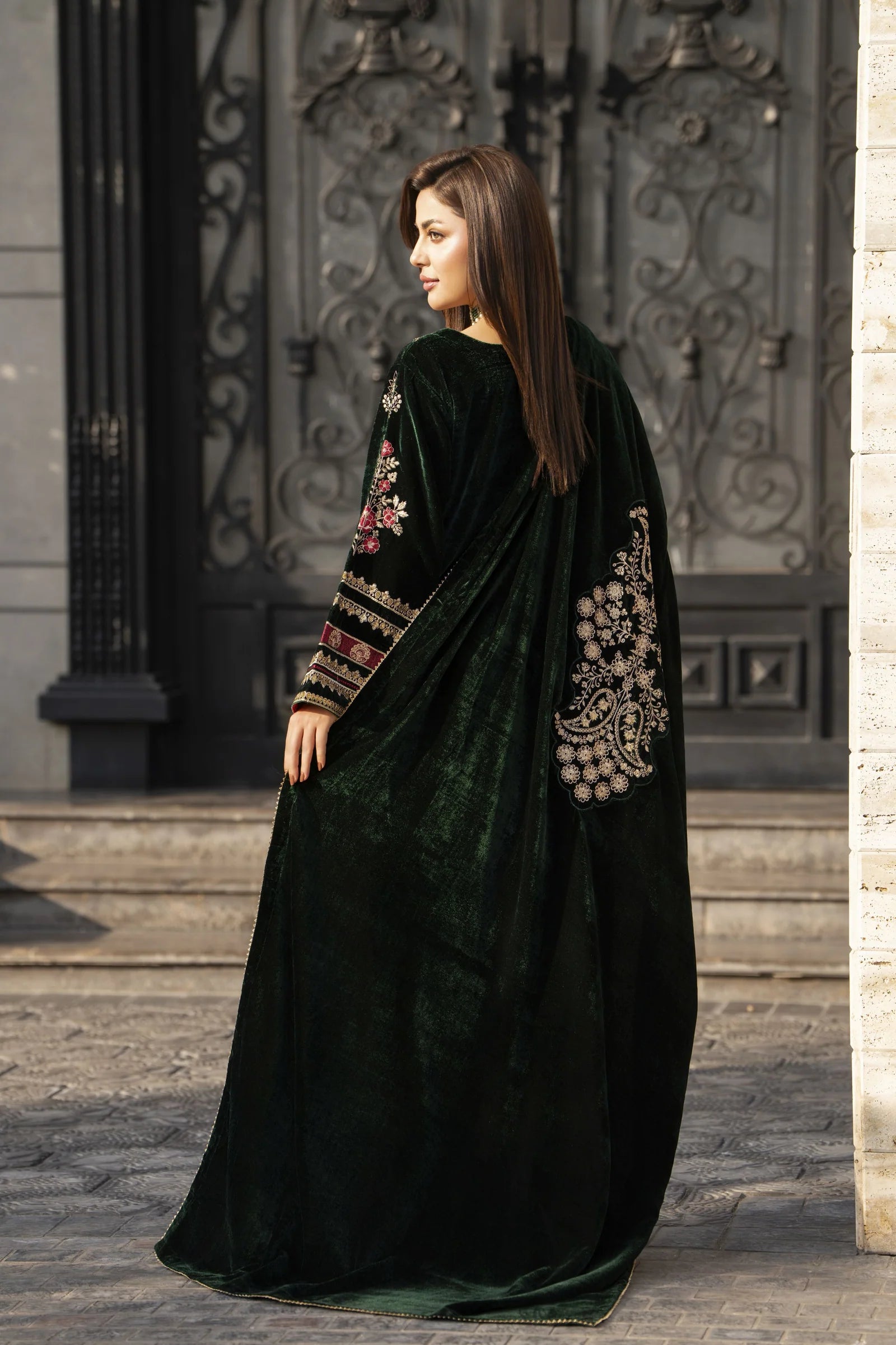 The embroidered velvet shirt features a shorter length, perfectly balanced with wide-leg embroidered velvet trousers for a dramatic and fashion-forward look. Completing the ensemble is a richly embroidered velvet shawl, adding warmth and a regal finishing touch.
