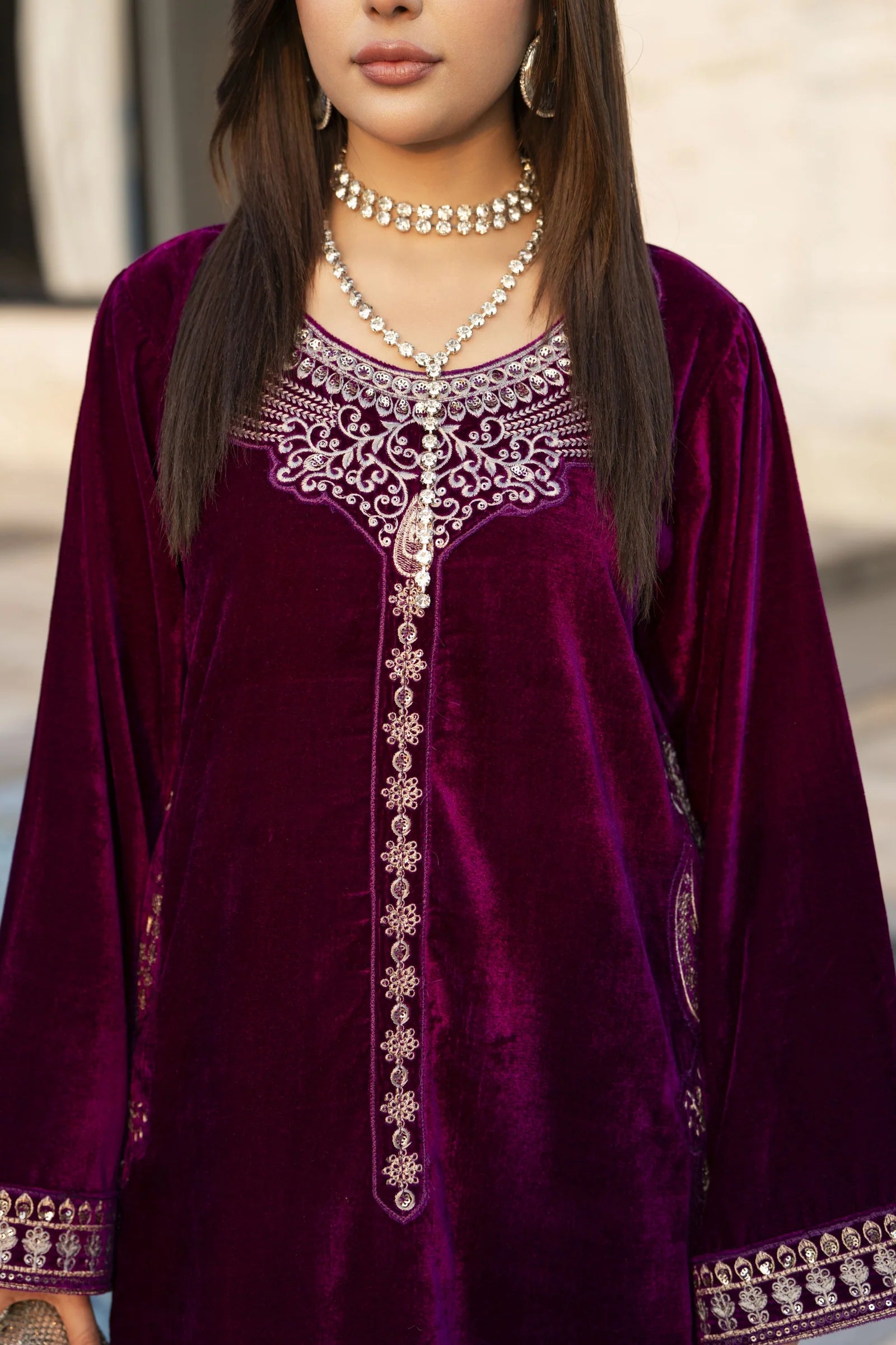 The embroidered long velvet shirt is paired with matching straight-leg trousers, creating a refined and flattering silhouette. Completing the ensemble is a beautifully embroidered velvet shawl, offering warmth while elevating the overall look with graceful sophistication.