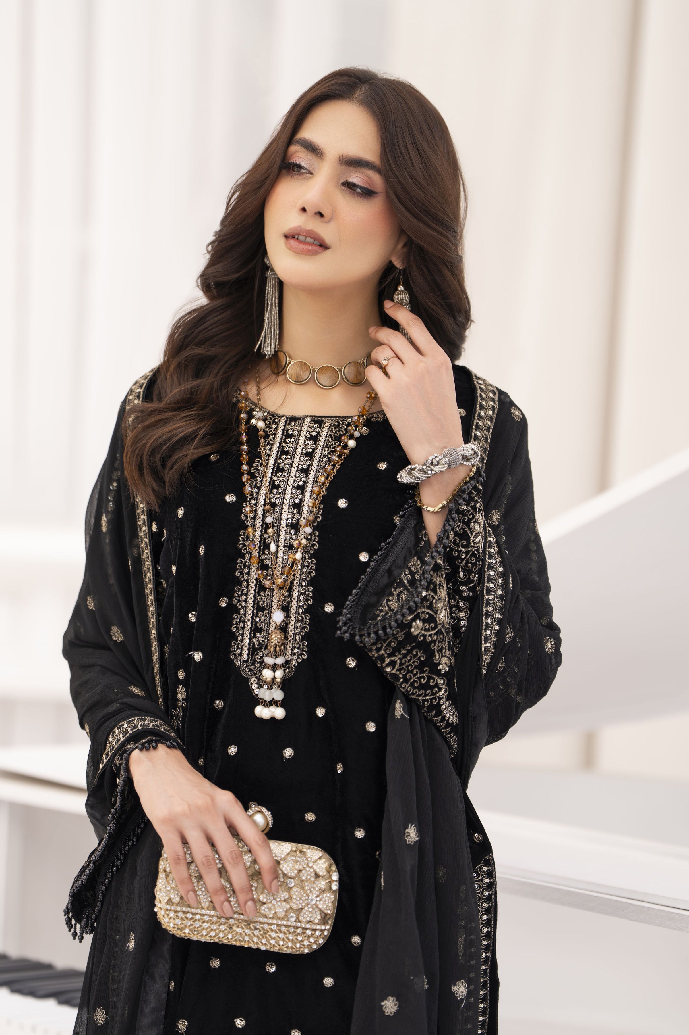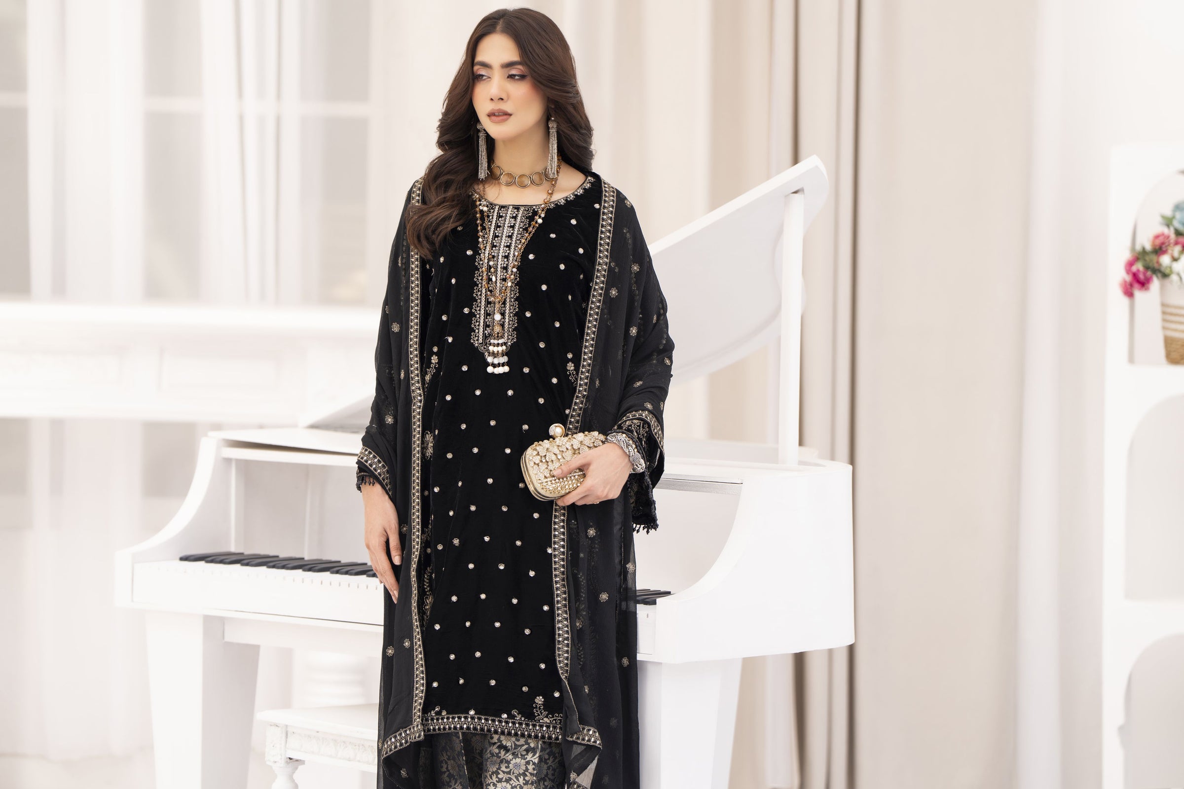 This striking black outfit from Makhmal by Gul Warun is crafted from rich 11000-micron velvet, giving it a deep, luxurious shine perfect for evening wear. The shirt is adorned with detailed thread and sequin embroidery, adding an elegant sparkle that feels festive yet refined. Instead of velvet trousers, this design is paired with straight-leg brocade (jamawar) trousers, which bring a beautiful contrast and a more traditional, dressy touch to the overall look. The outfit is completed with a soft embroidered chiffon dupatta, finished with four-side patti and delicate bindi embroidery scattered all around for a graceful, lightweight finish. Ideal for dinners, parties or formal winter gatherings, this 3-piece suit blends rich textures, timeless Pakistani craftsmanship and modern elegance effortlessly.
