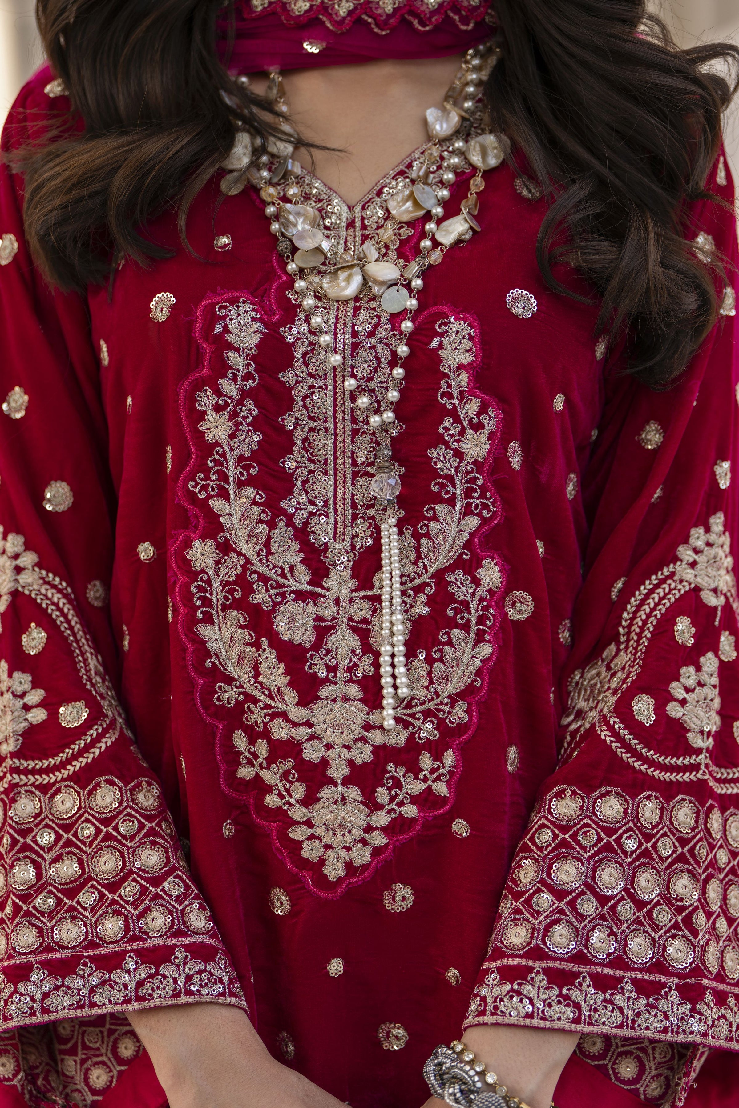This beautiful shocking pink velvet outfit from Makhmal by Gul Warun is designed to make a bold yet elegant statement. The vibrant colour stands out instantly, while the fine thread and sequin embroidery on the shirt adds a touch of festive sparkle without feeling heavy. The matching embroidered velvet straight trousers give the outfit a polished and coordinated finish. To complete the look, the suit comes with a lightweight embroidered net dupatta featuring delicate lace detailing that softens the richness of the velvet and brings a graceful flow to the outfit. Perfect for winter parties, dinners, and festive gatherings, this 3-piece suit offers comfort, glamour, and a beautifully modern take on traditional Pakistani fashion.