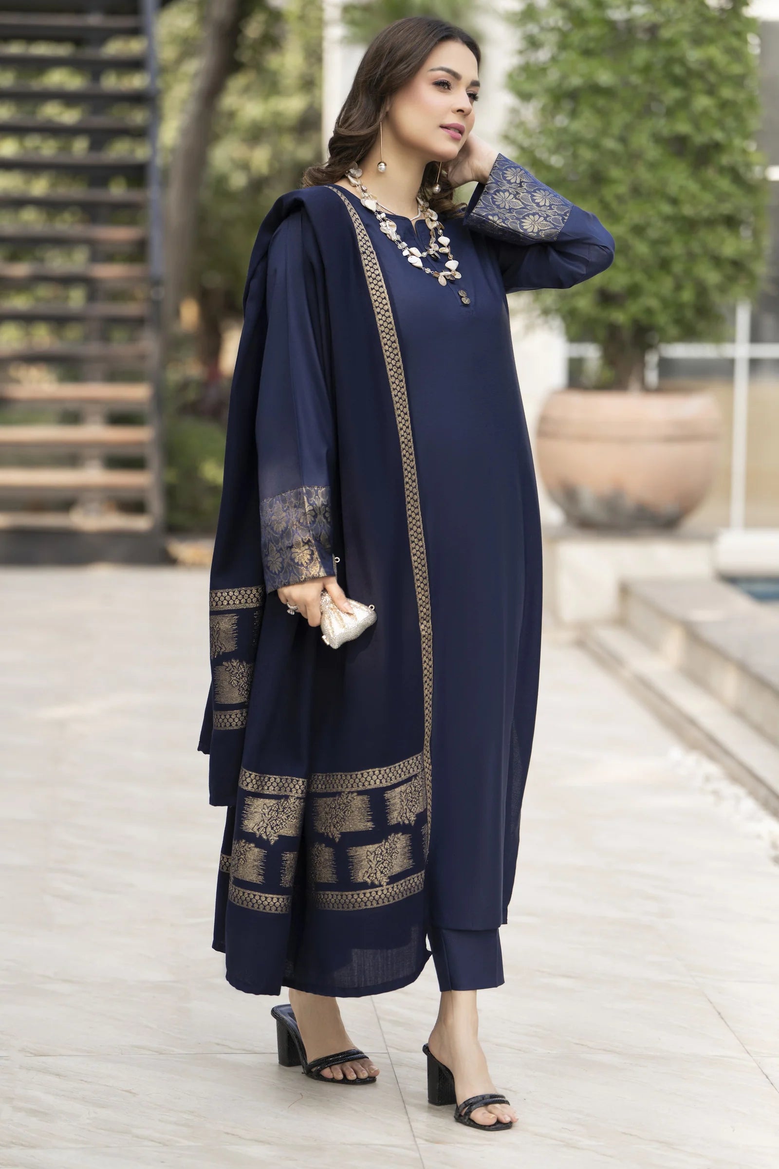 Graceful, timeless, and deeply refined — this 3-piece winter Dhanak outfit from the Sard Rang by Gul Warun Collection is a celebration of understated luxury. Rendered in a rich navy tone, the ensemble flows beautifully and offers an effortlessly poised winter look.
