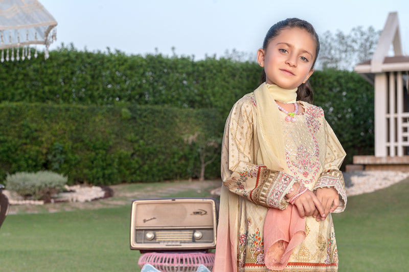 3pc ready to wear digital printed lawn embroidered shirt with handwork (adda work) detailing. Paired with chiffon dyed dupatta and cotton palazzo.