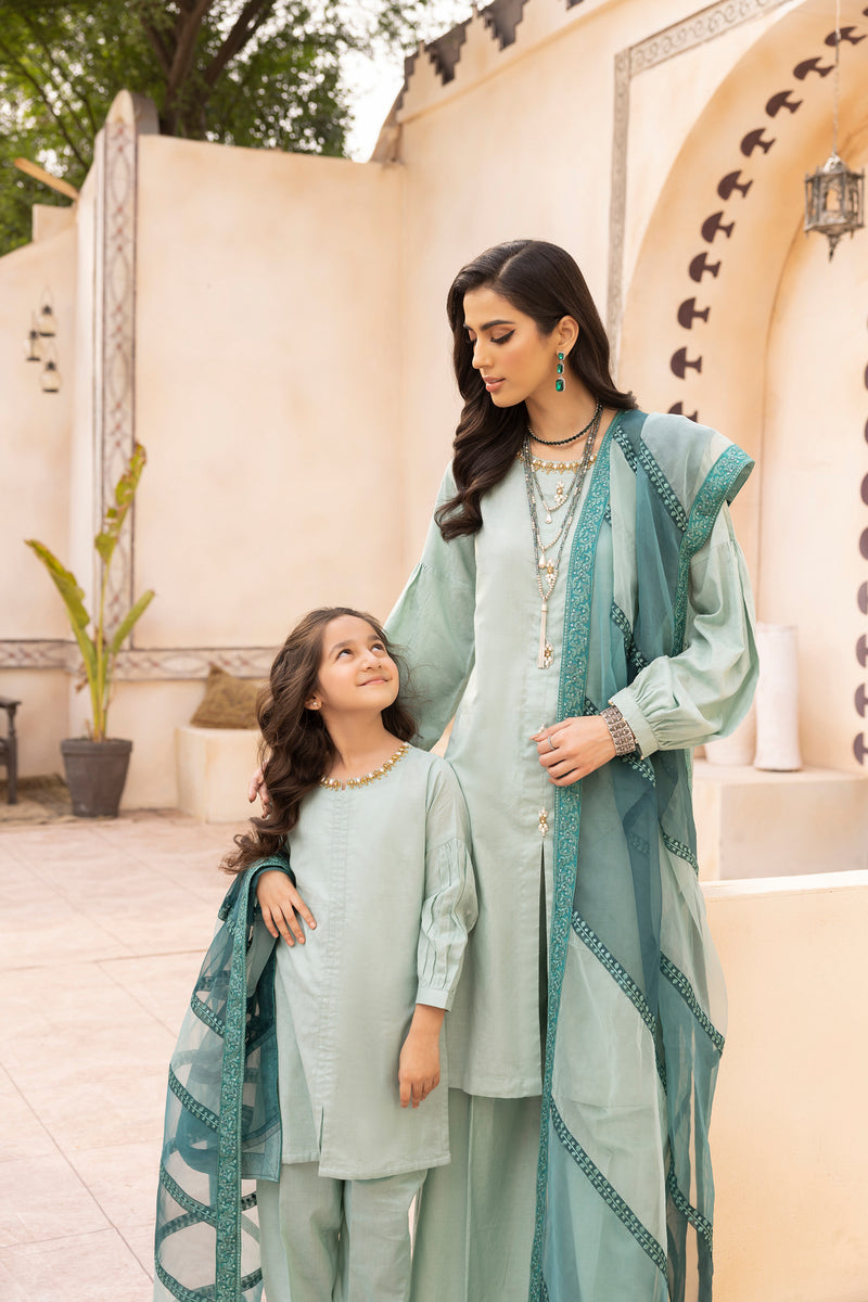 3pc Ready to Wear cotton self jacquard shirt enhanced with hand embellished neckline, cotton plazzo and organza embroidered dupatta.