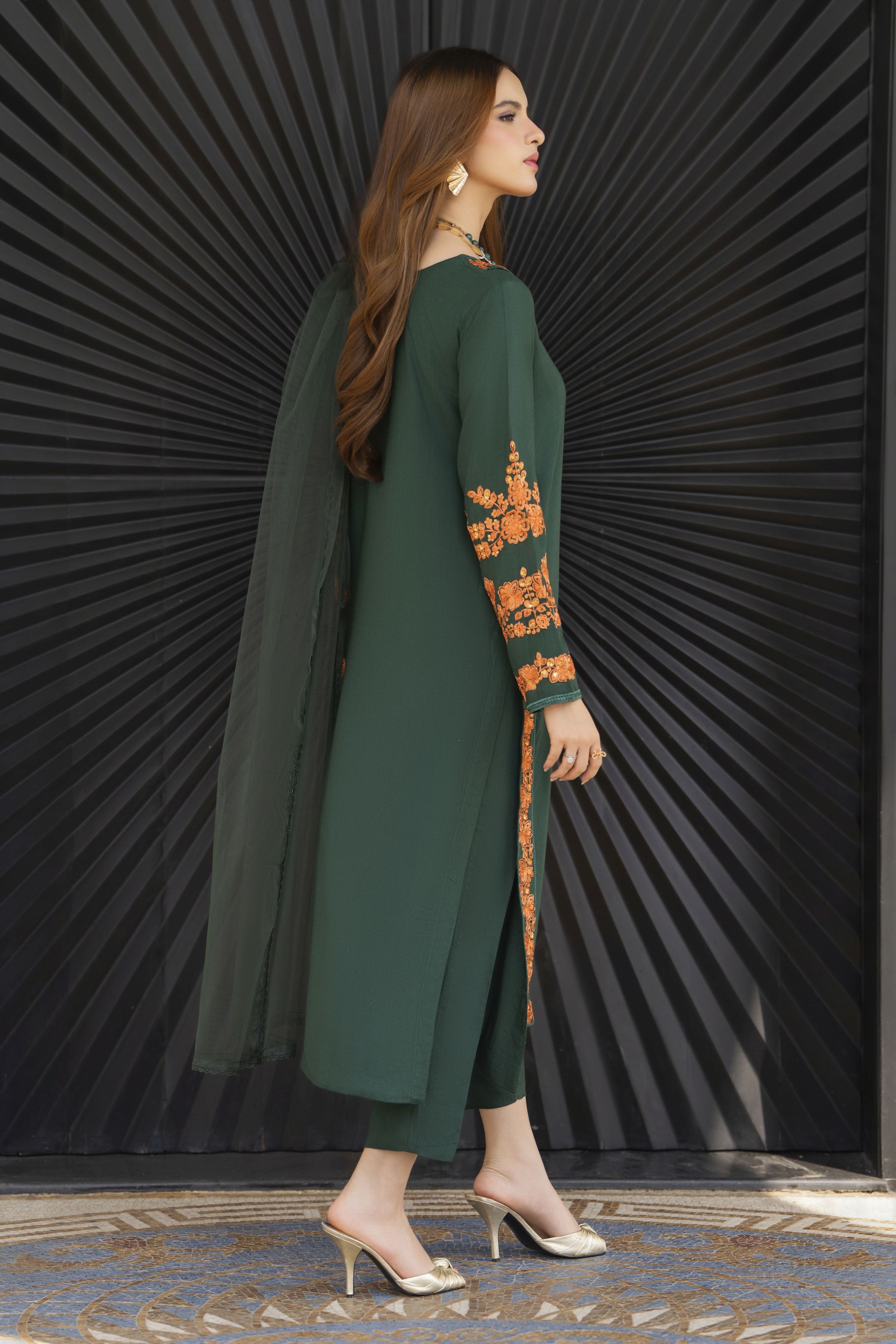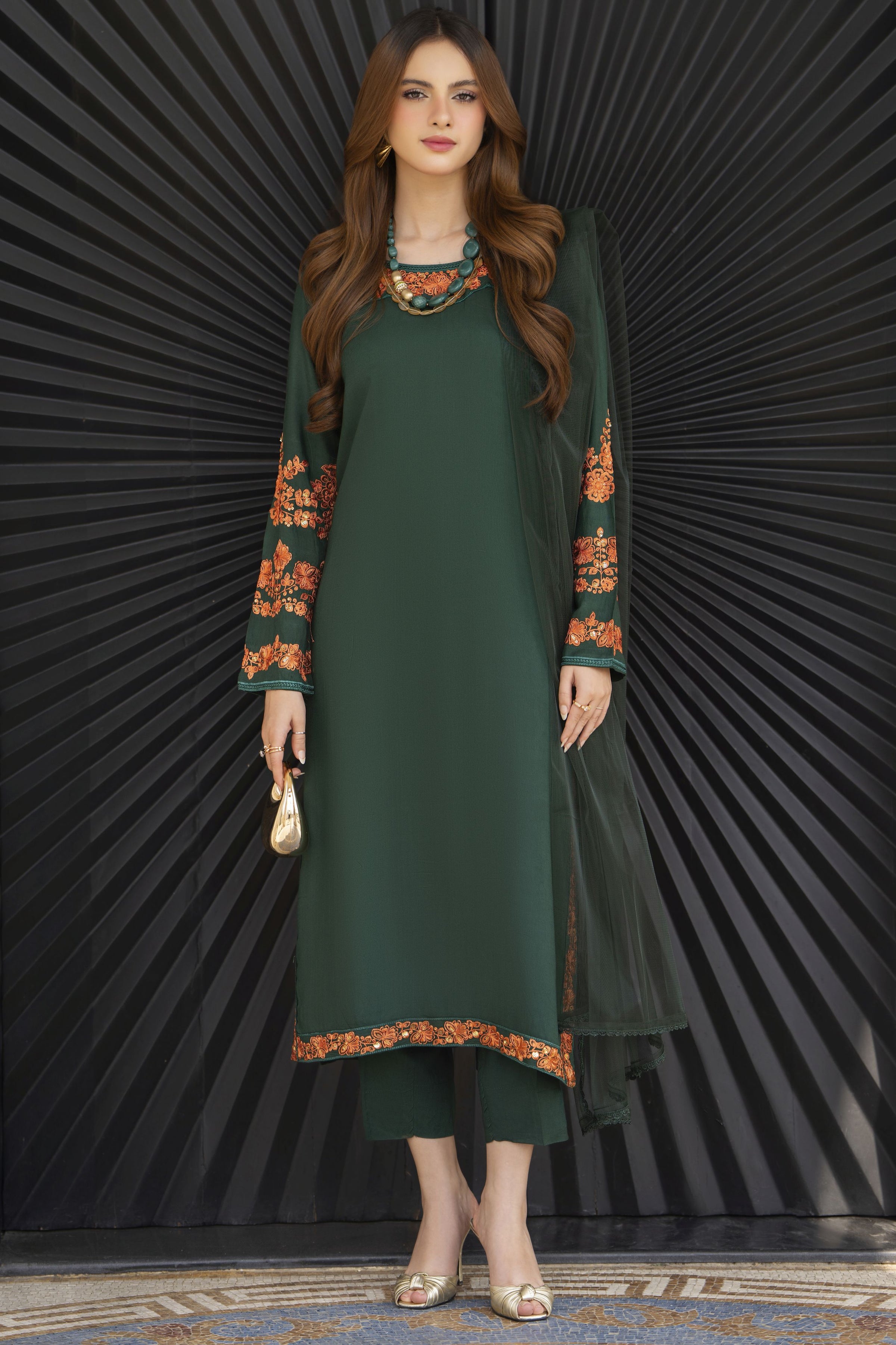 Exude timeless winter elegance with this 3-piece embroidered outfit from Linen Aura by Miski. Tailored from premium linen in a rich bottle green shade, this ensemble showcases exquisite orange floral embroidery along the neckline, sleeves, and hem, creating a striking yet graceful contrast. The long straight-cut shirt enhances the silhouette while ensuring warmth and comfort throughout the season. Paired with matching trousers and a net dupatta finished with lace detailing, this outfit reflects understated sophistication — perfect for evening dinners, get-togethers, or formal daywear.
