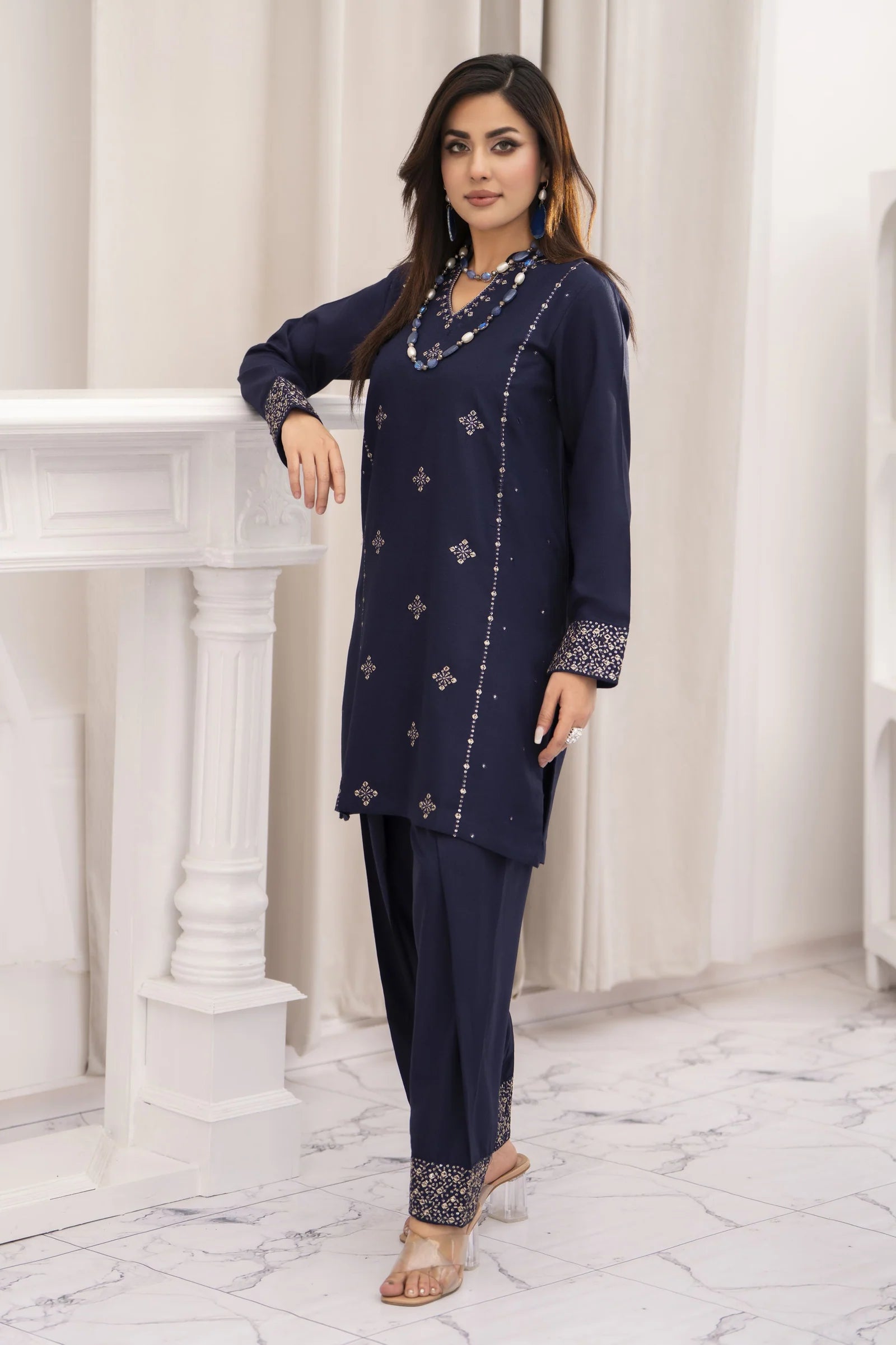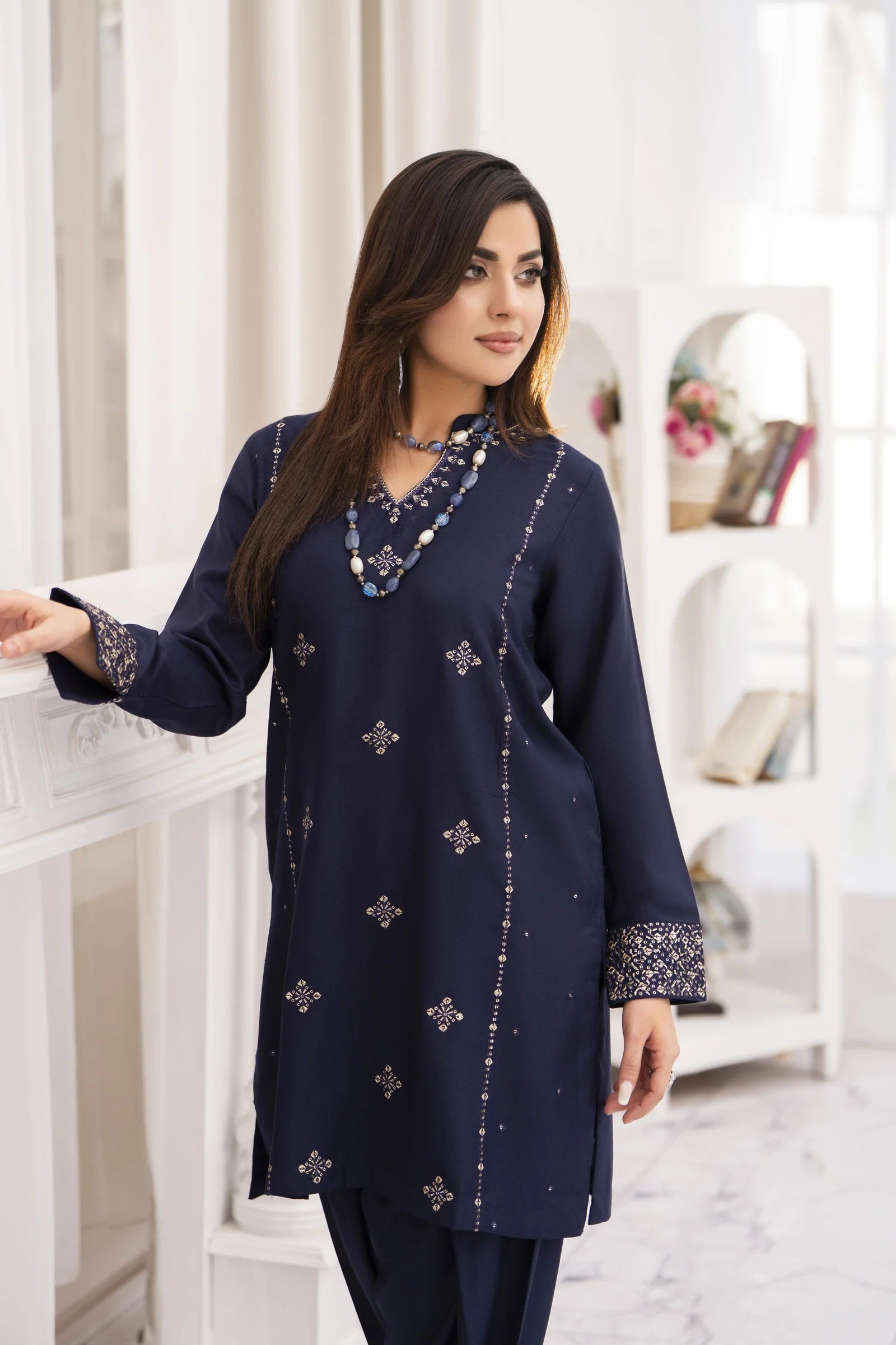 Refined, effortless, and winter-perfect—this navy 2-piece dhanak set from FrostFit by Miski delivers a beautifully balanced look of comfort and elegance. The shirt features delicate scattered embroidery paired with embellished panel-style detailing, giving it a subtle yet premium finish.
