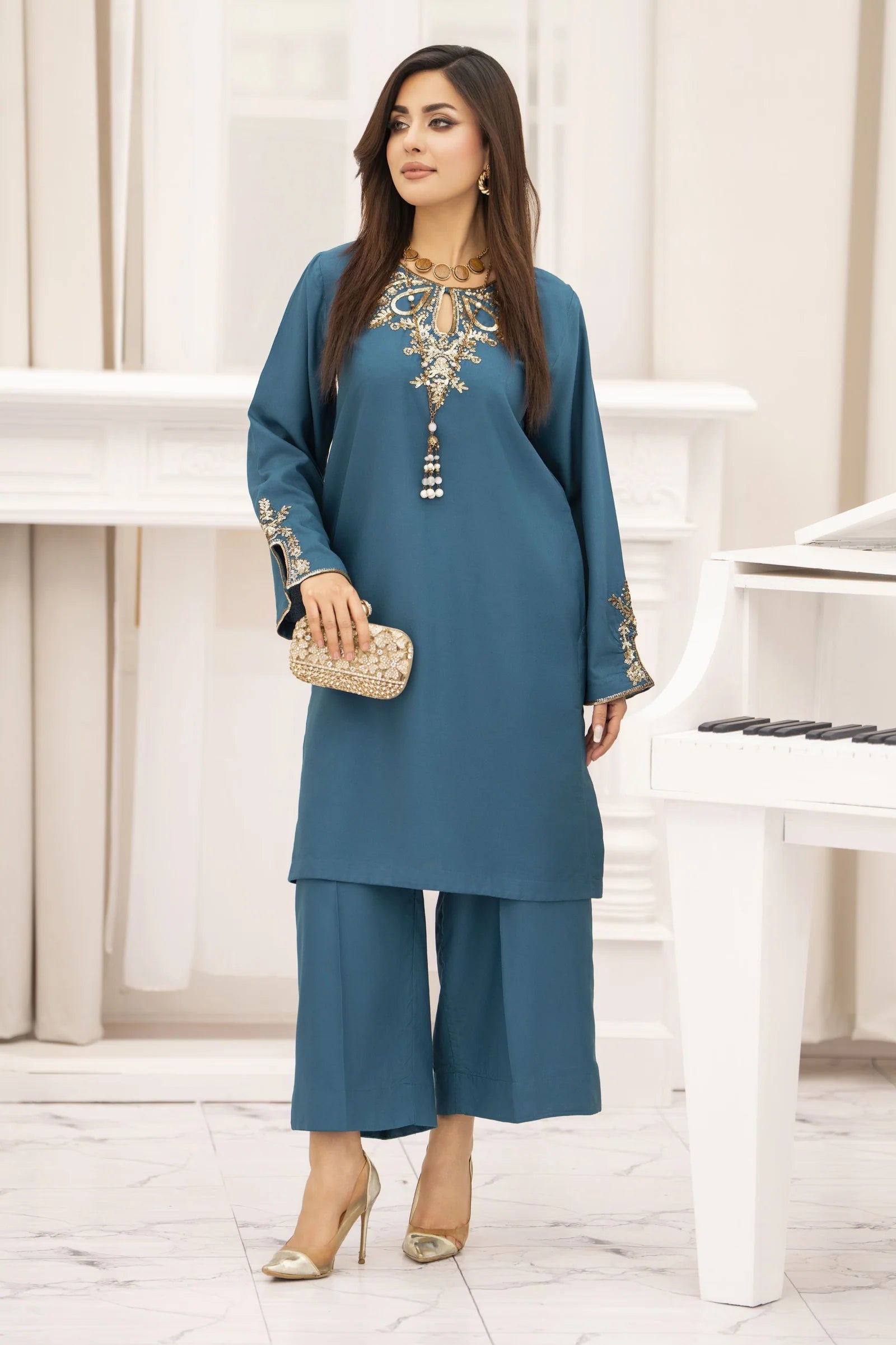 A refined winter look with a rich designer feel—this teal 2-piece dhanak set from FrostFit by Miski brings elegance and warmth together effortlessly. The shirt features stunning gold and thread embroidery around the neckline and sleeves, creating a luxurious festive touch without being overly heavy.