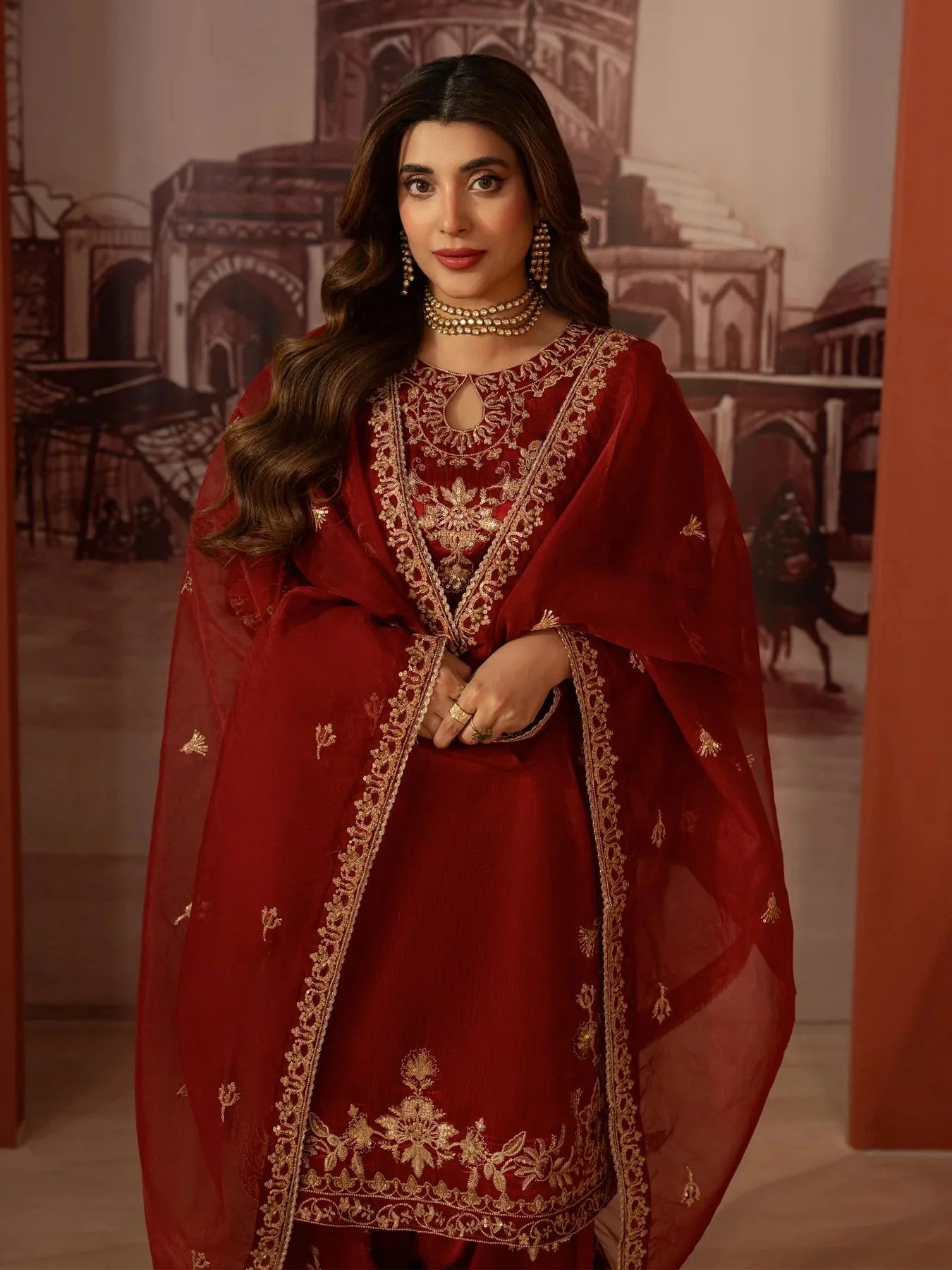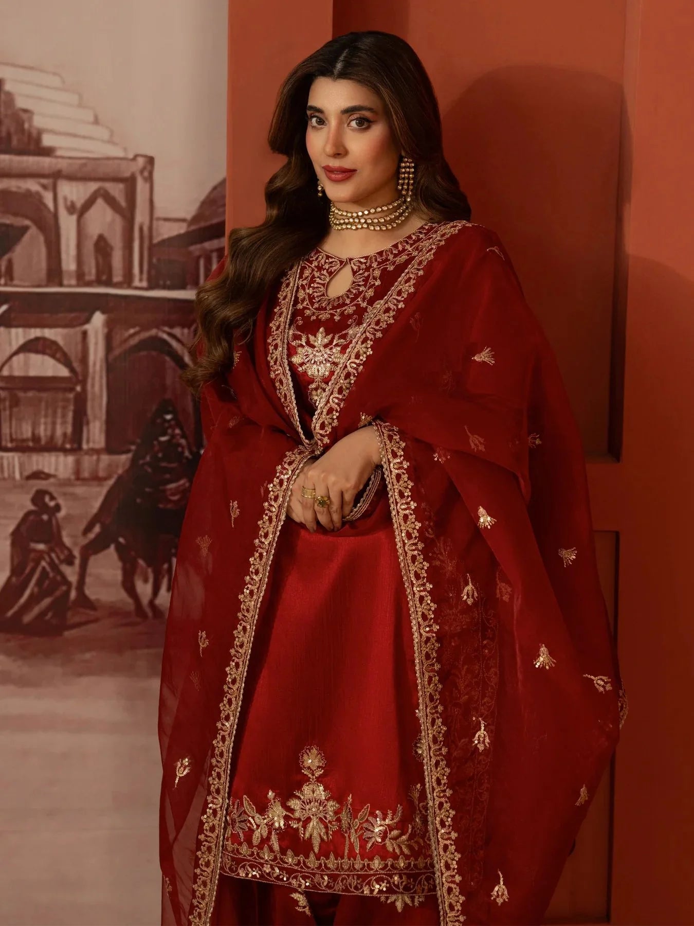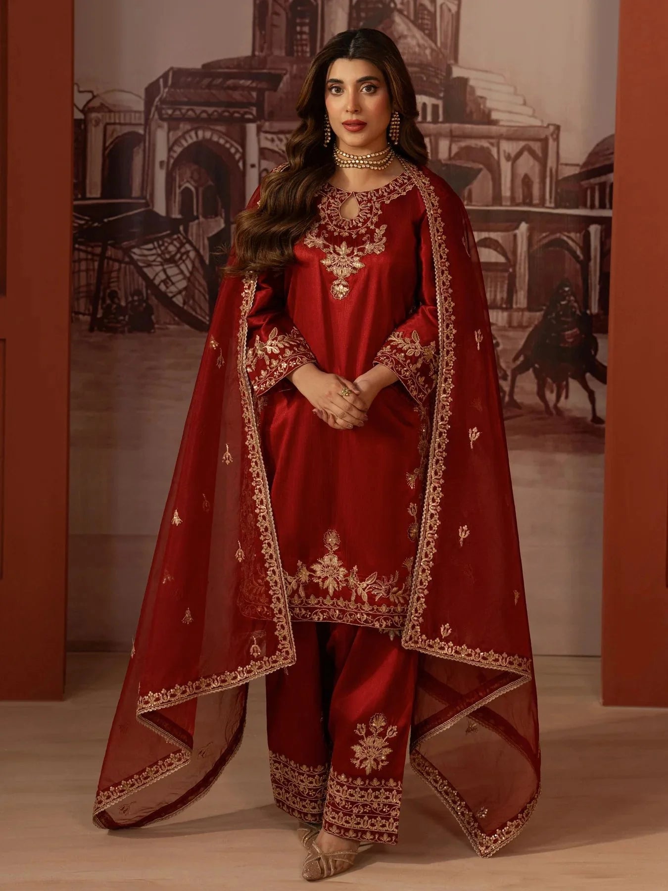 An elegant embroidered organza dupatta completes the look, adding softness, movement, and delicate detailing that perfectly balances the richness of the raw silk outfit.