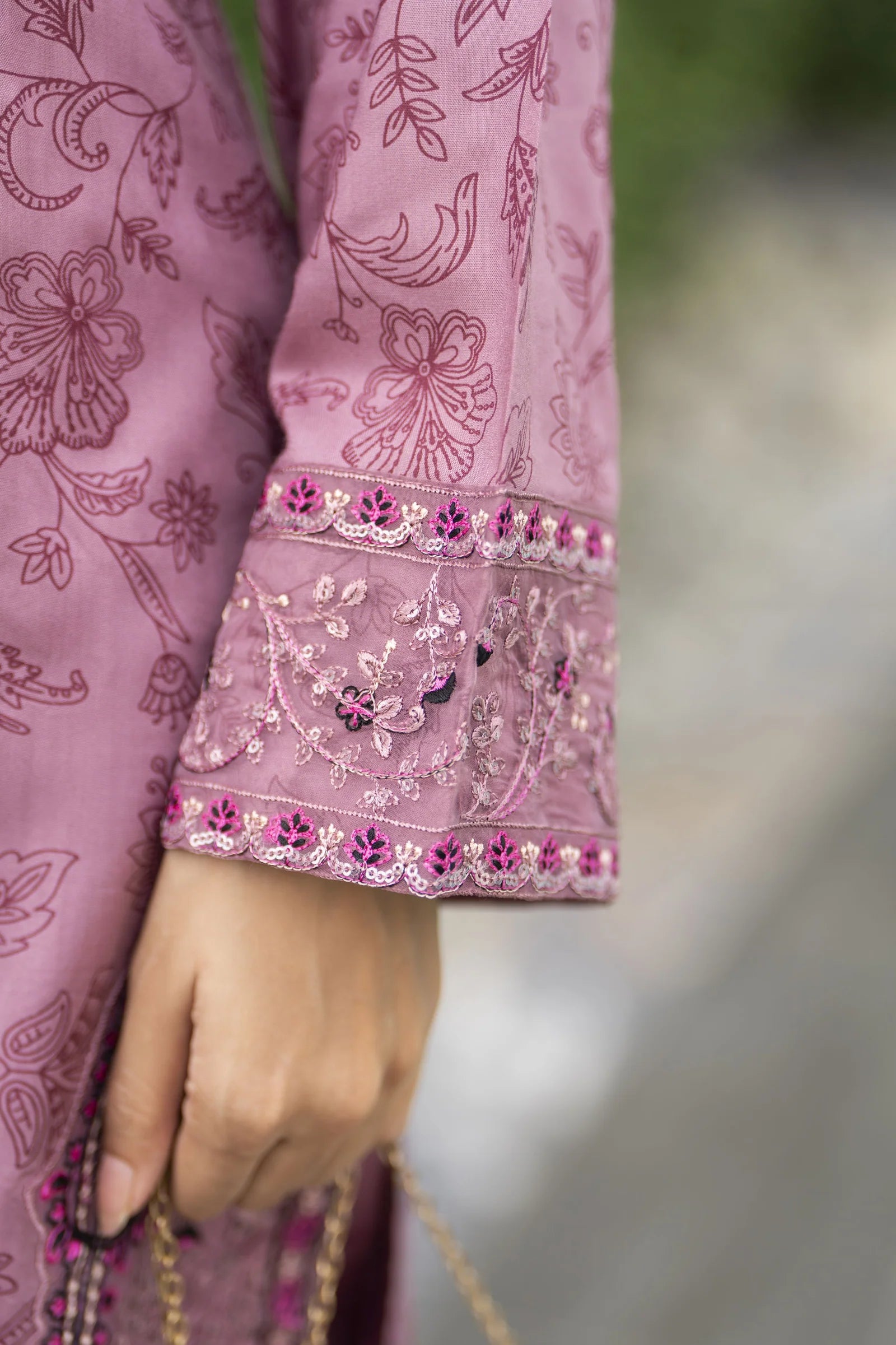 A soft winter look with a touch of elegance, this 2-piece linen suit features a beautifully printed base enriched with delicate thread embroidery along the neckline, sleeves, and hem. The subtle floral pattern is complemented by deeper embroidered accents, adding dimension and charm without overpowering the outfit. The wide-leg printed trousers complete the coordinated silhouette, making this a graceful yet comfortable choice for casual winter wear, lunches, and relaxed gatherings.