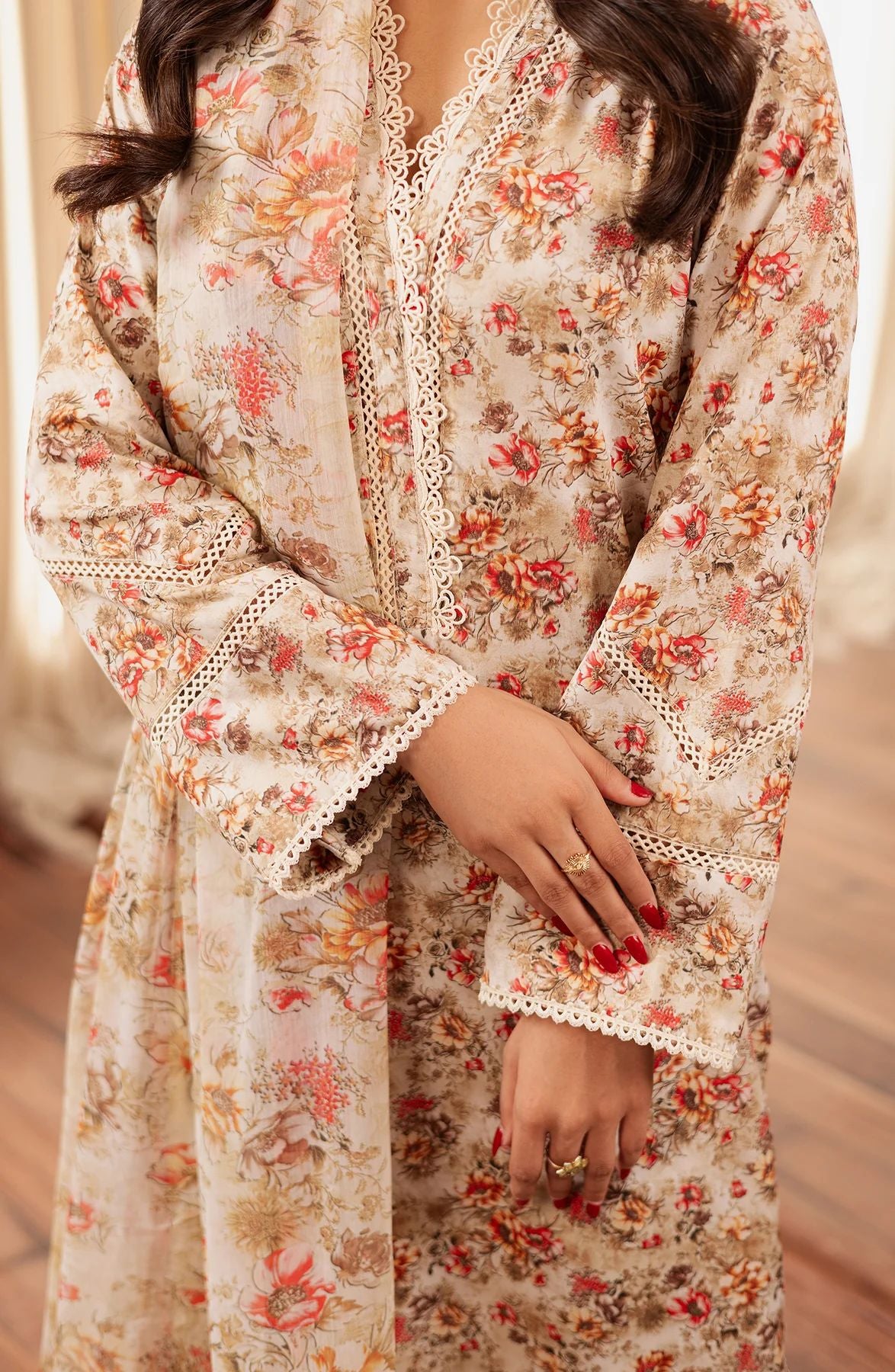 3pc ready to wear poly cambric printed shirt with lace detailing and matching trousers. Comes with printed chiffon dupatta.