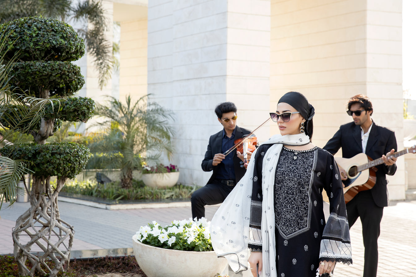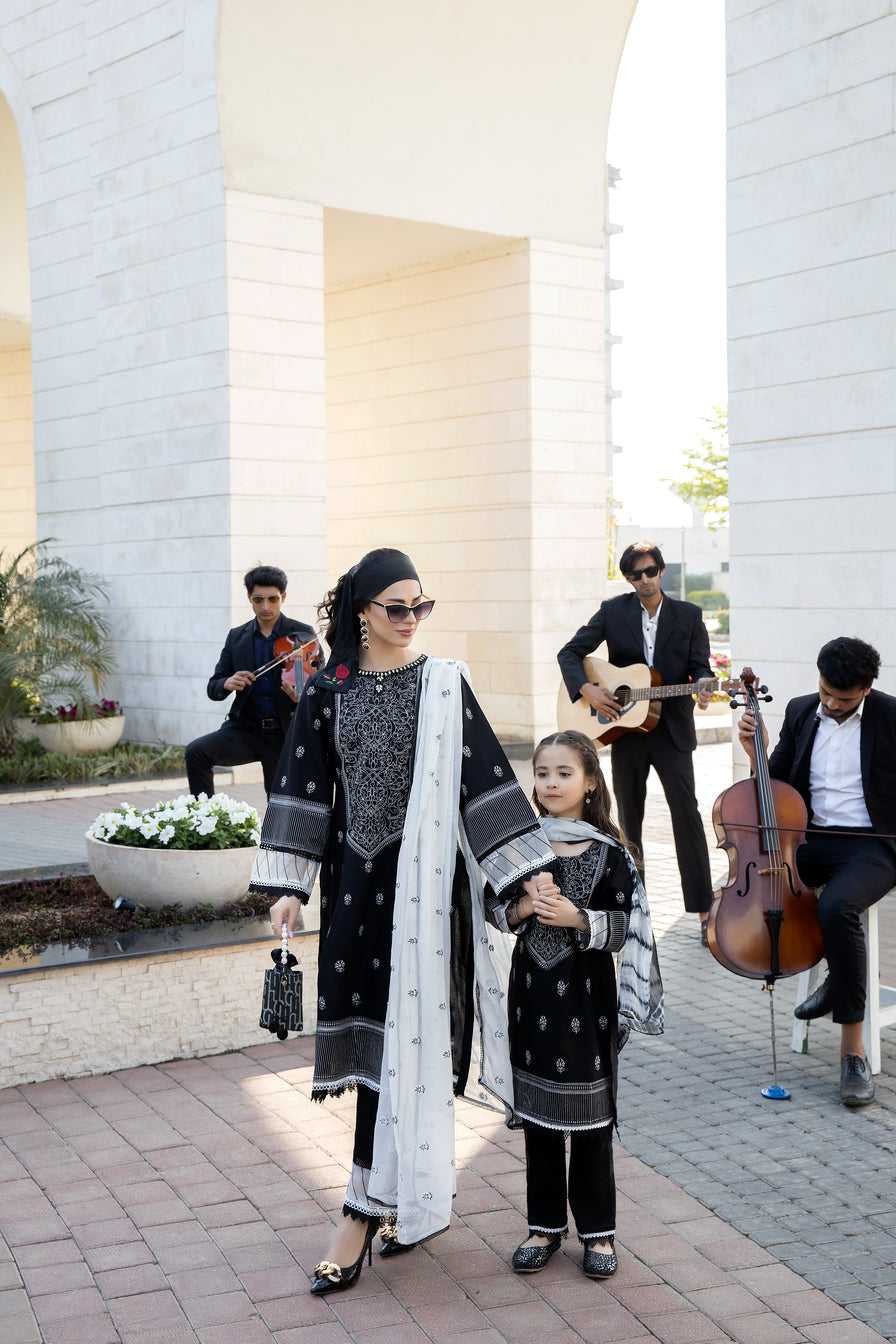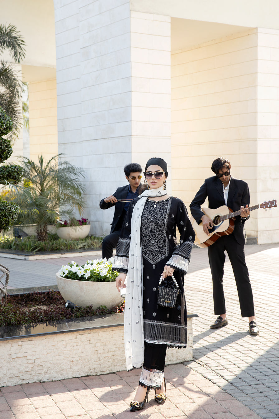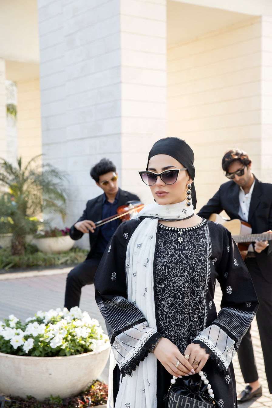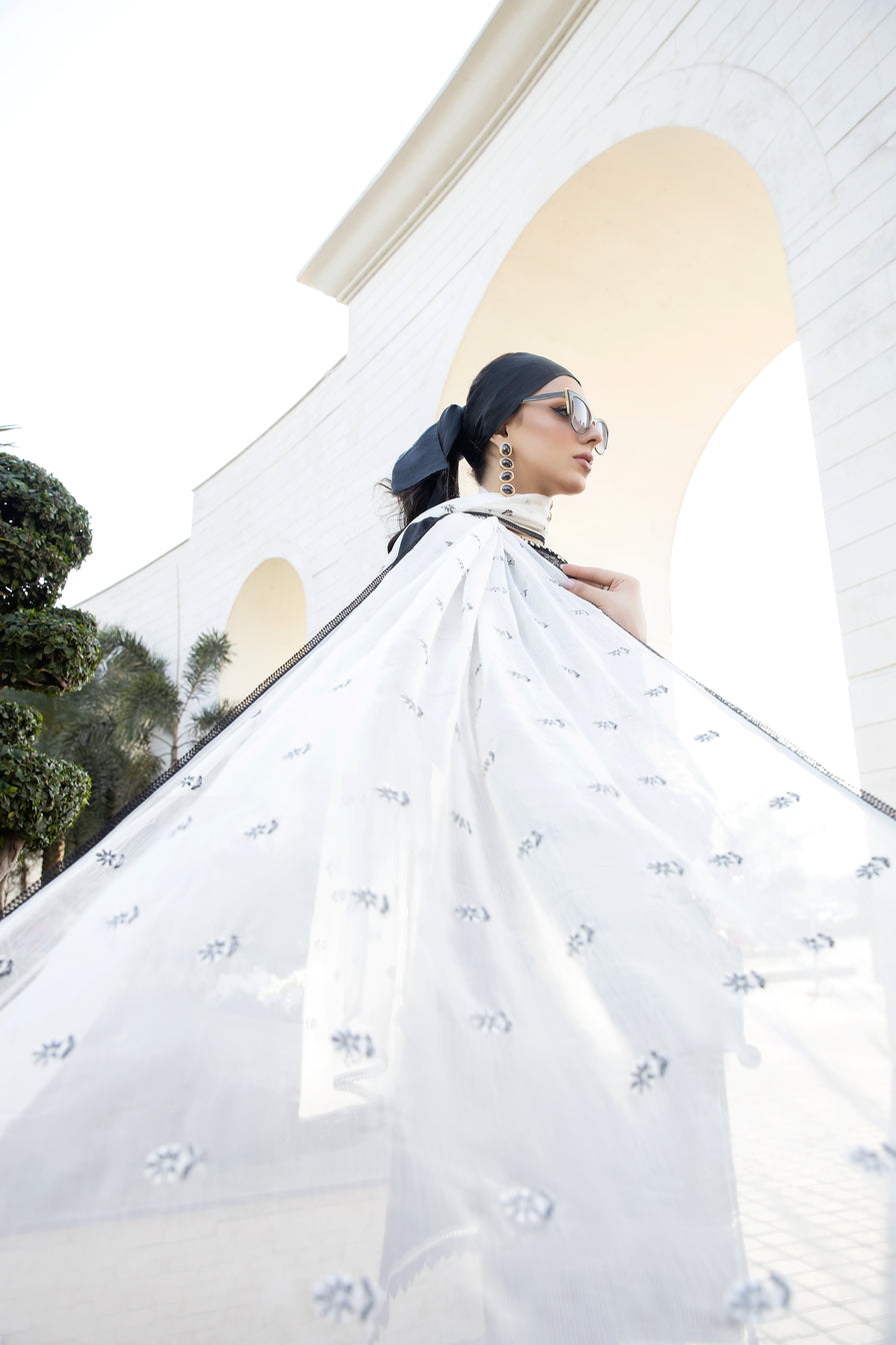 3pc ready to wear cotton embroidered shirt with hand embellishments and cotton trousers paired with chiffon embroidered dupatta.
