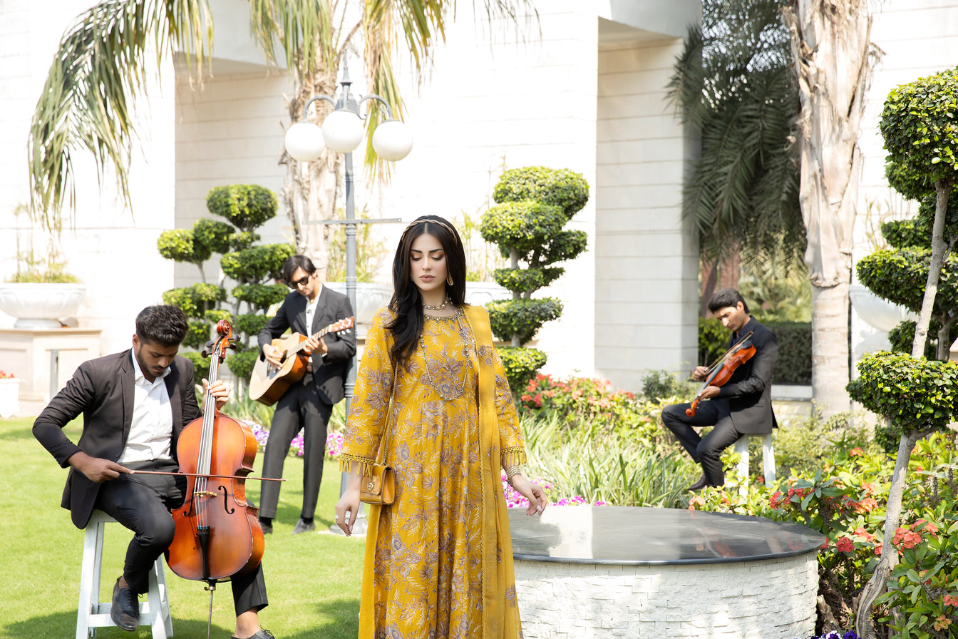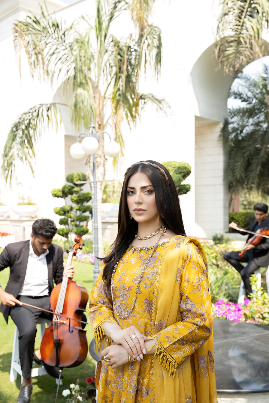 3pc ready to wear cotton embroidered maxi with hand embellishments and cotton trousers paired with chiffon embroidered dupatta.