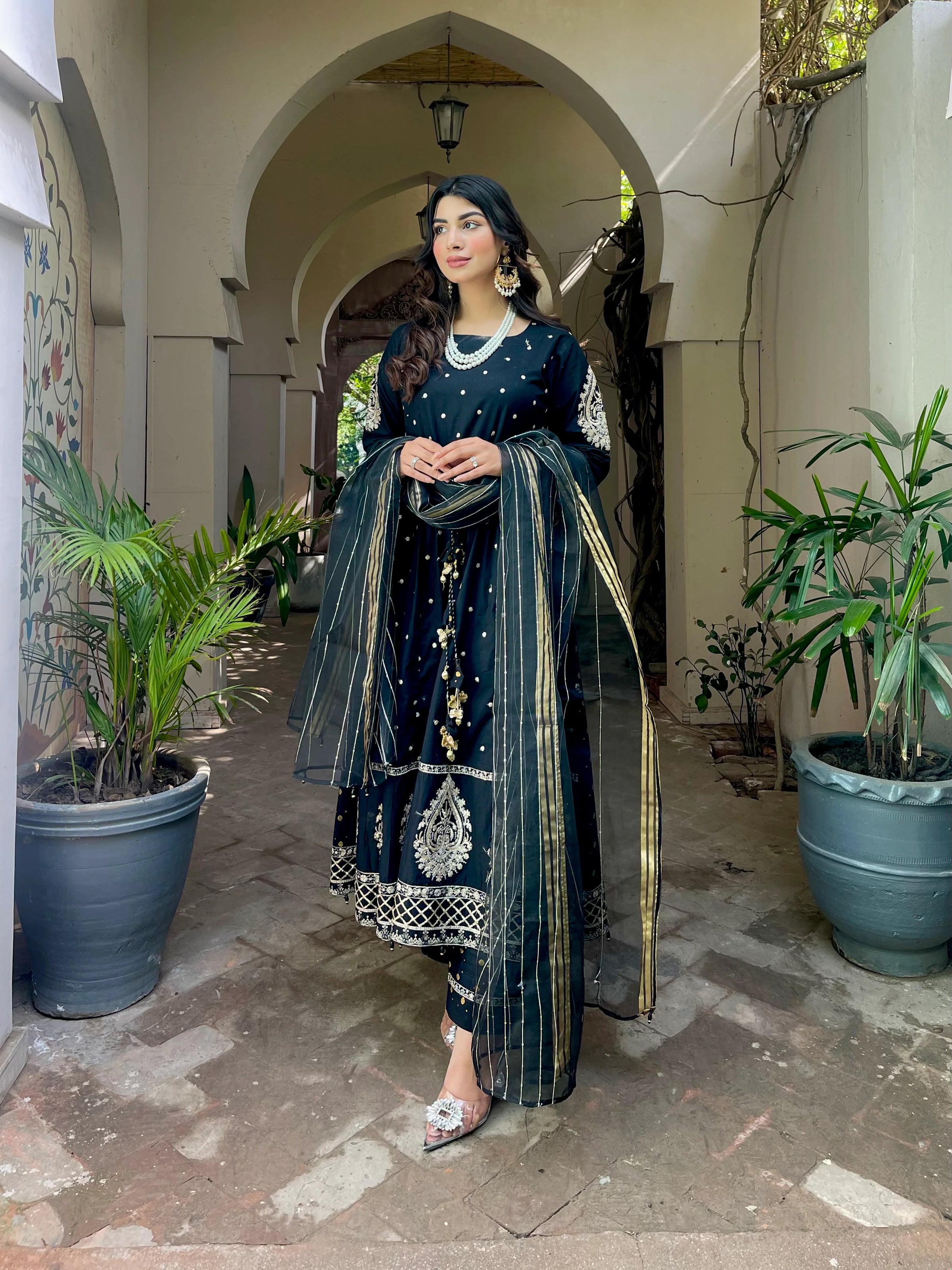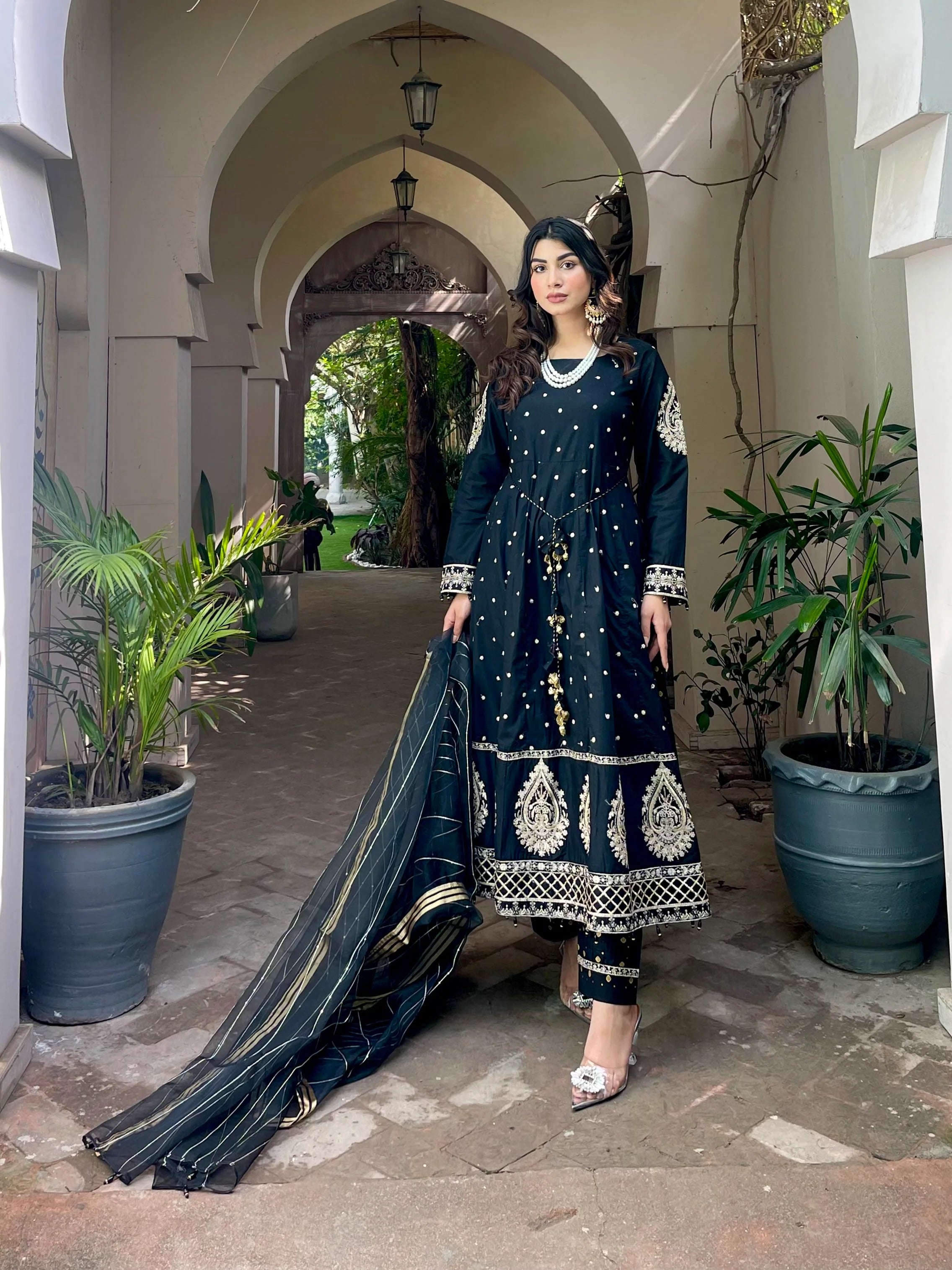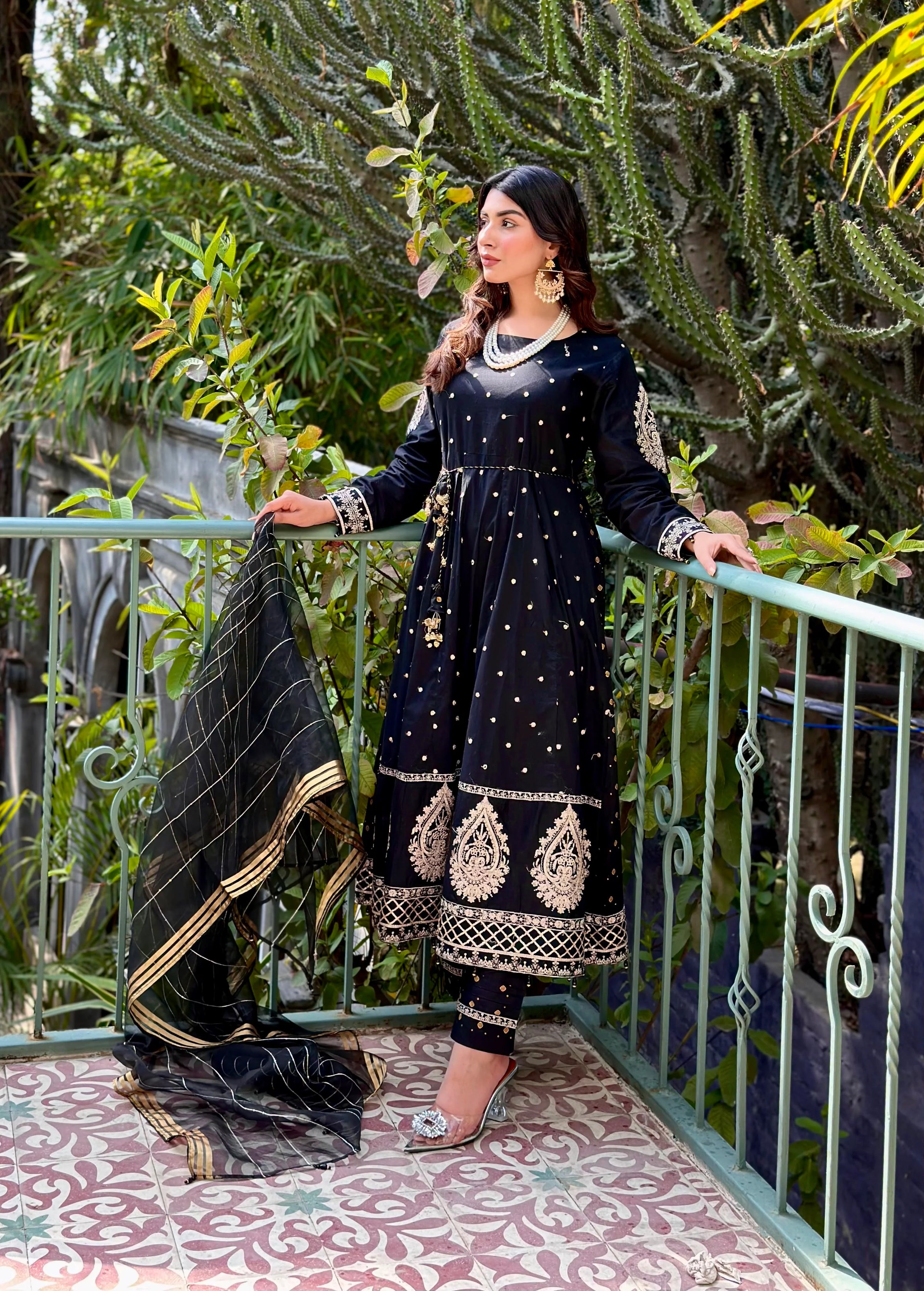 3pc Ready to Wear cotton embroidered long black frock with cotton embroidered trousers and organza embroidered kalli dupatta.