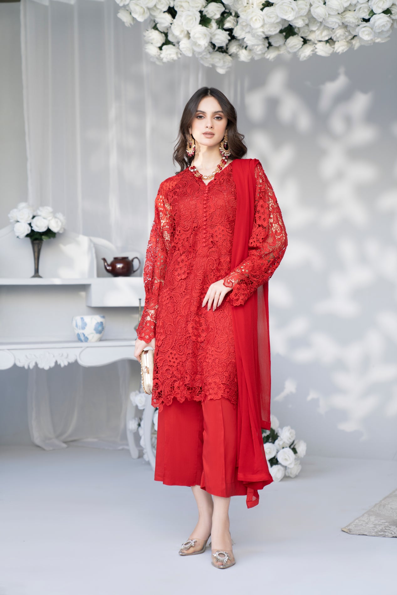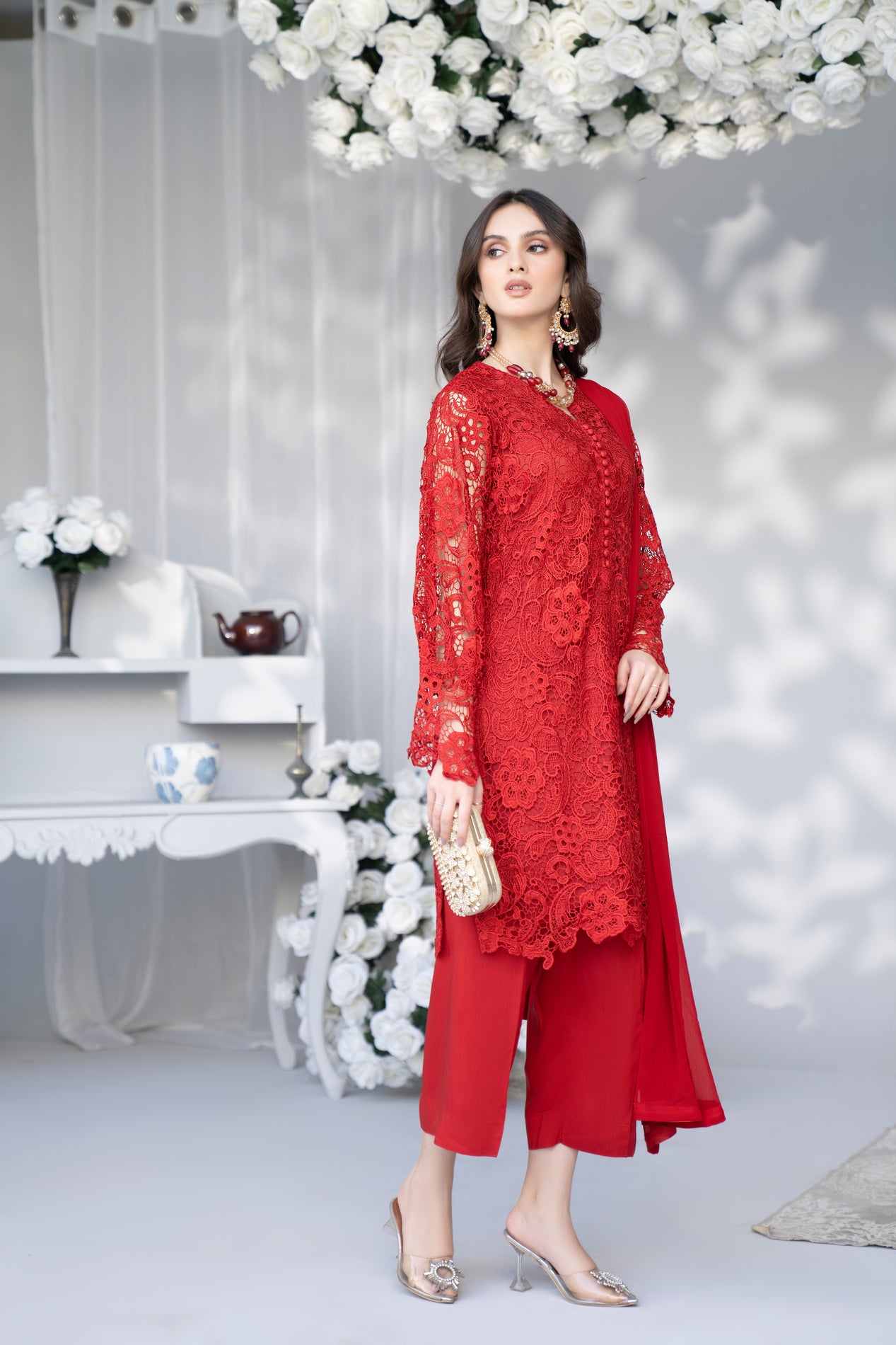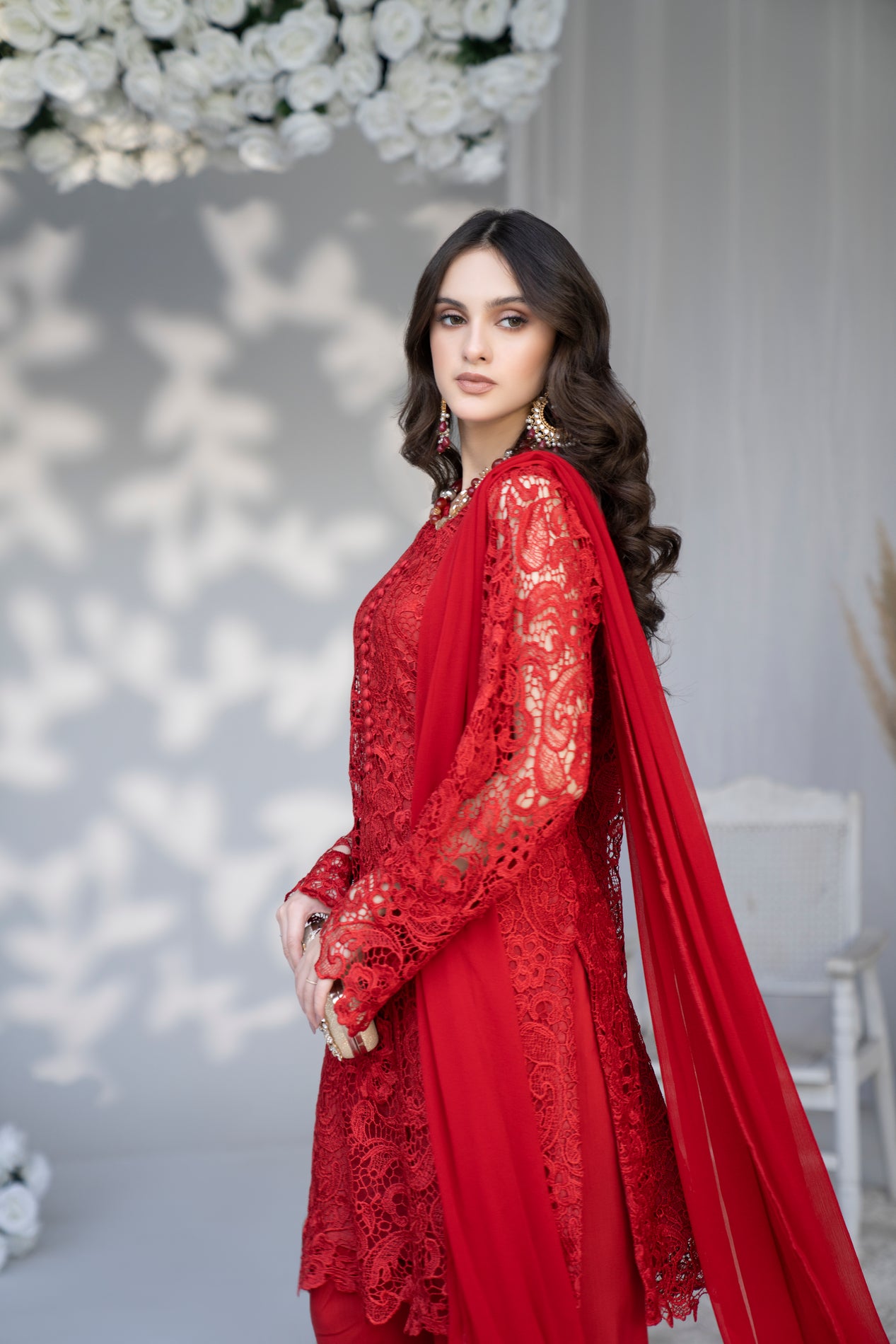 Gul Warun Eid Collection 3pc Ready to Wear Crochet shirt with resham cotton slip and raw silk trousers. Comes with chiffon dupatta.