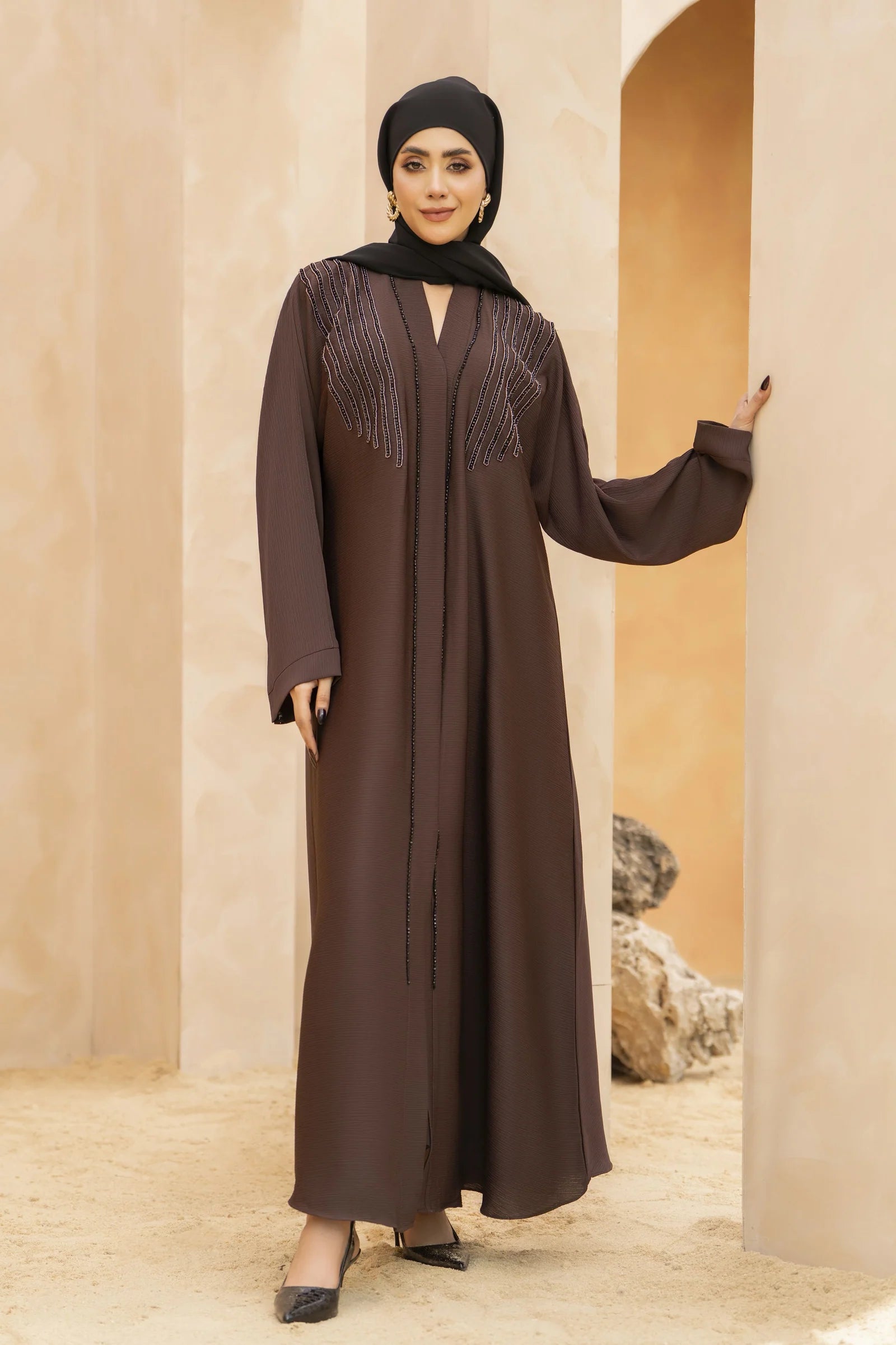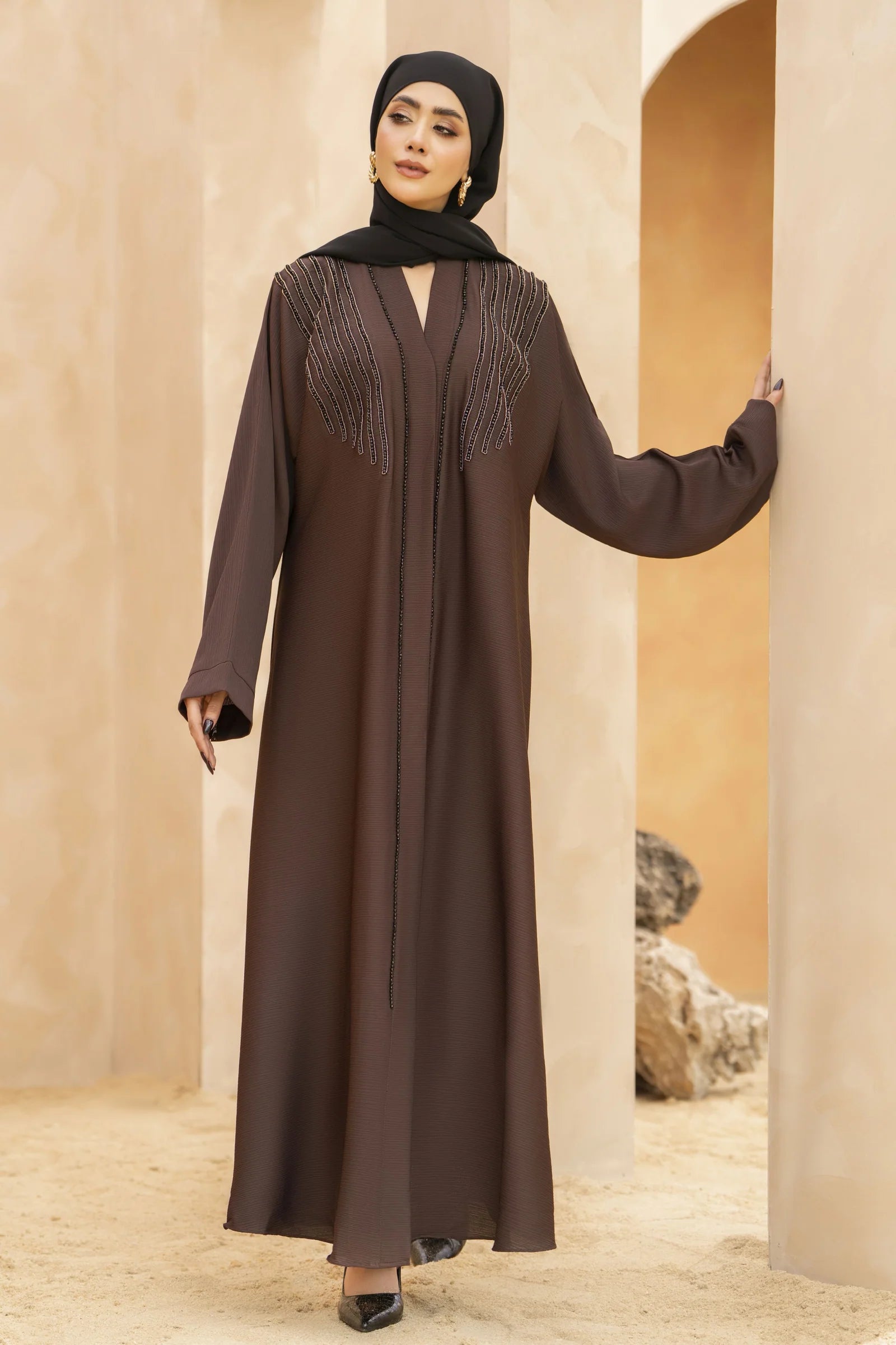 The rich cocoa brown tone brings warmth and sophistication, making it an excellent choice for Eid celebrations, formal gatherings, and elegant day wear. Designed with a flowing silhouette, this abaya offers comfort while maintaining a polished, modest look.